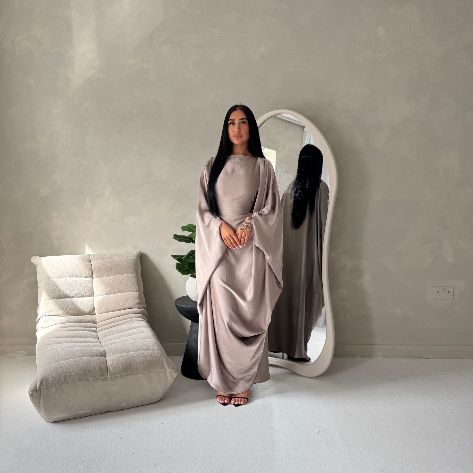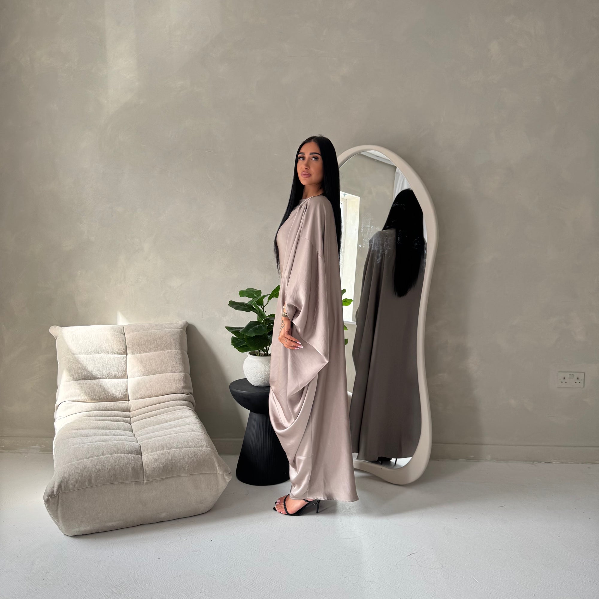 Sahra Wine Satin Shoulder Gather Kaftan Dress