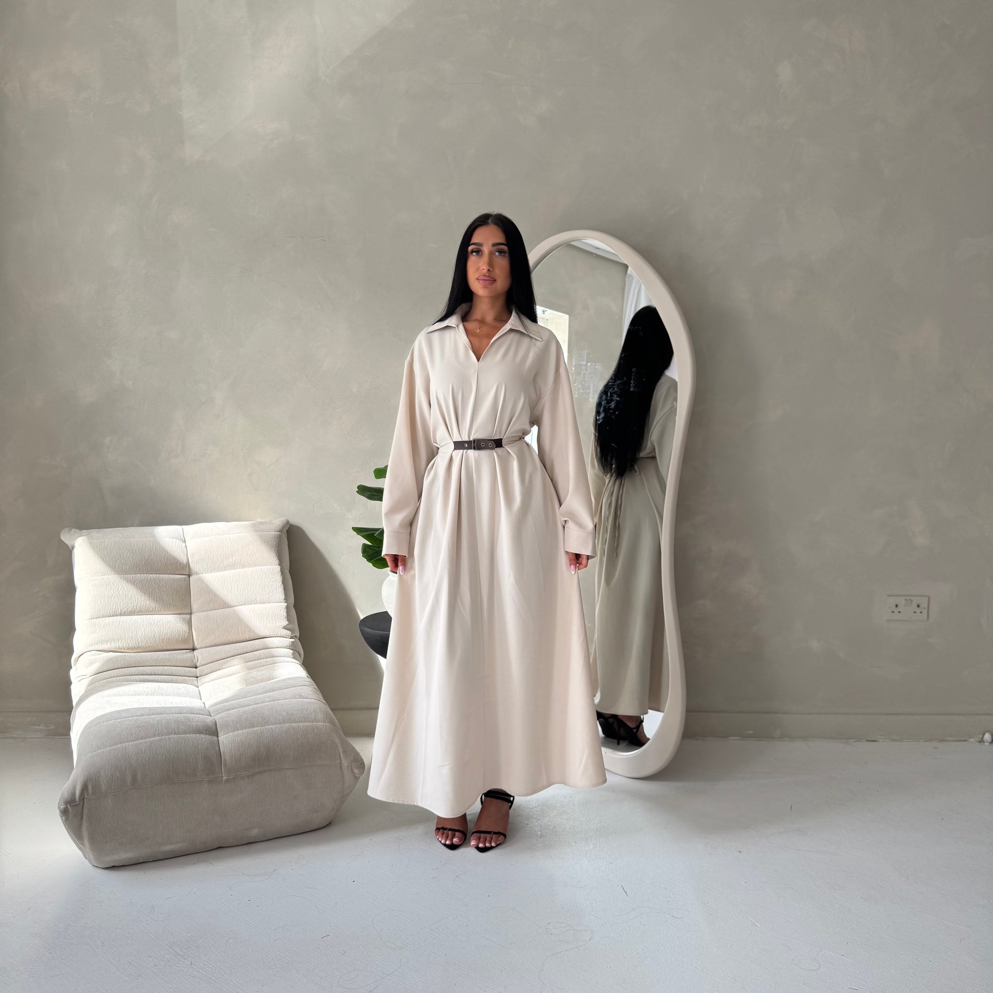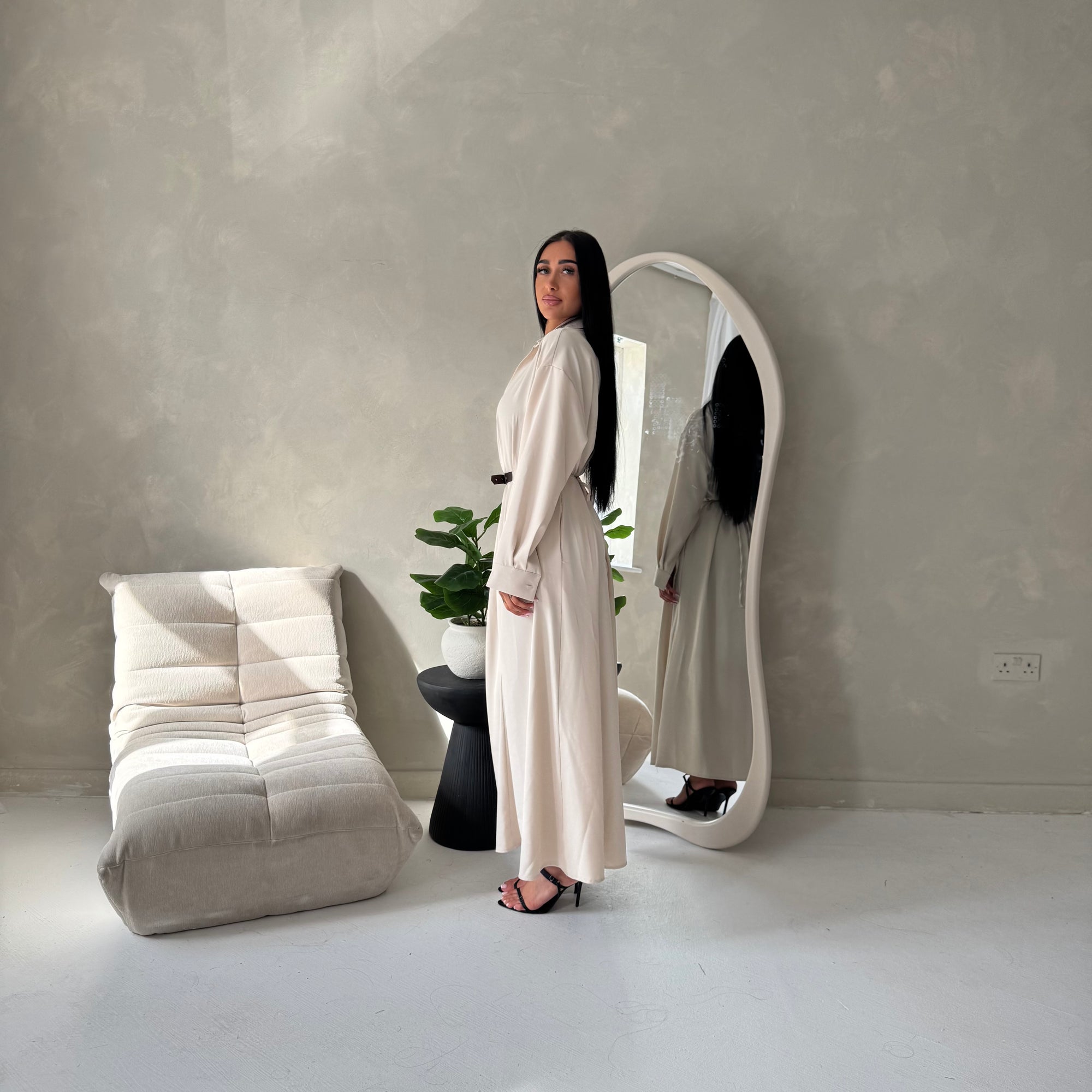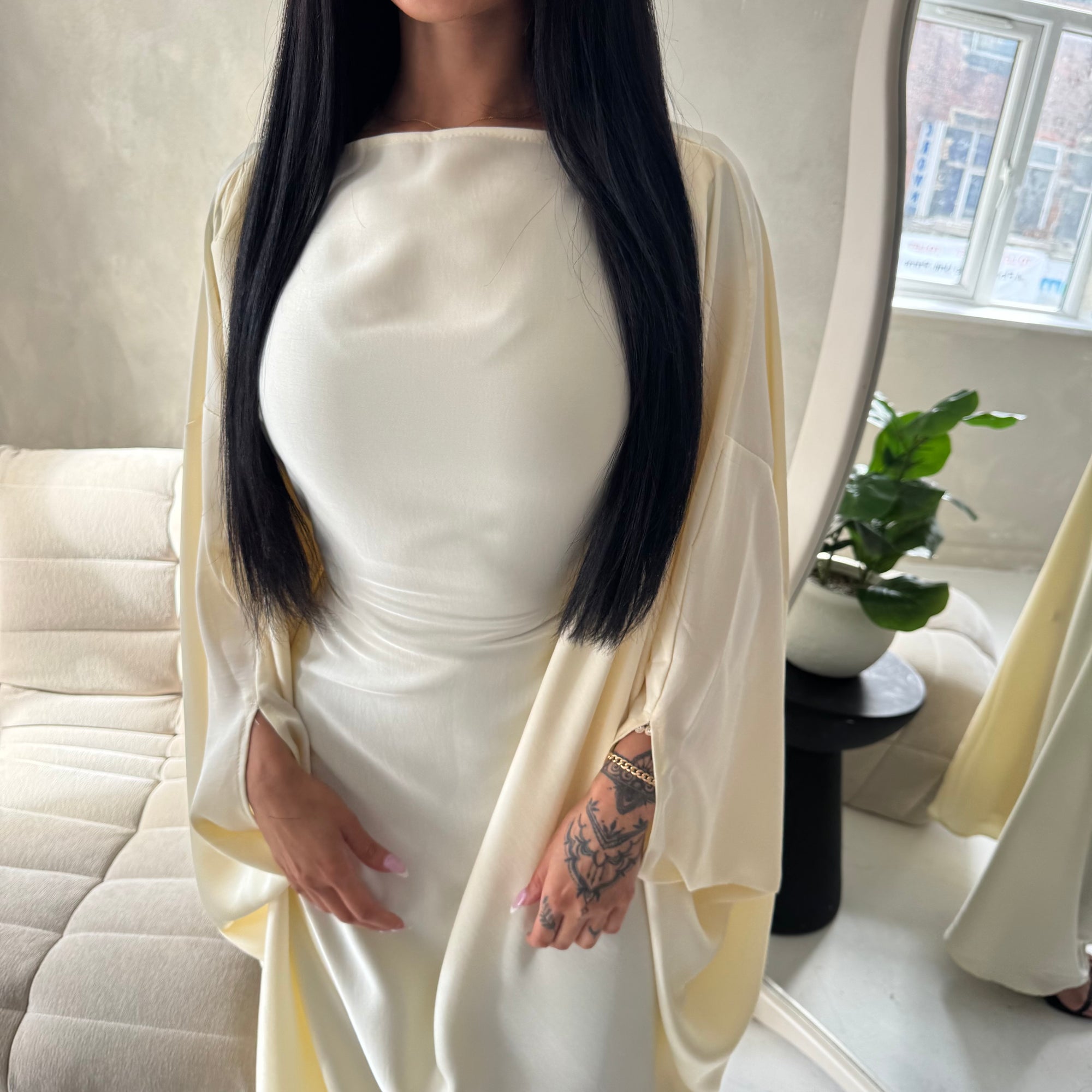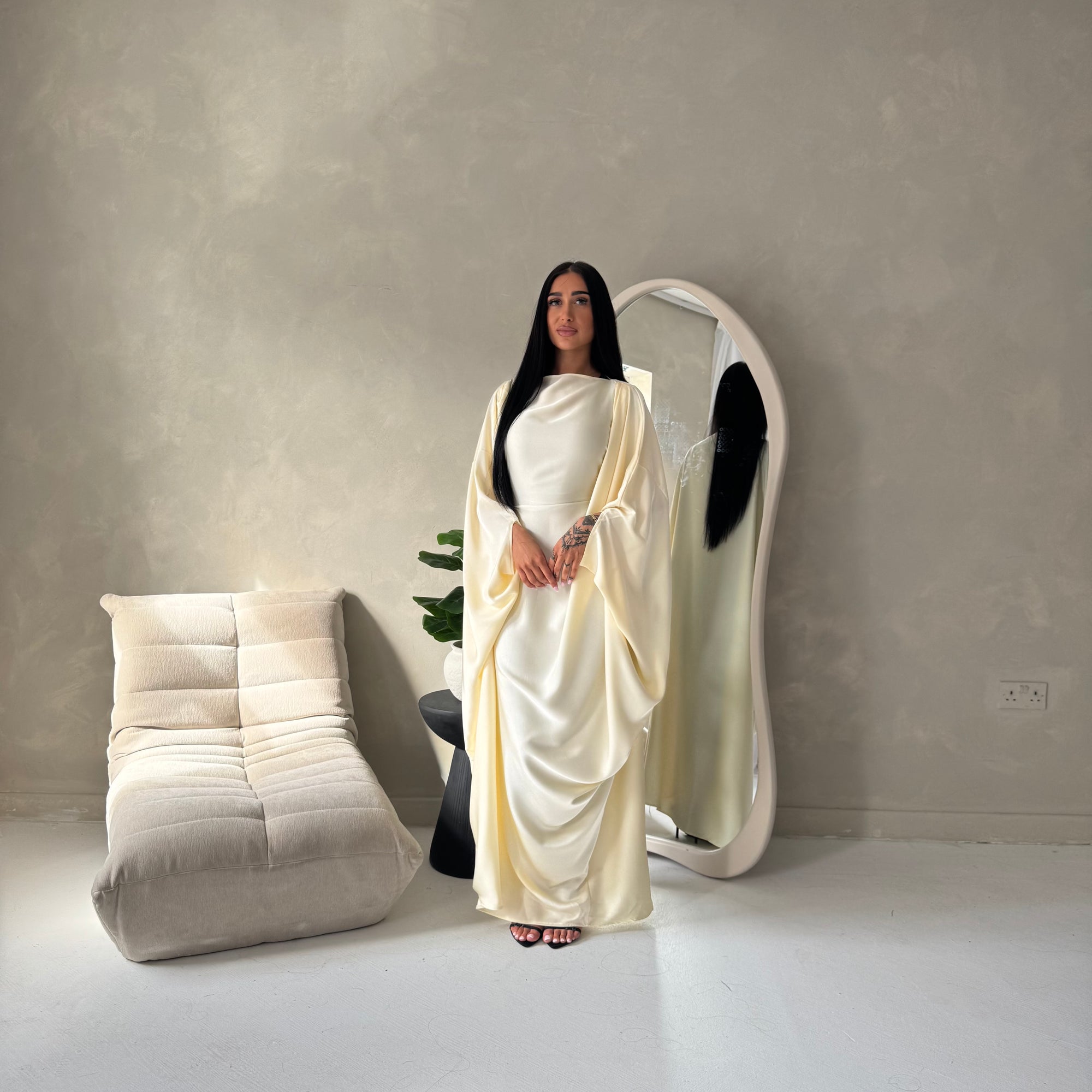 Sahra Cream Satin Shoulder Gather Kaftan Dress