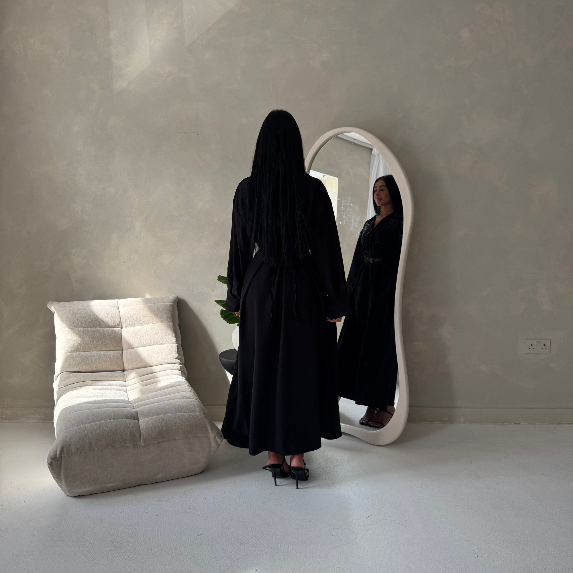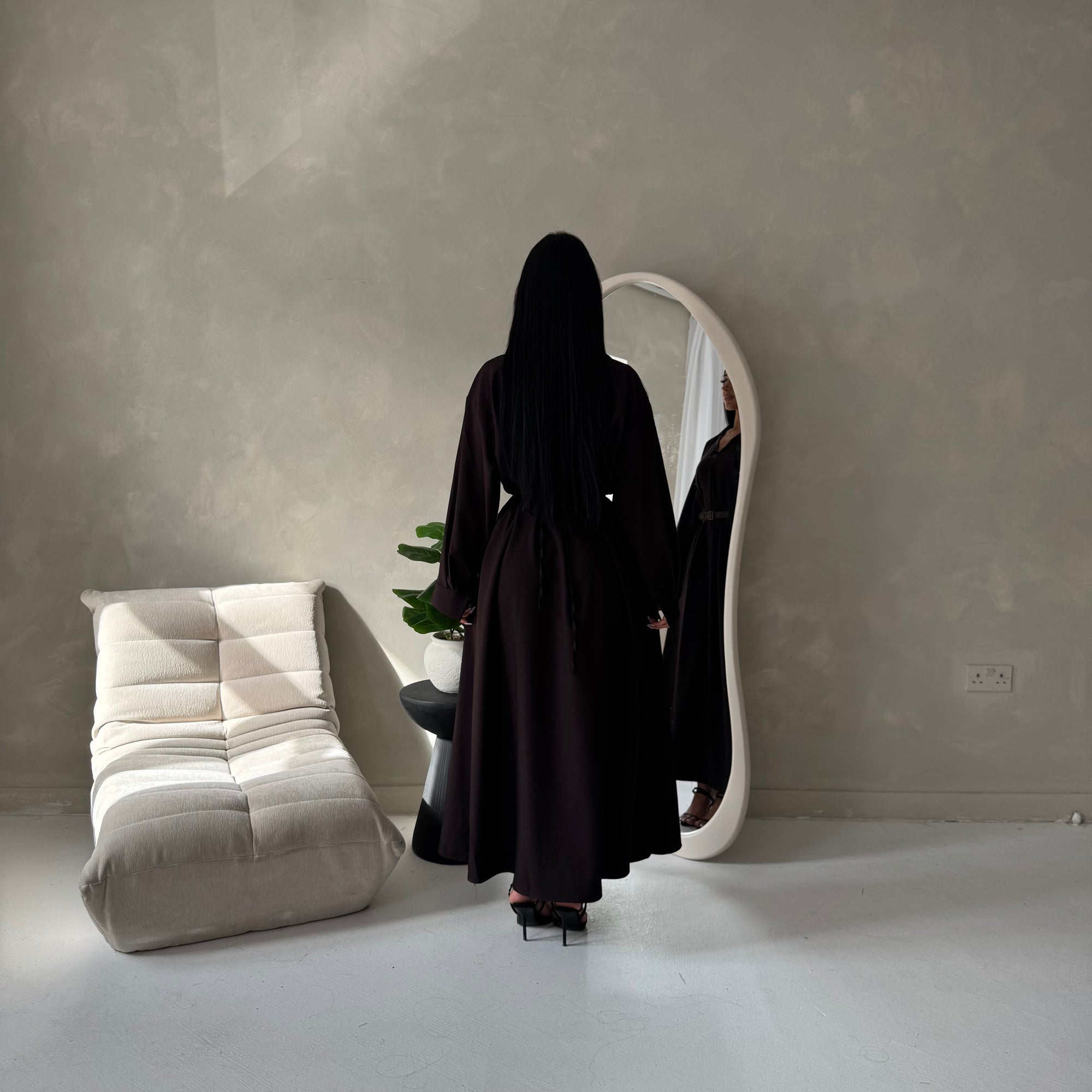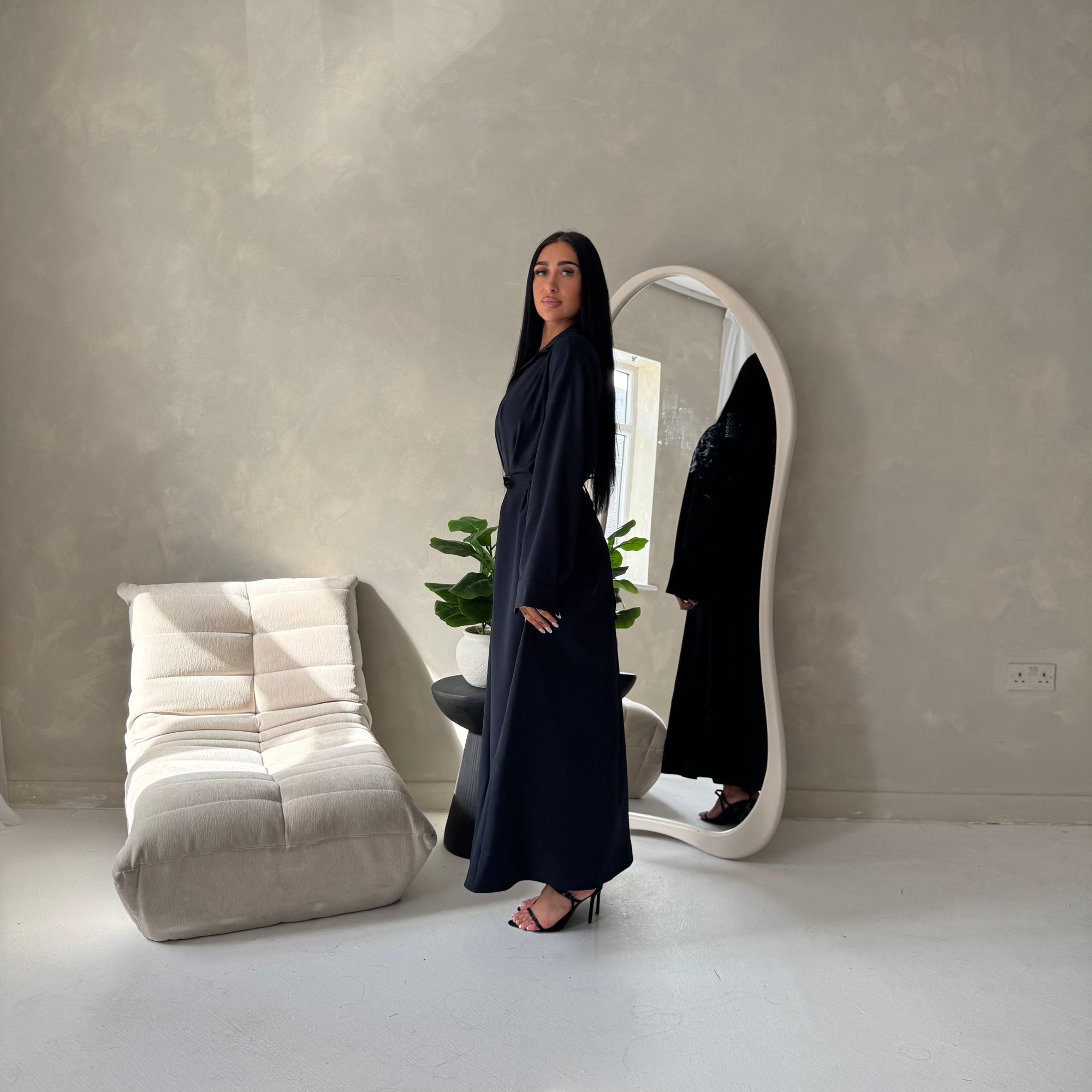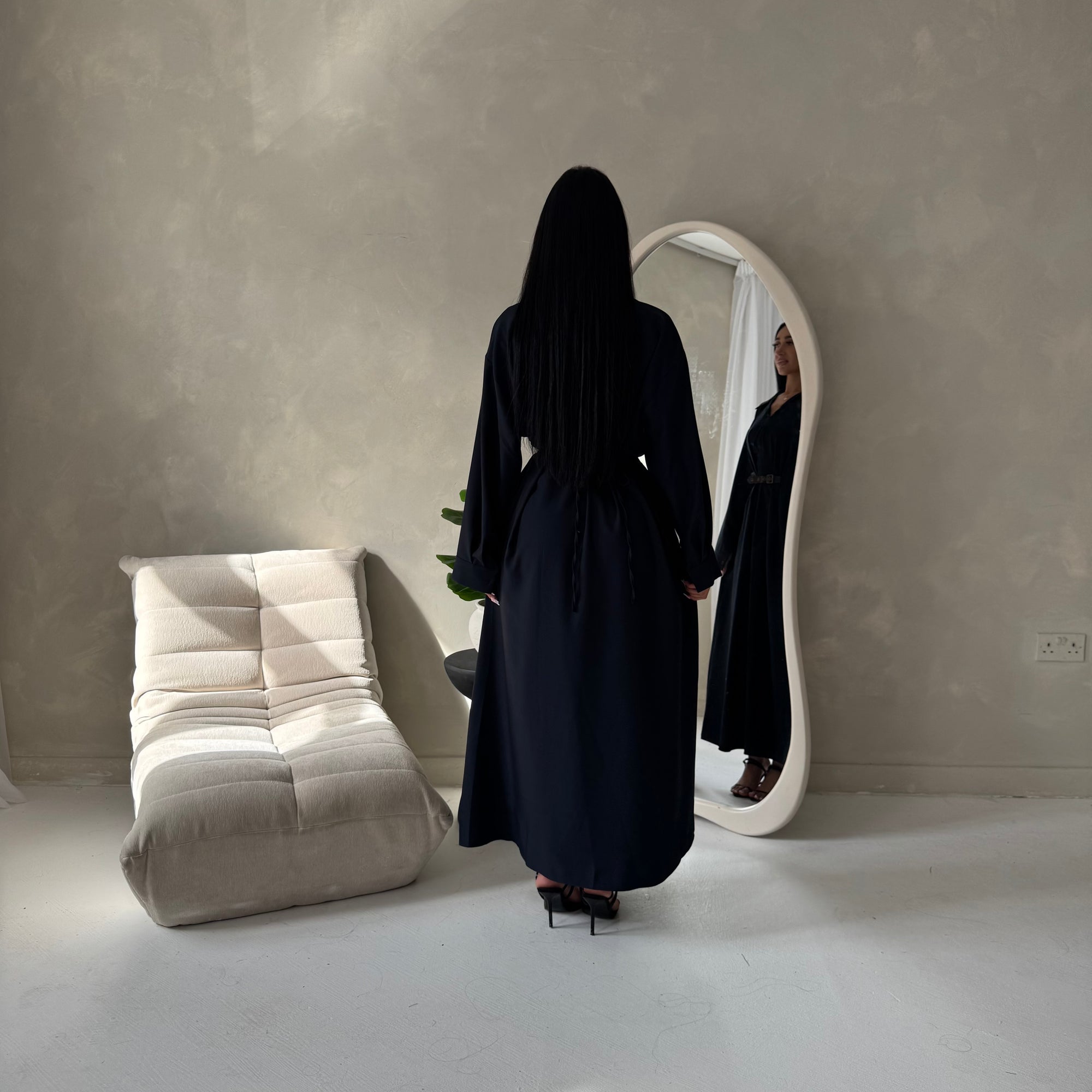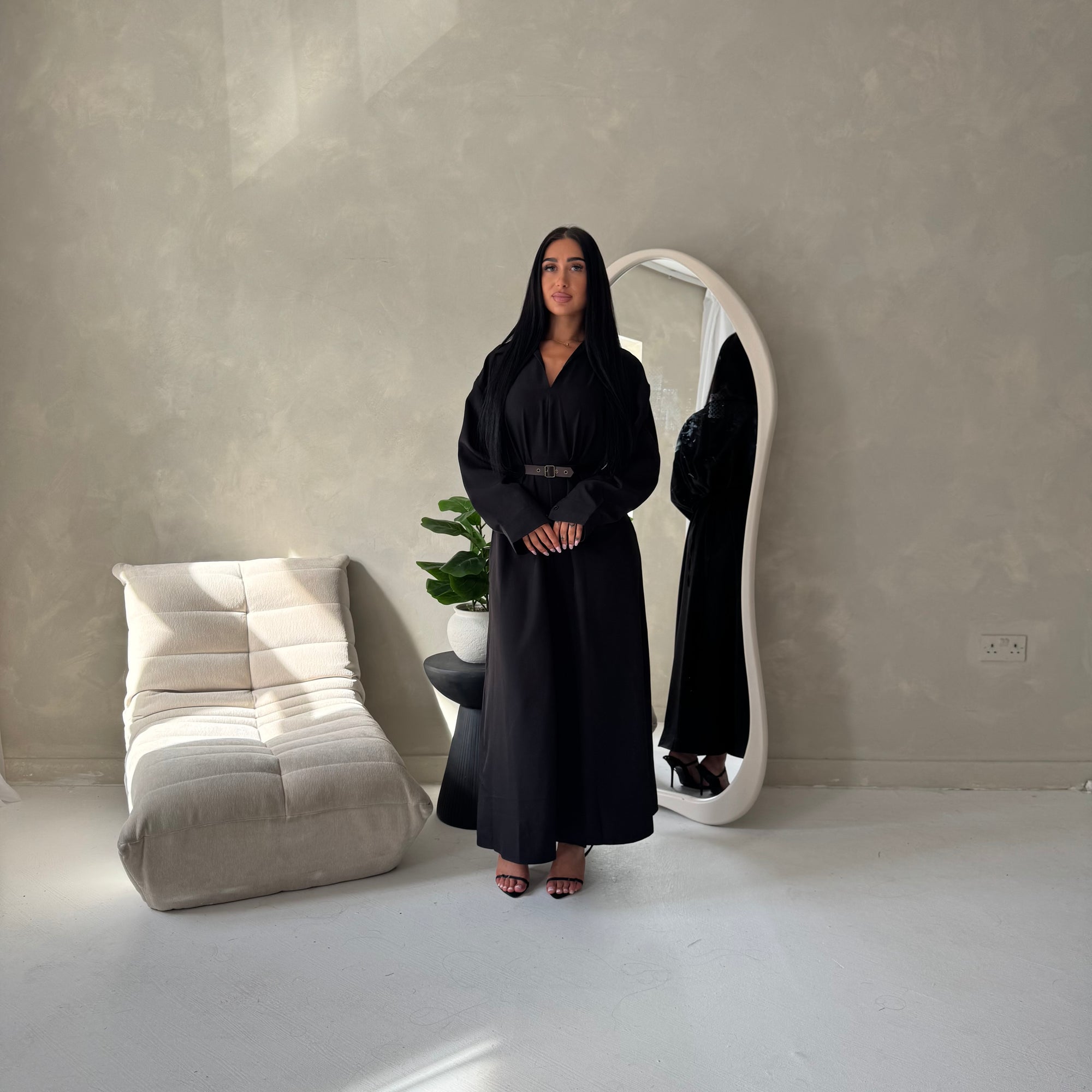 Sahra Black Satin Shoulder Gather Kaftan Dress
