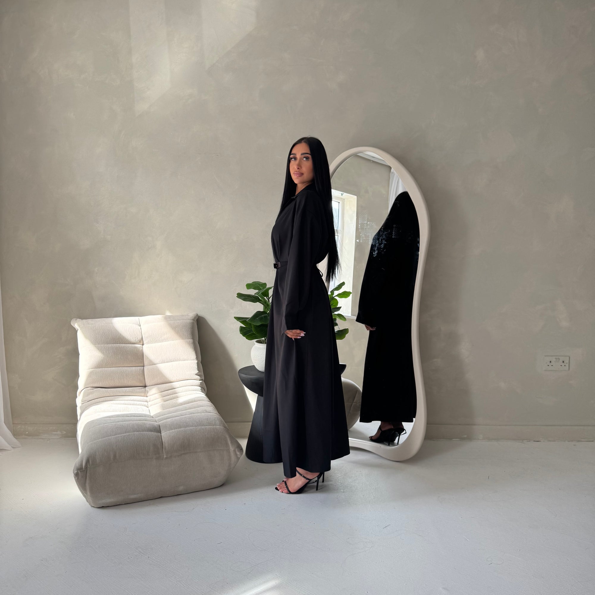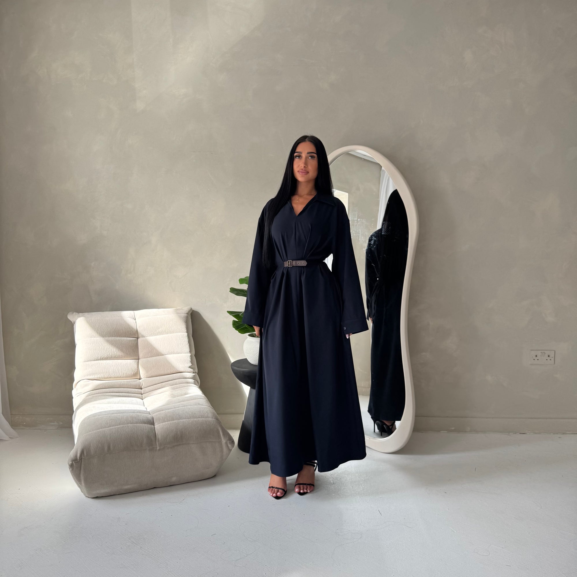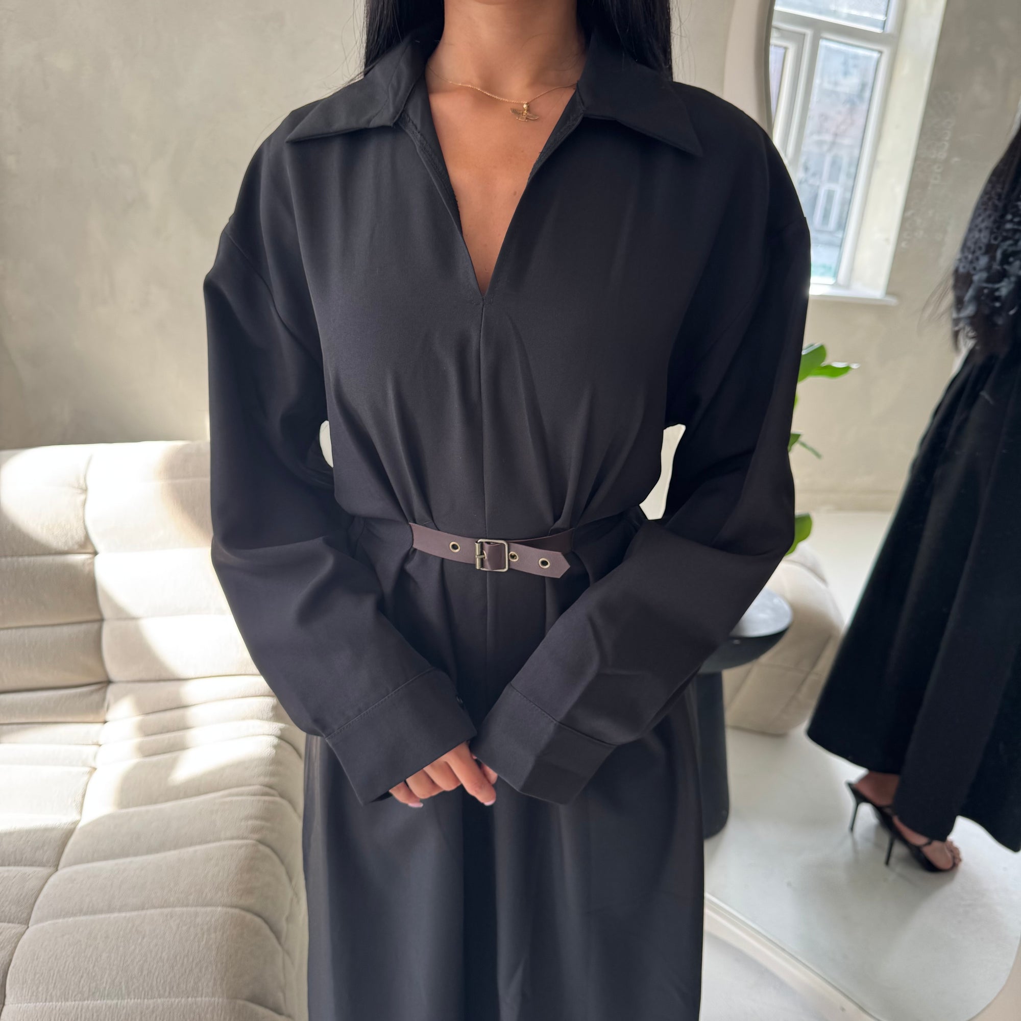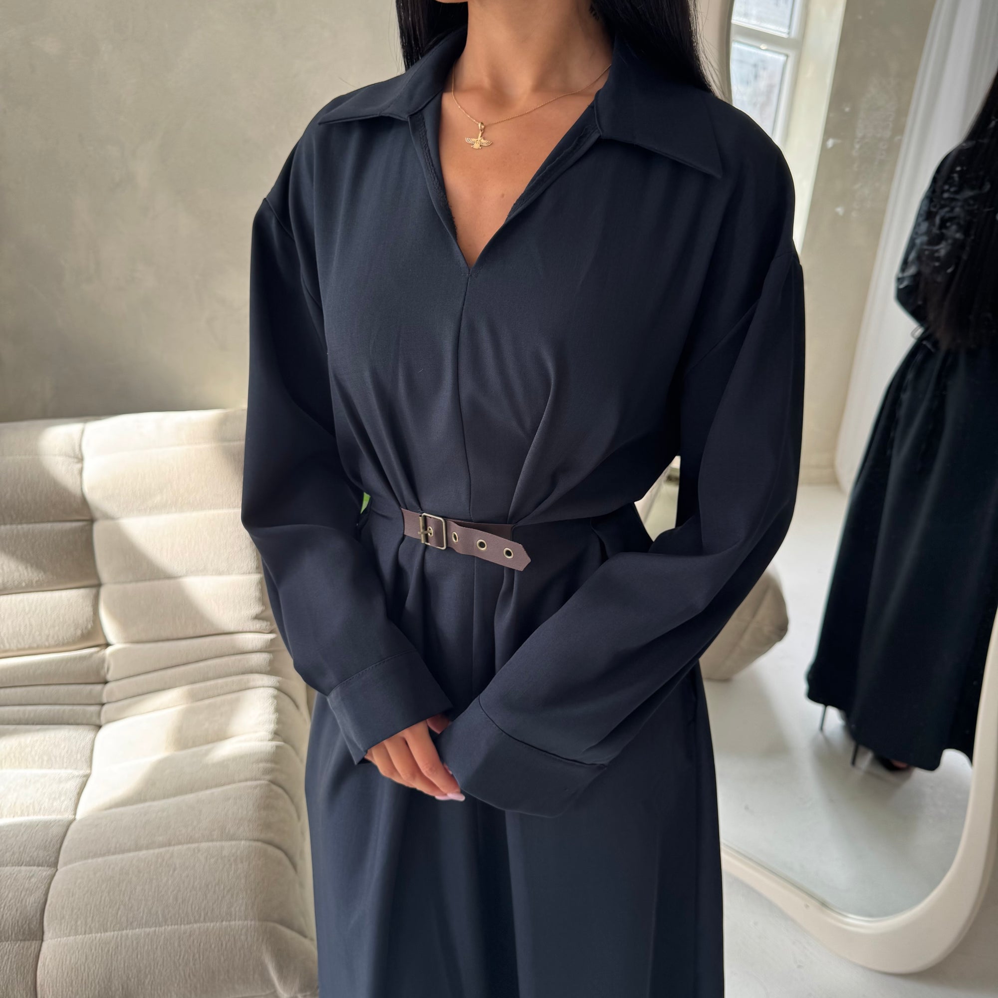 Areezo Black Pleated Belted Buckle V Neck Collar Dress
