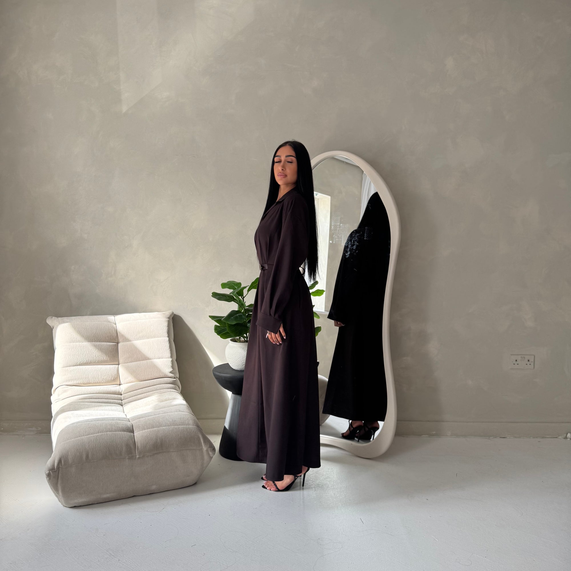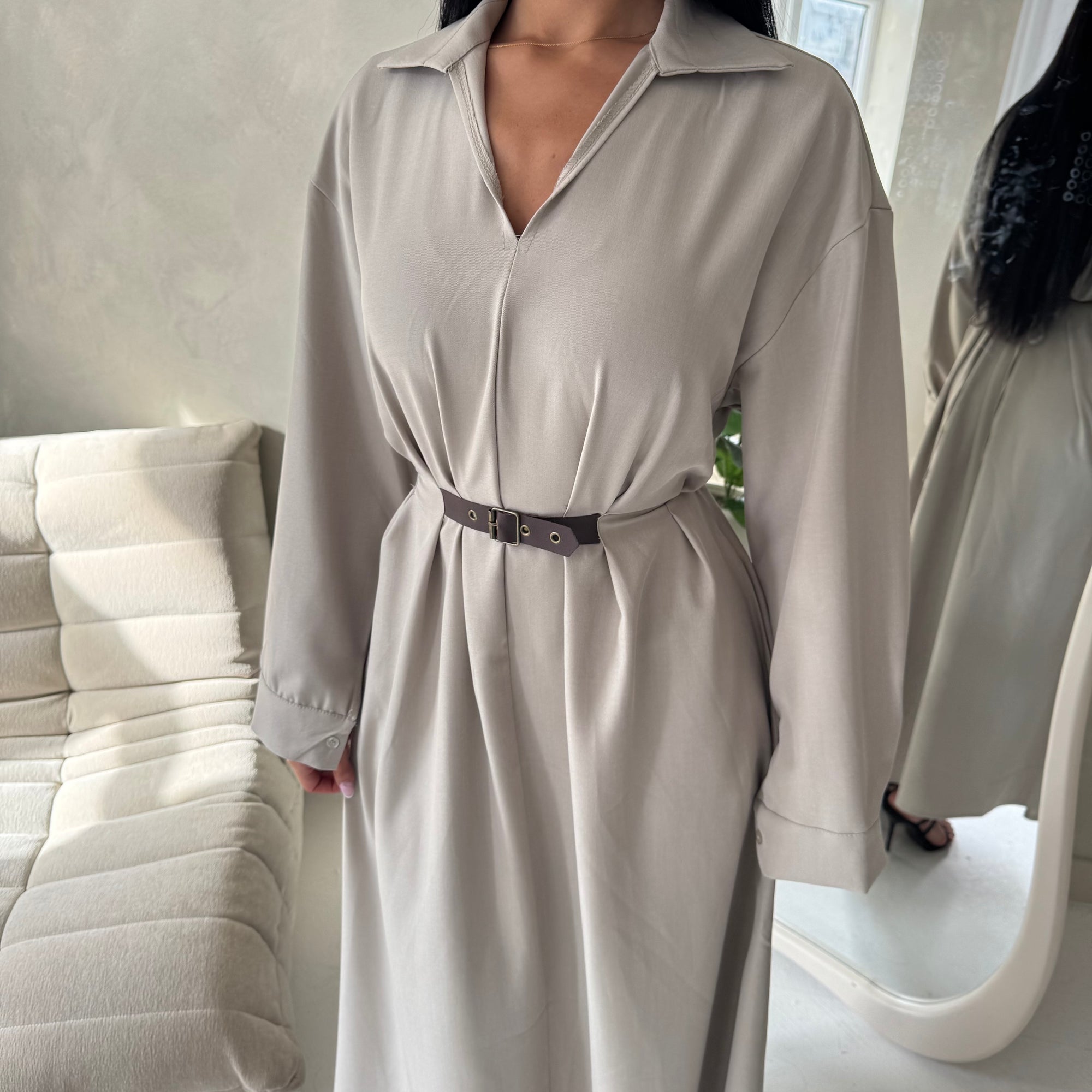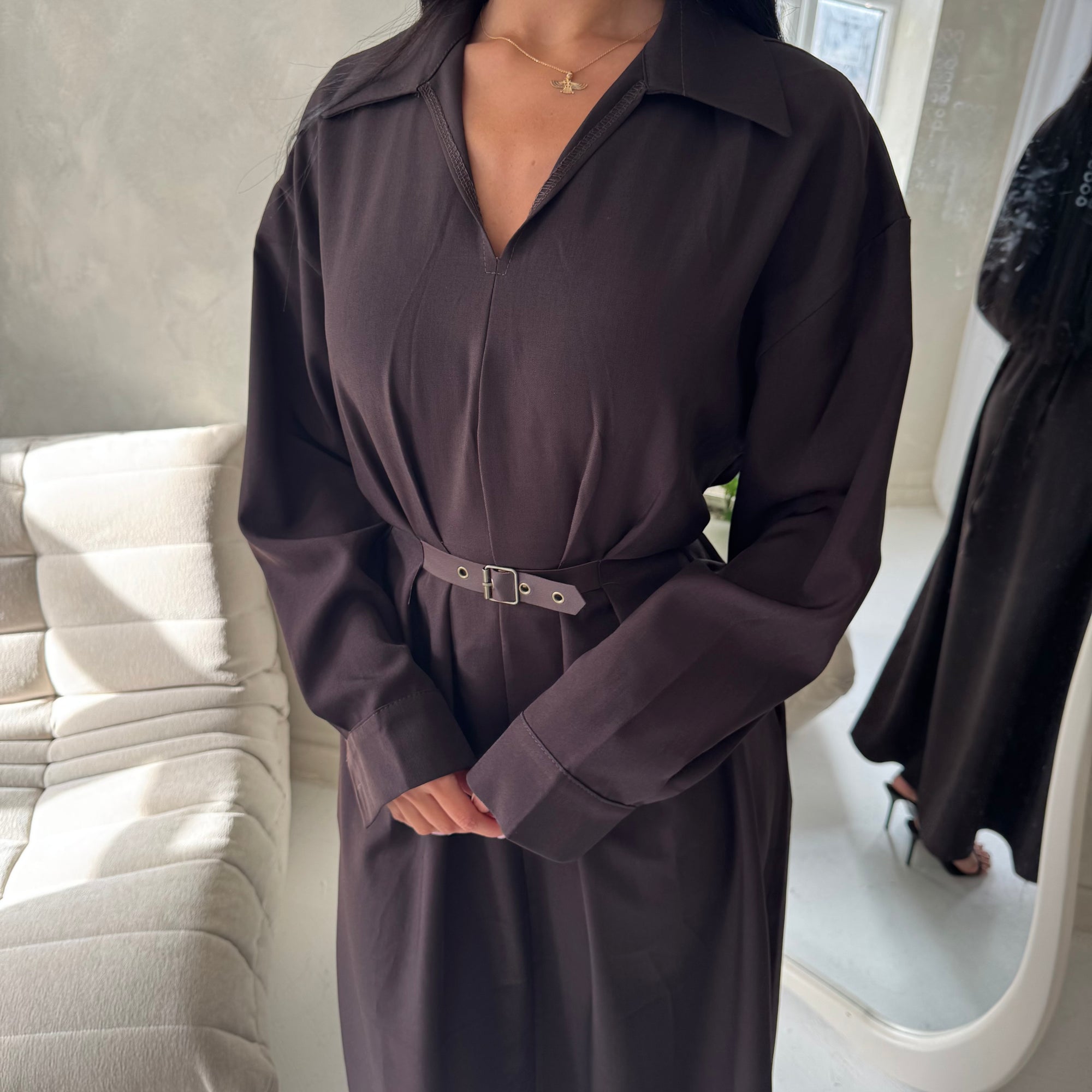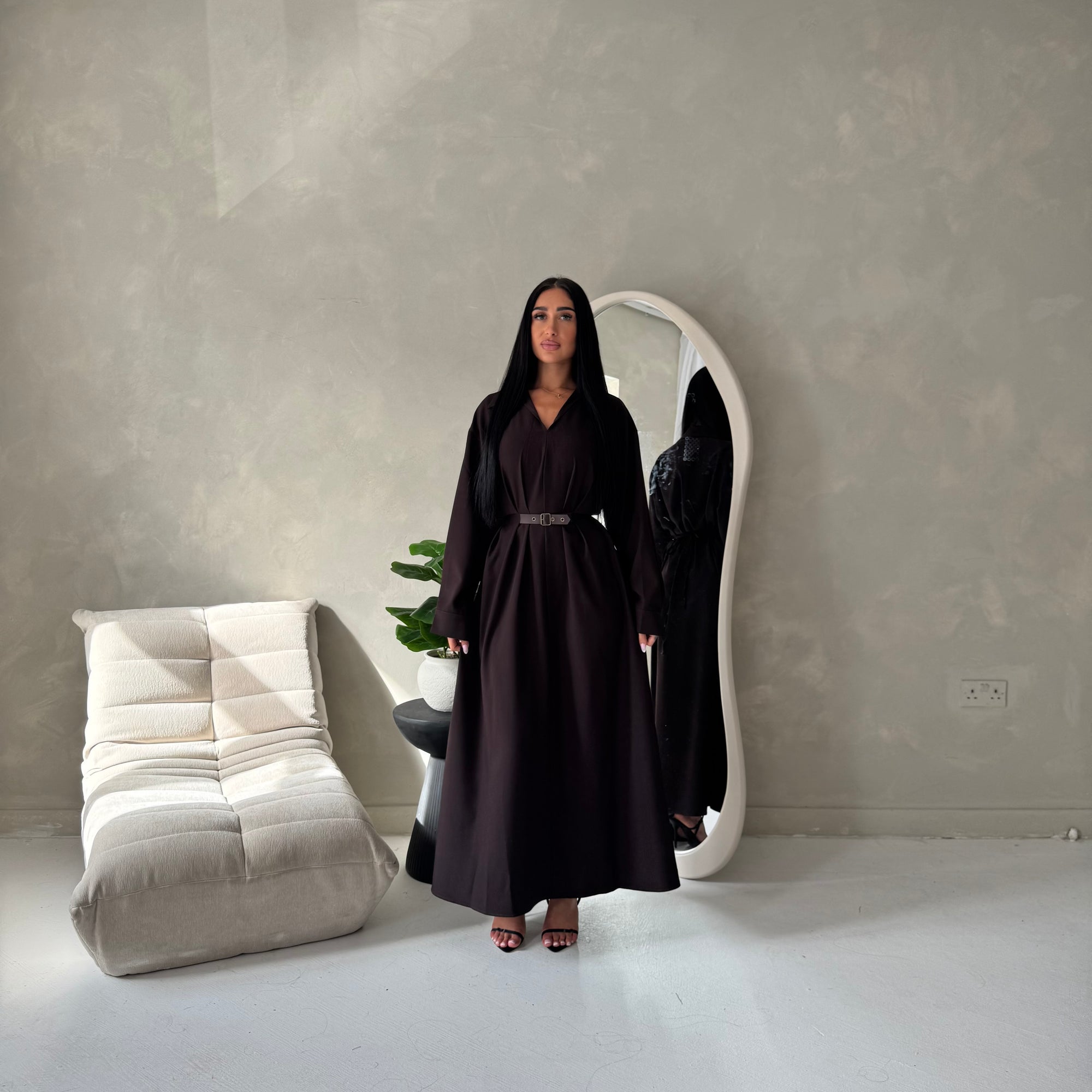 Areezo Brown Pleated Belted Buckle V Neck Collar Dress