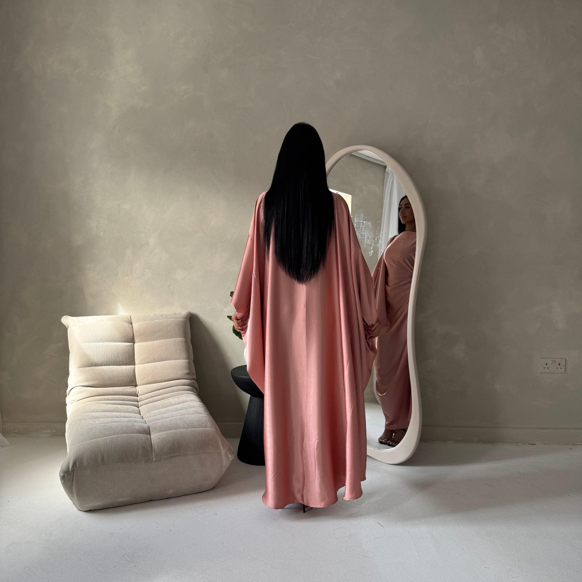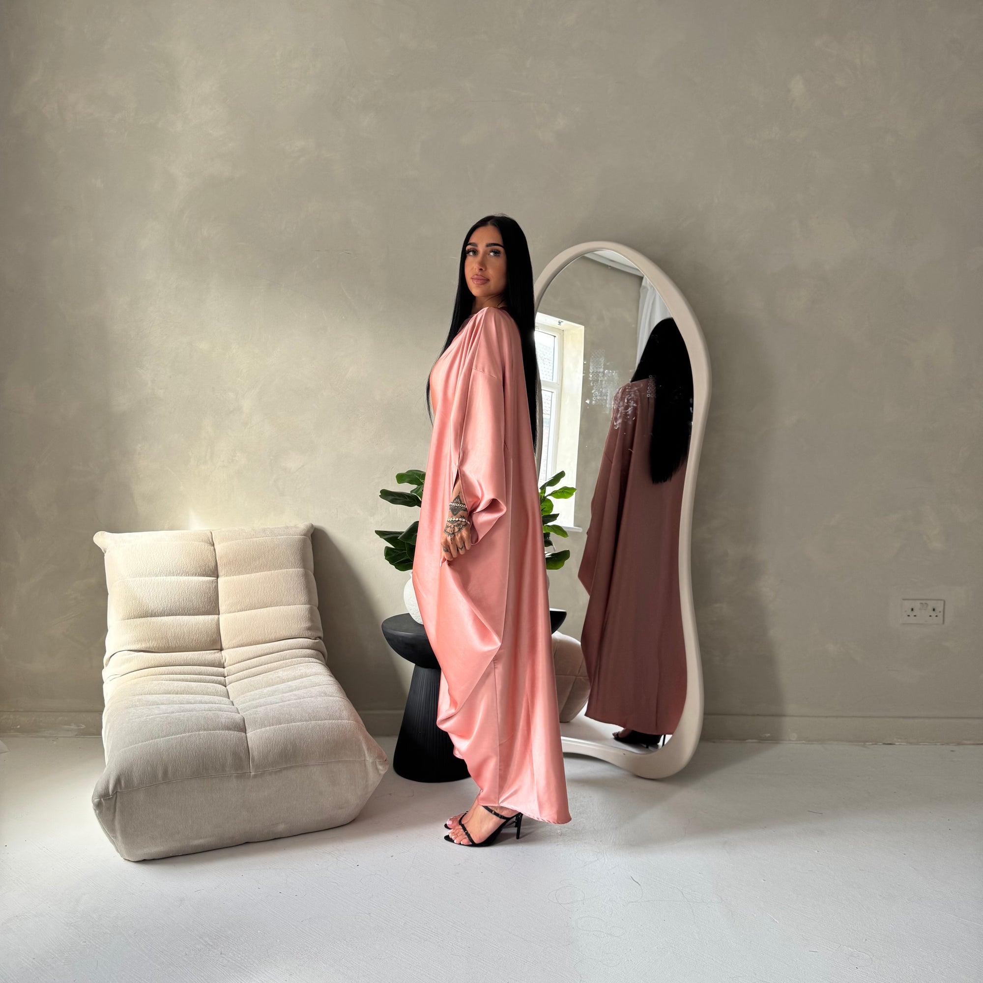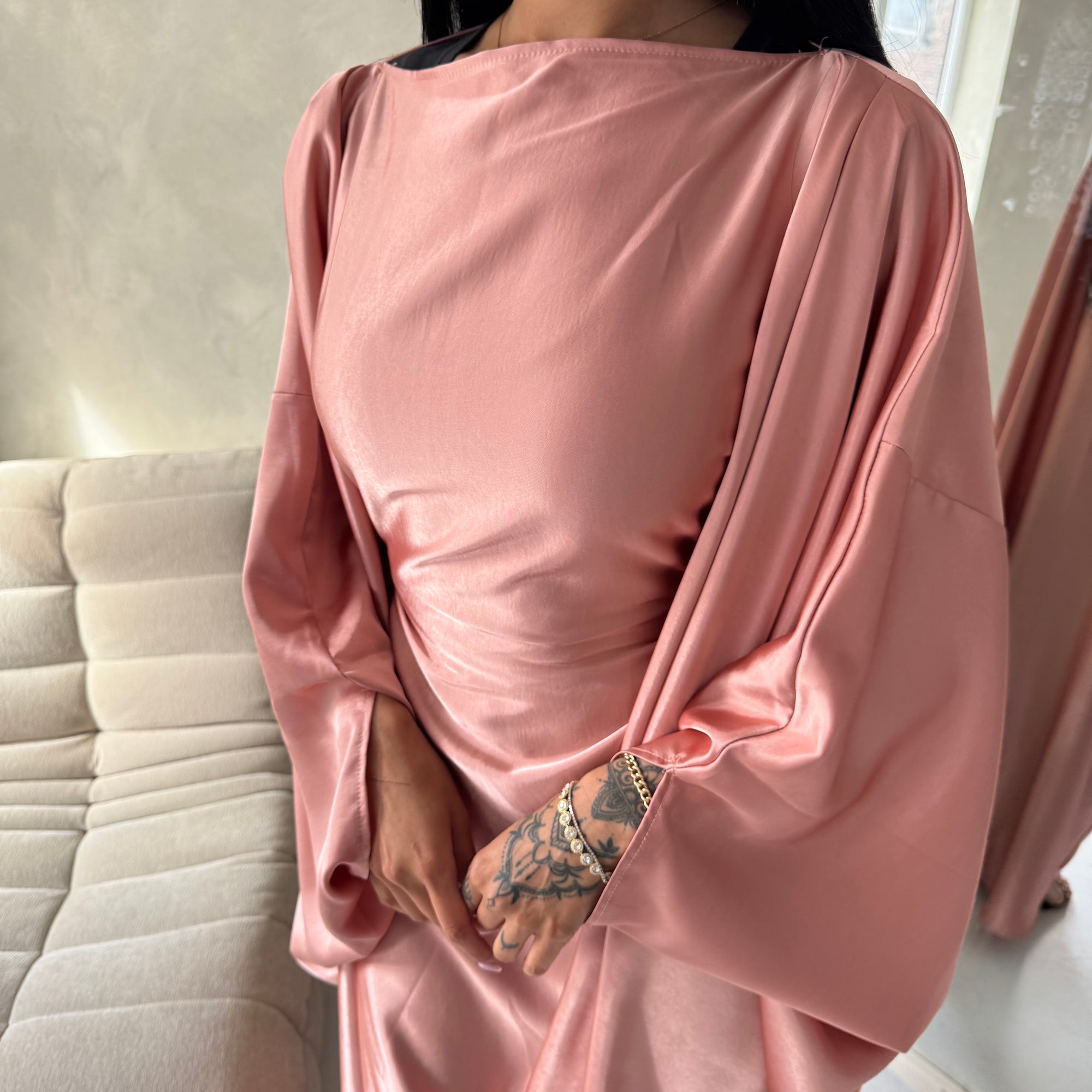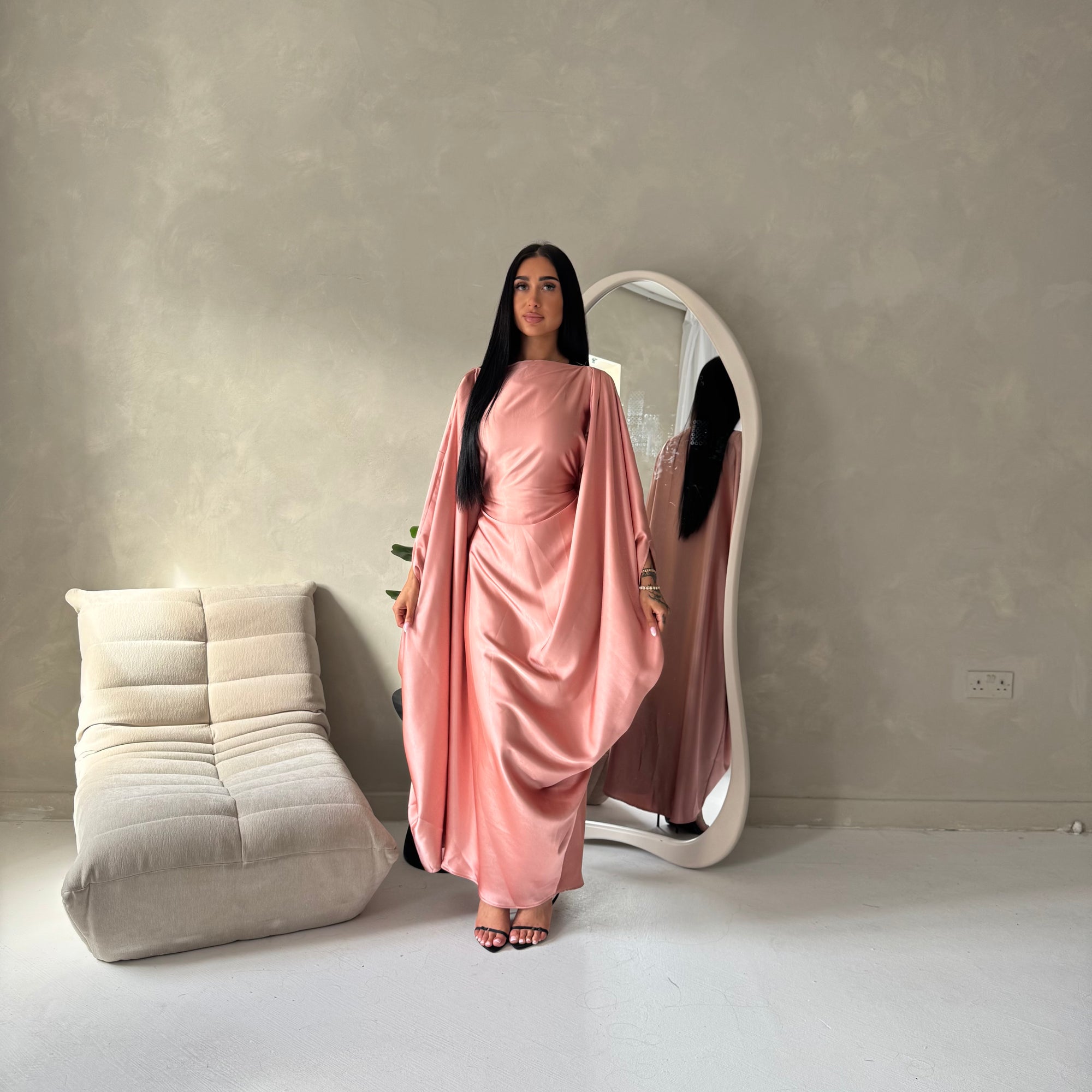 Sahra Pink Satin Shoulder Gather Kaftan Dress