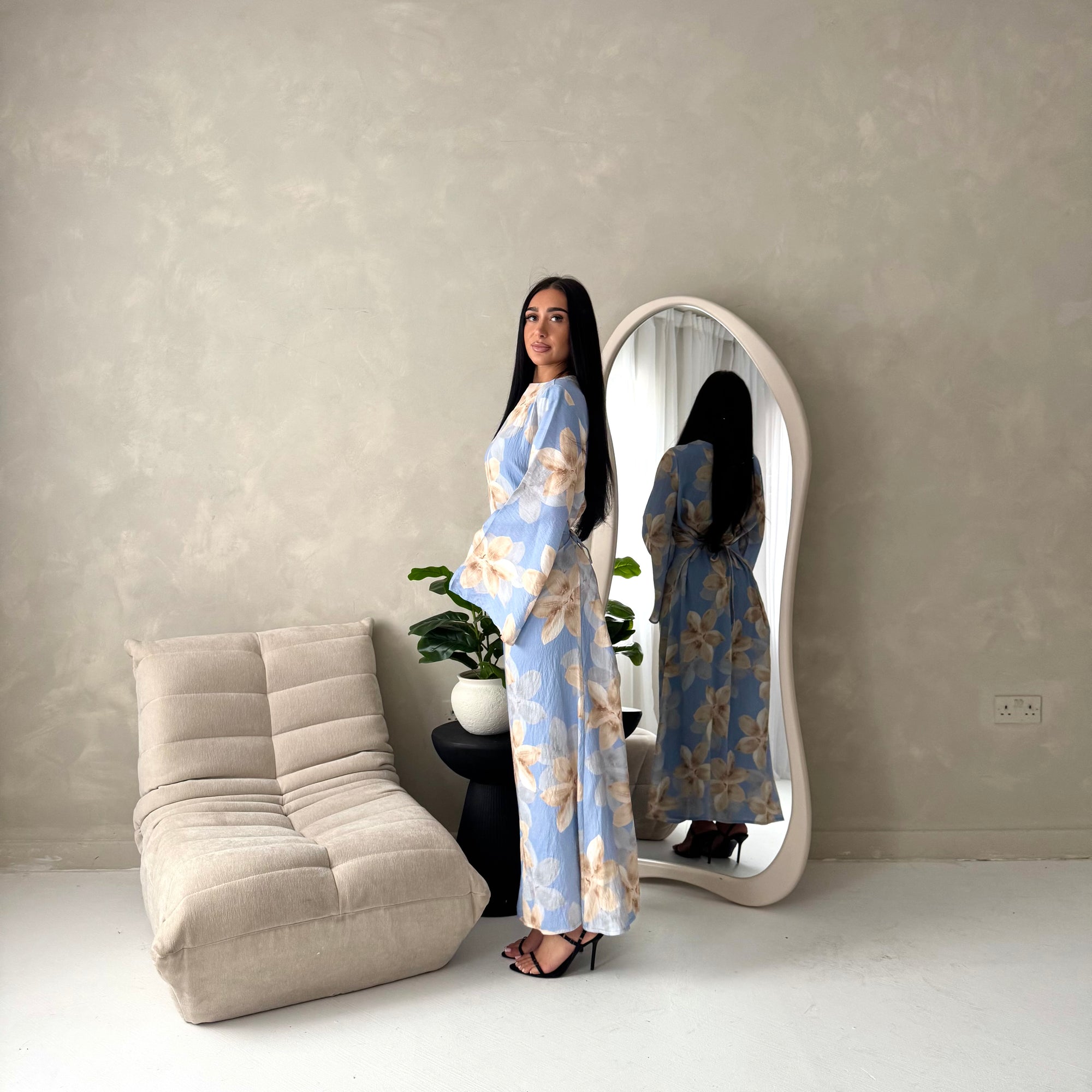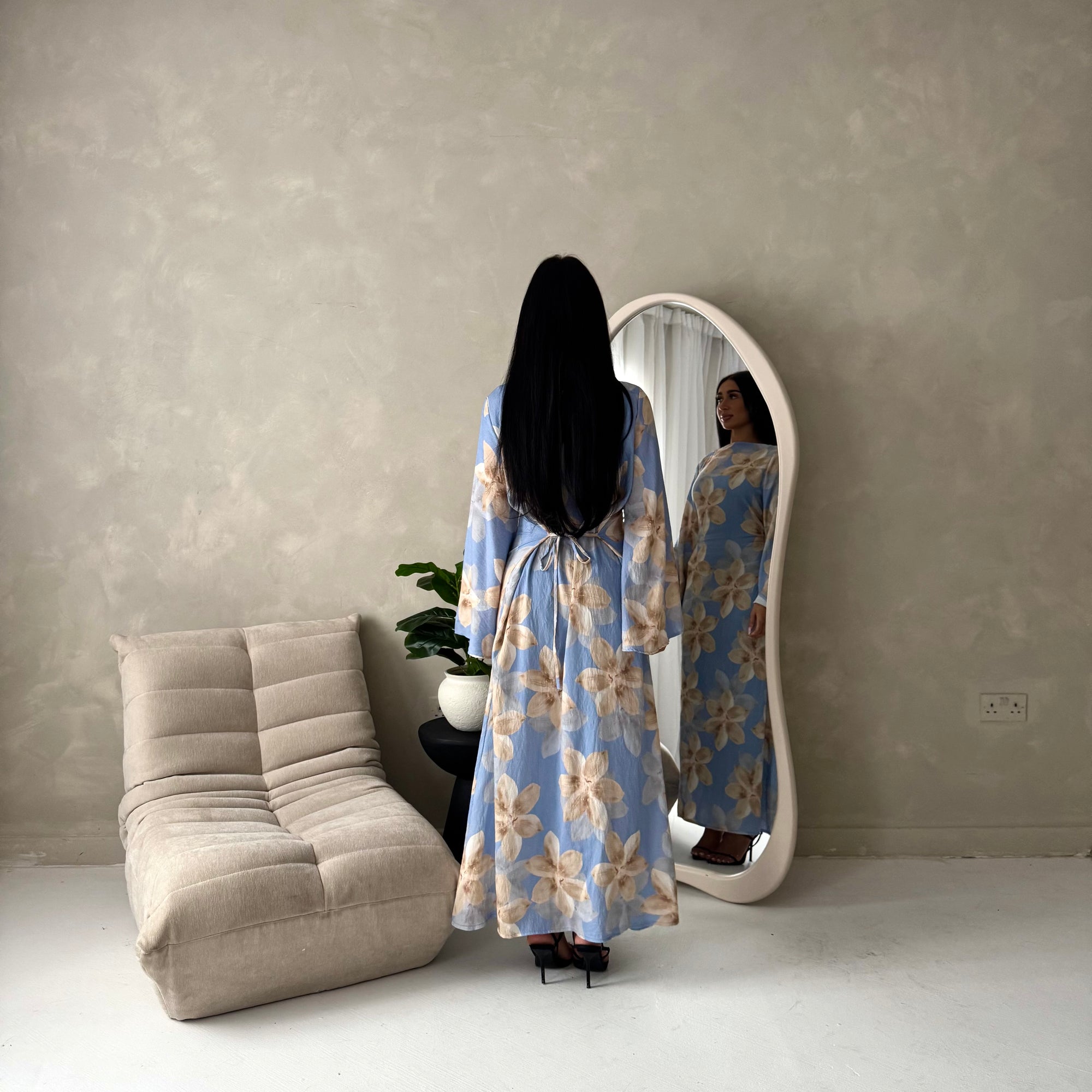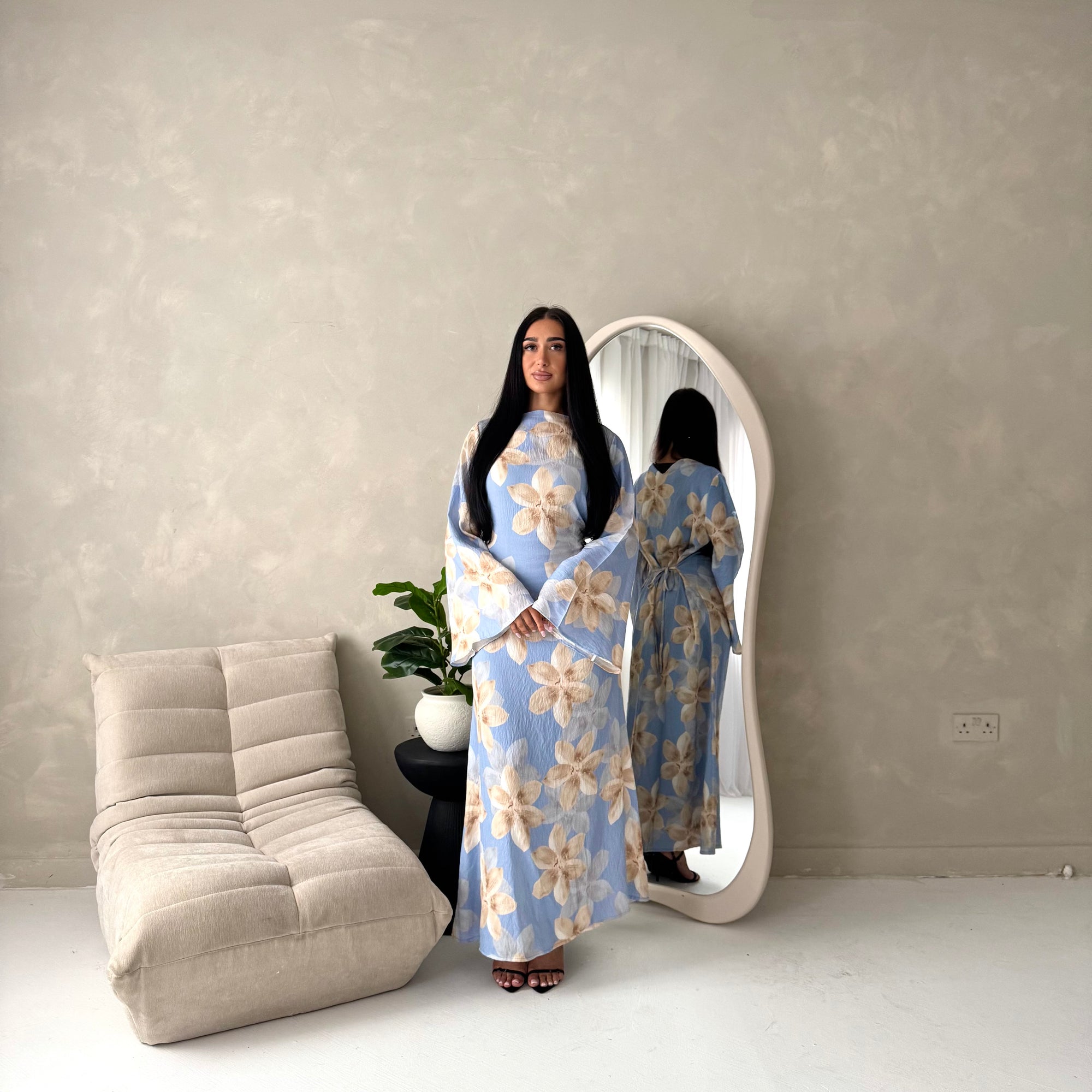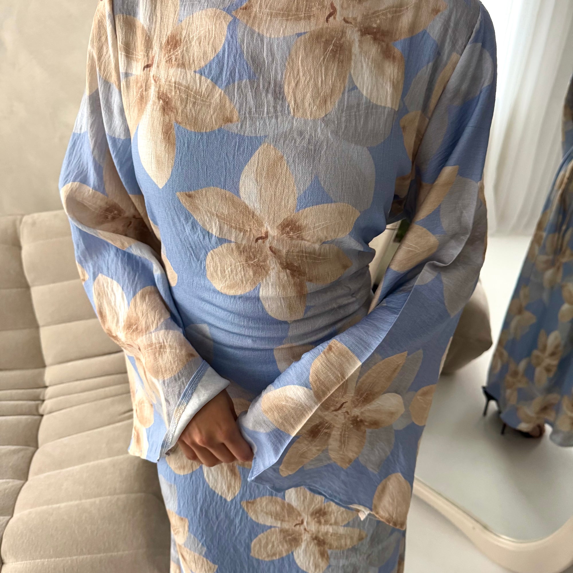 Geri Blue Linen Floral Summer Modest Dress