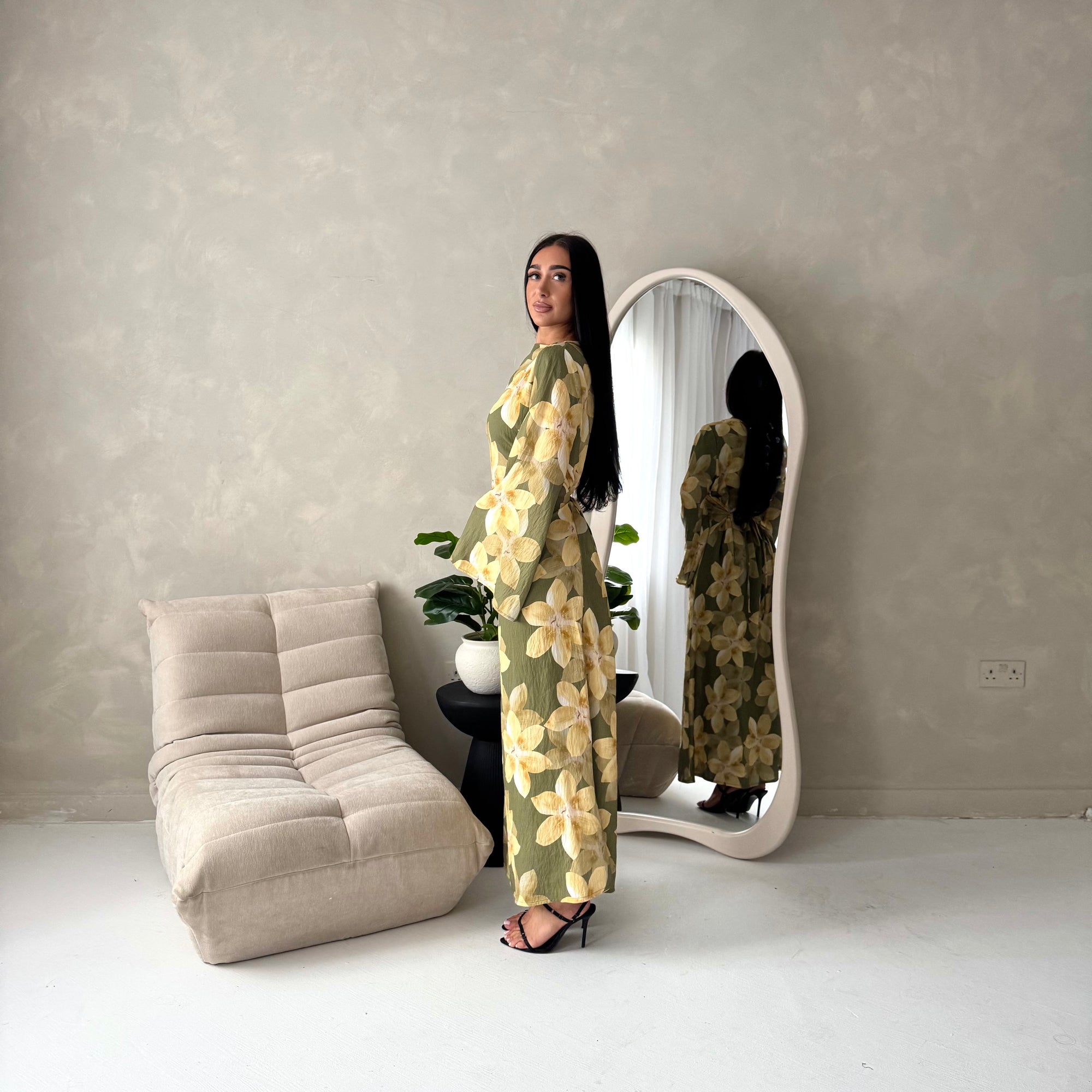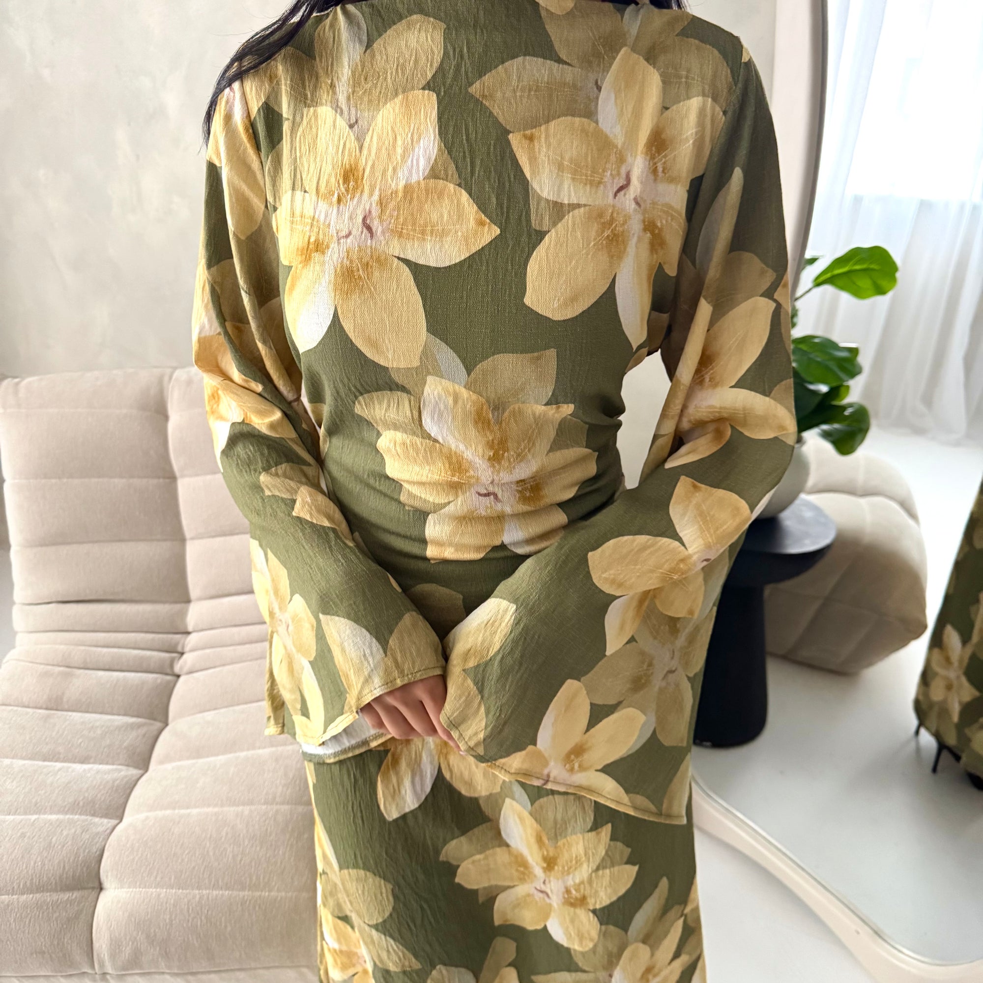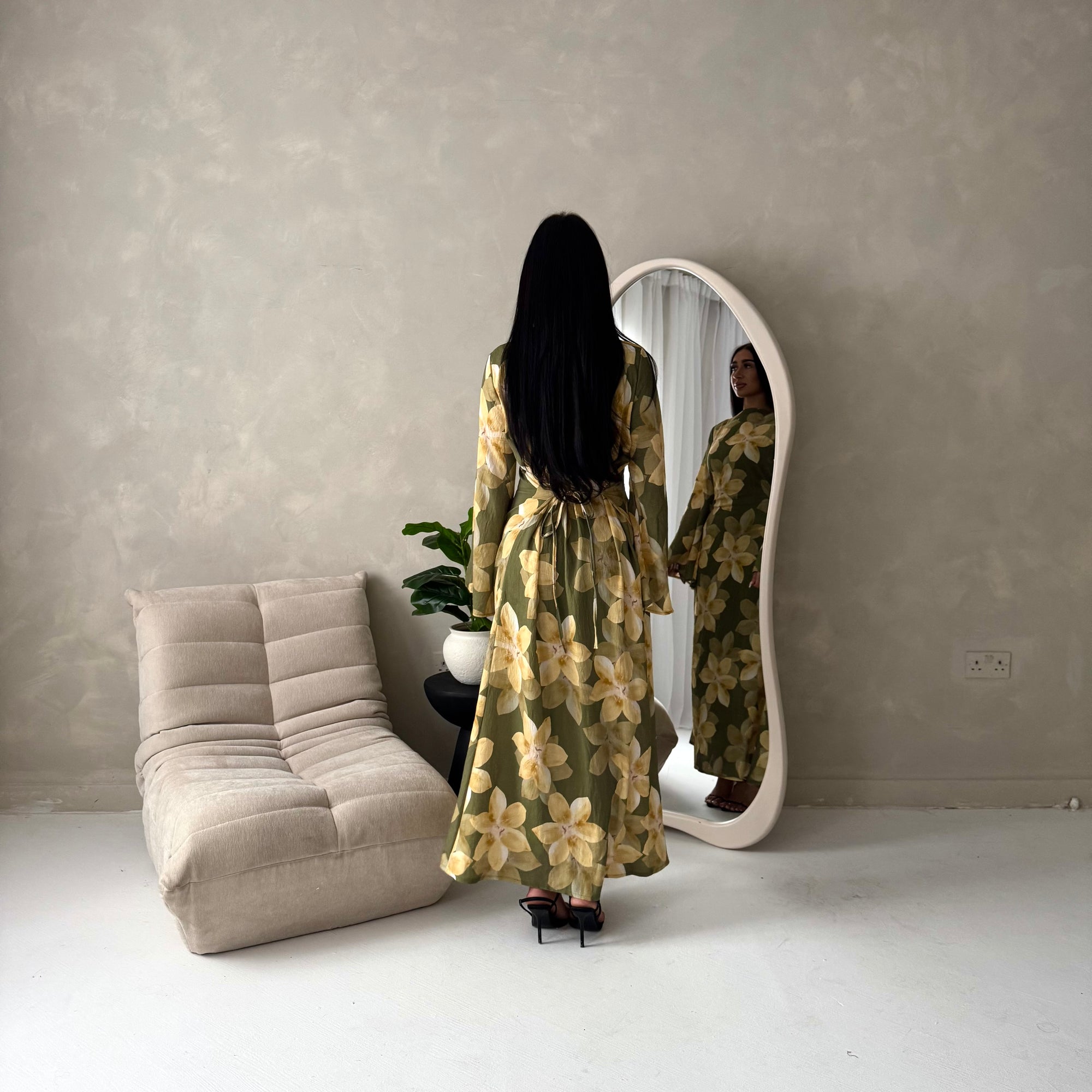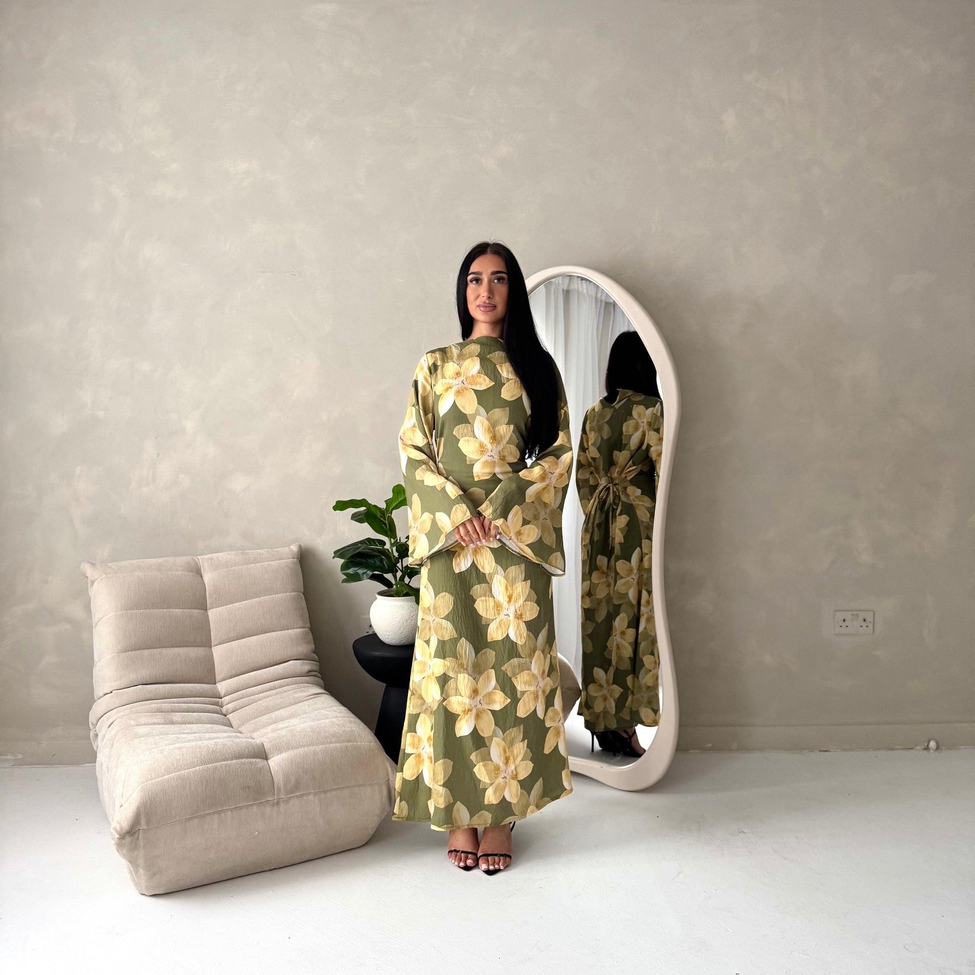 Geri Khaki Linen Floral Summer Modest Dress