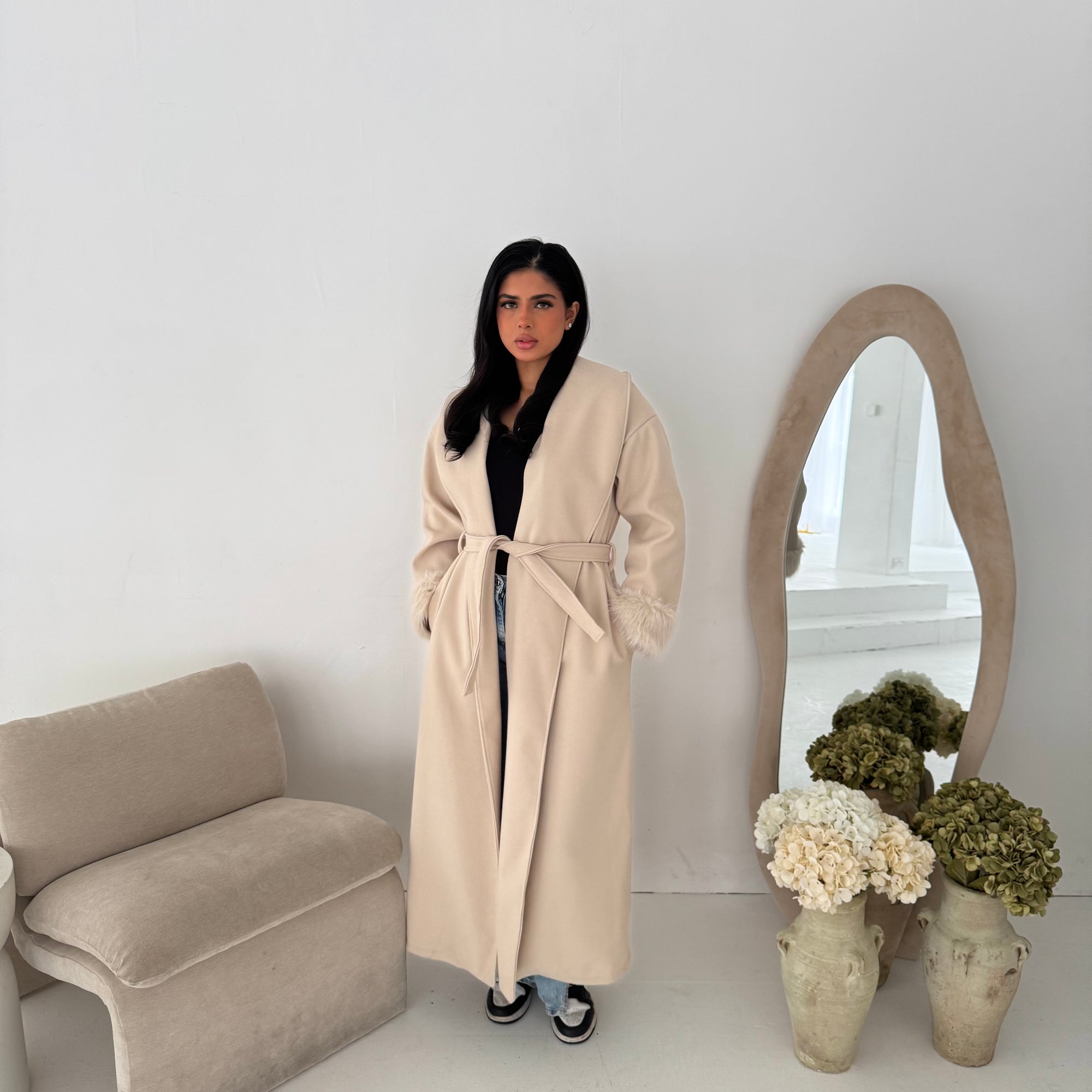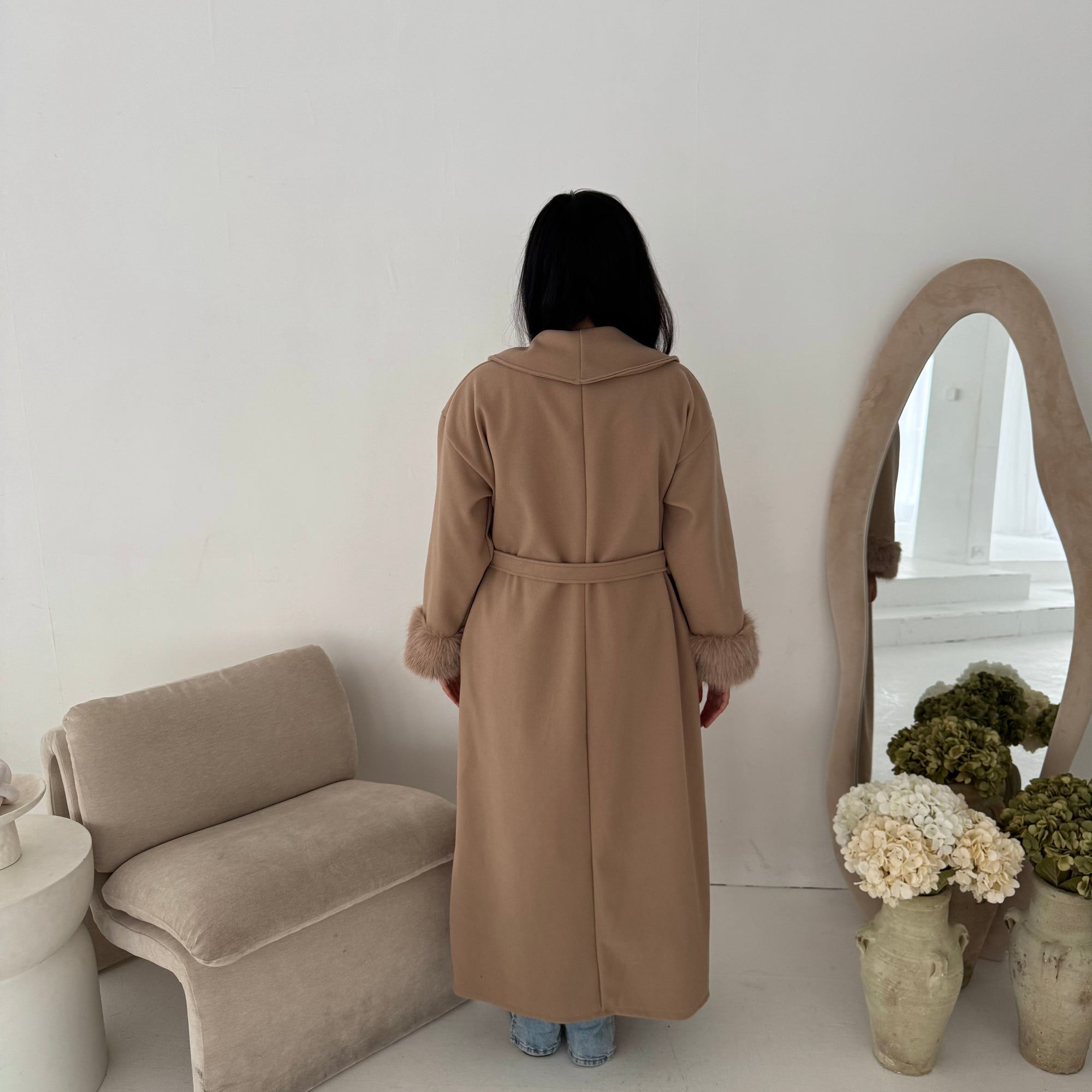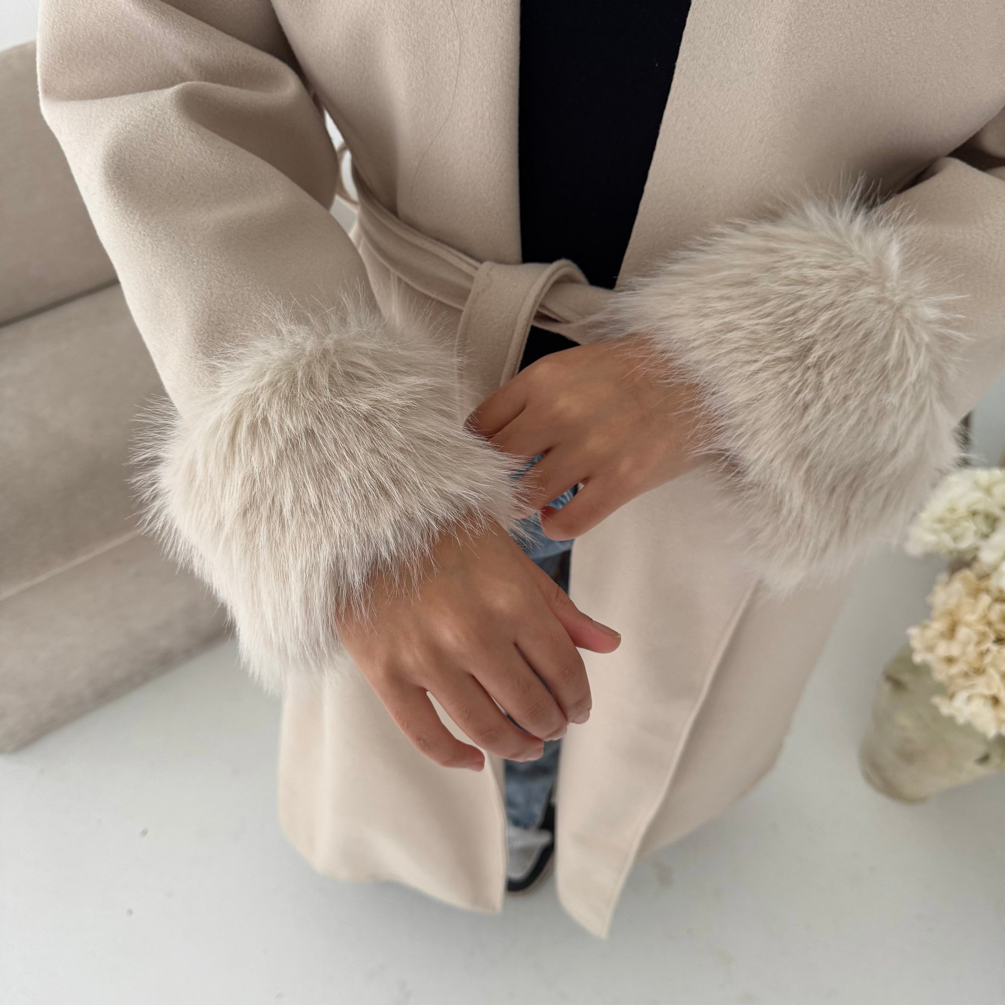 Mona Beige Fur Sleeve Belted Coat
