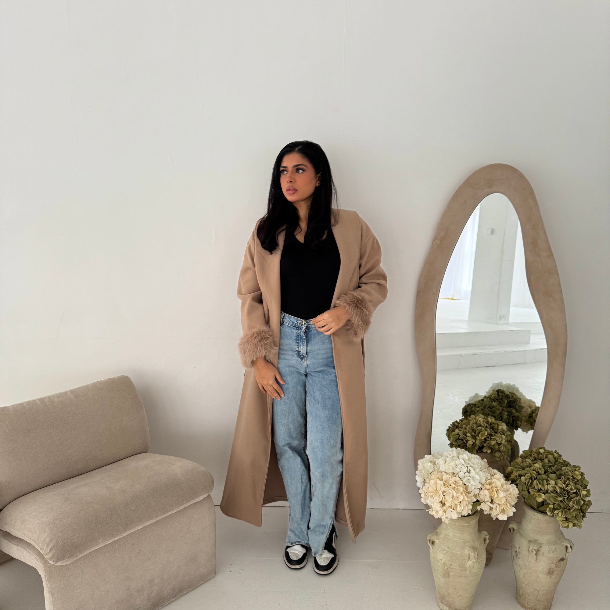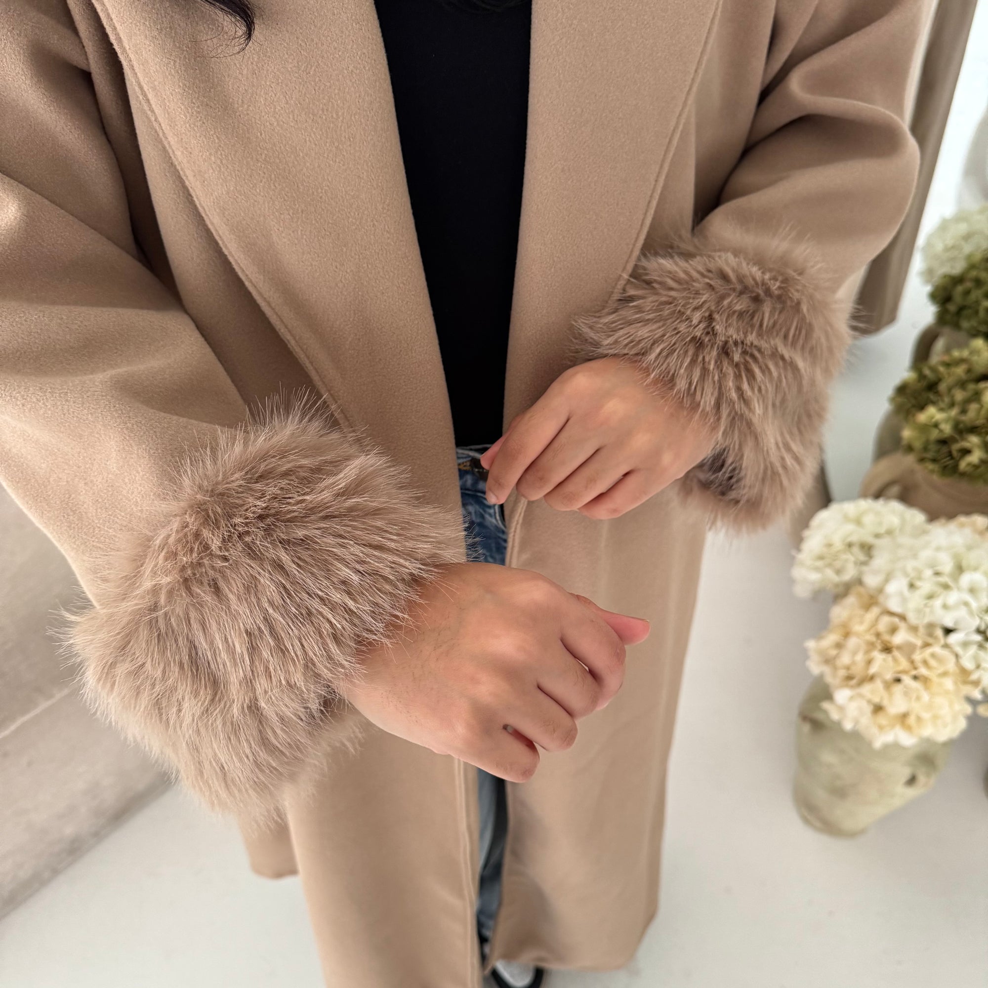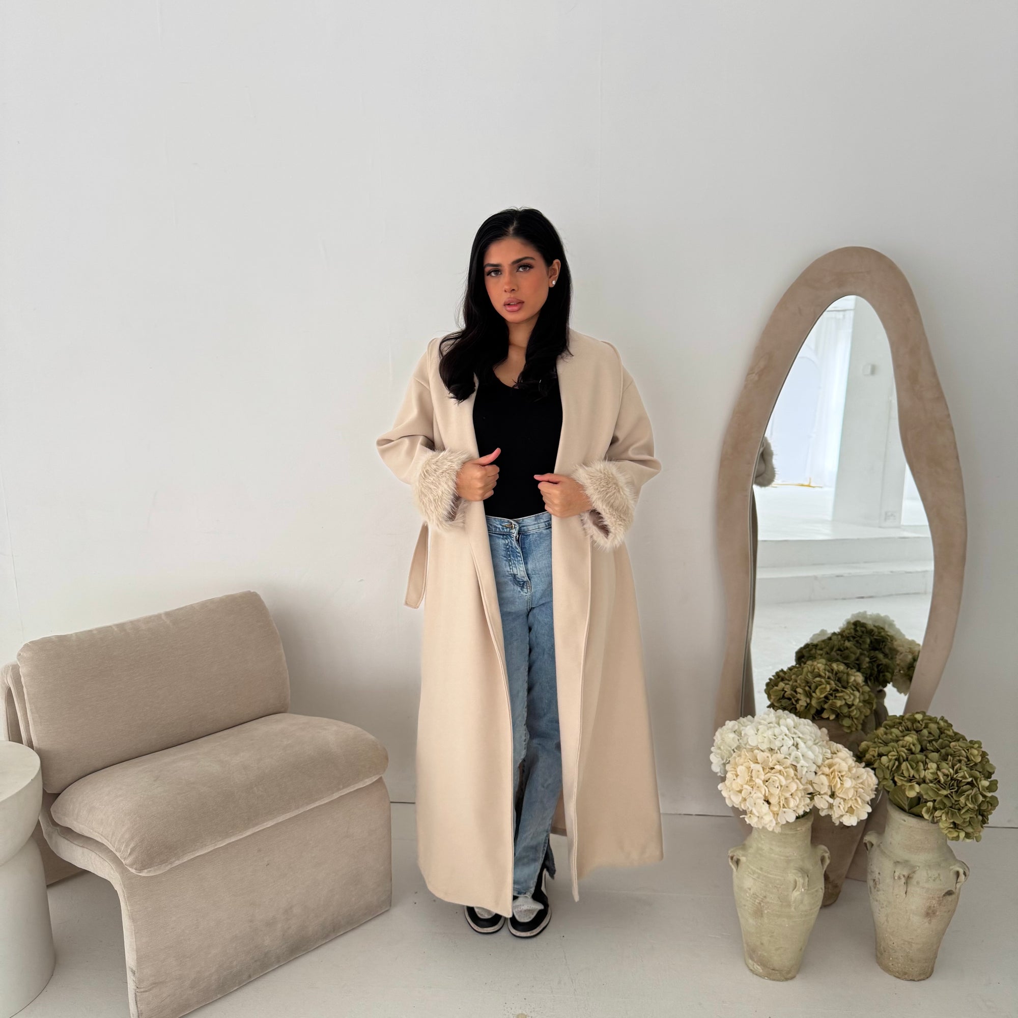 Mona Beige Fur Sleeve Belted Coat