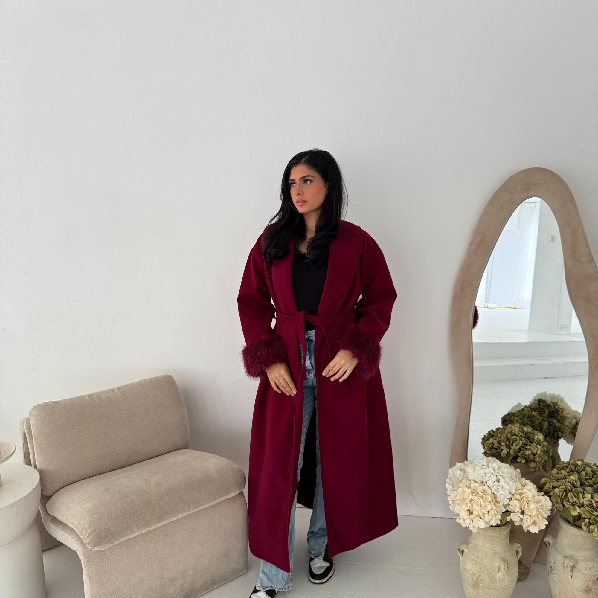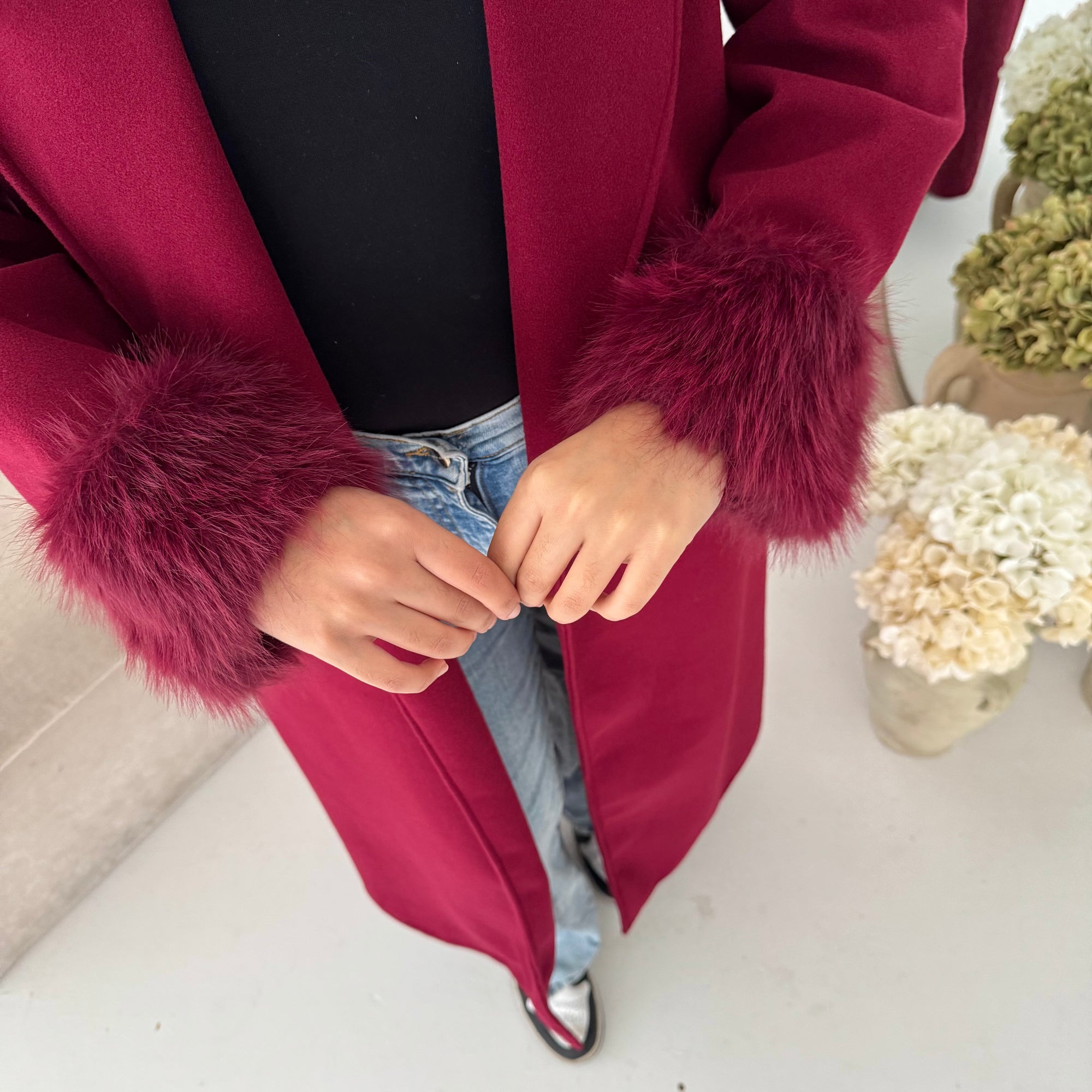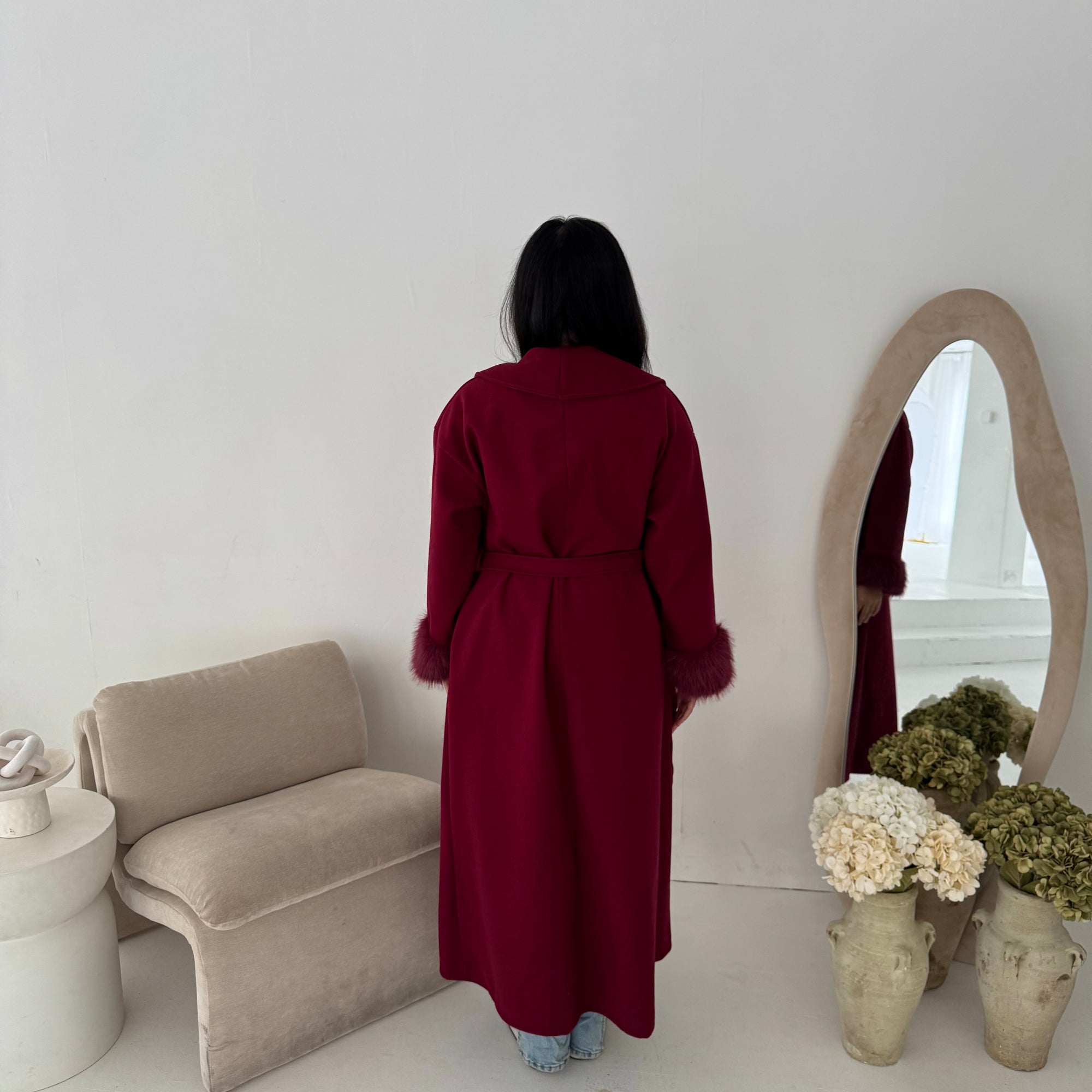 Mona Wine Fur Sleeve Belted Coat