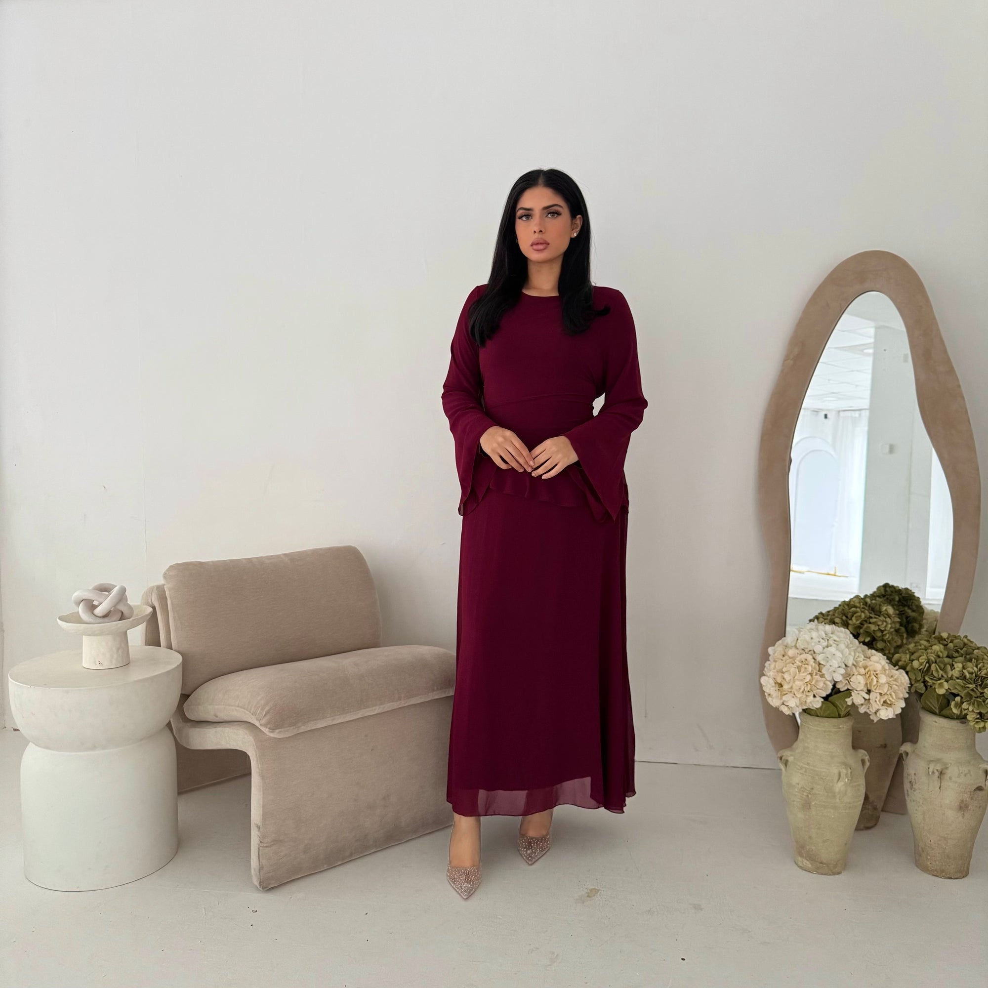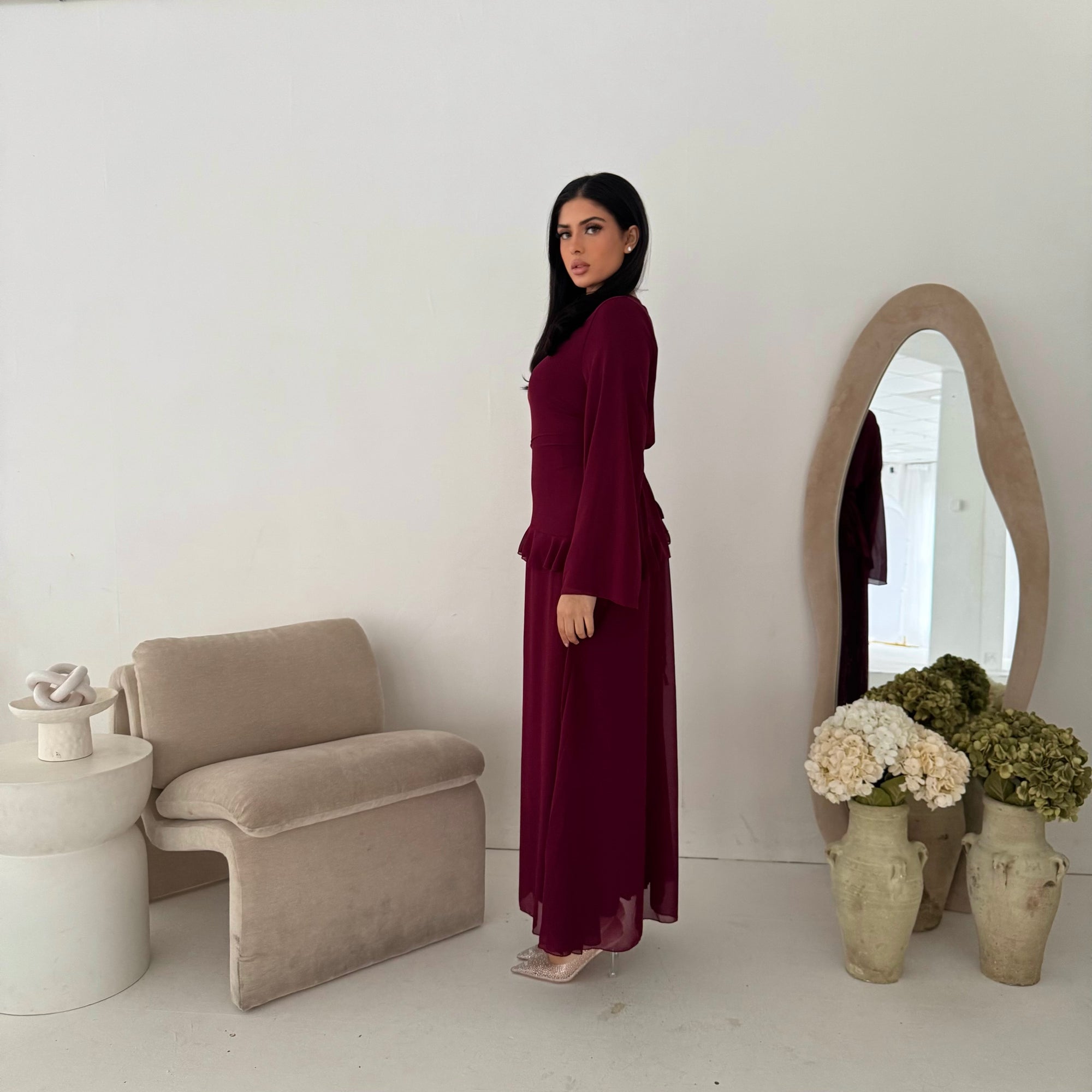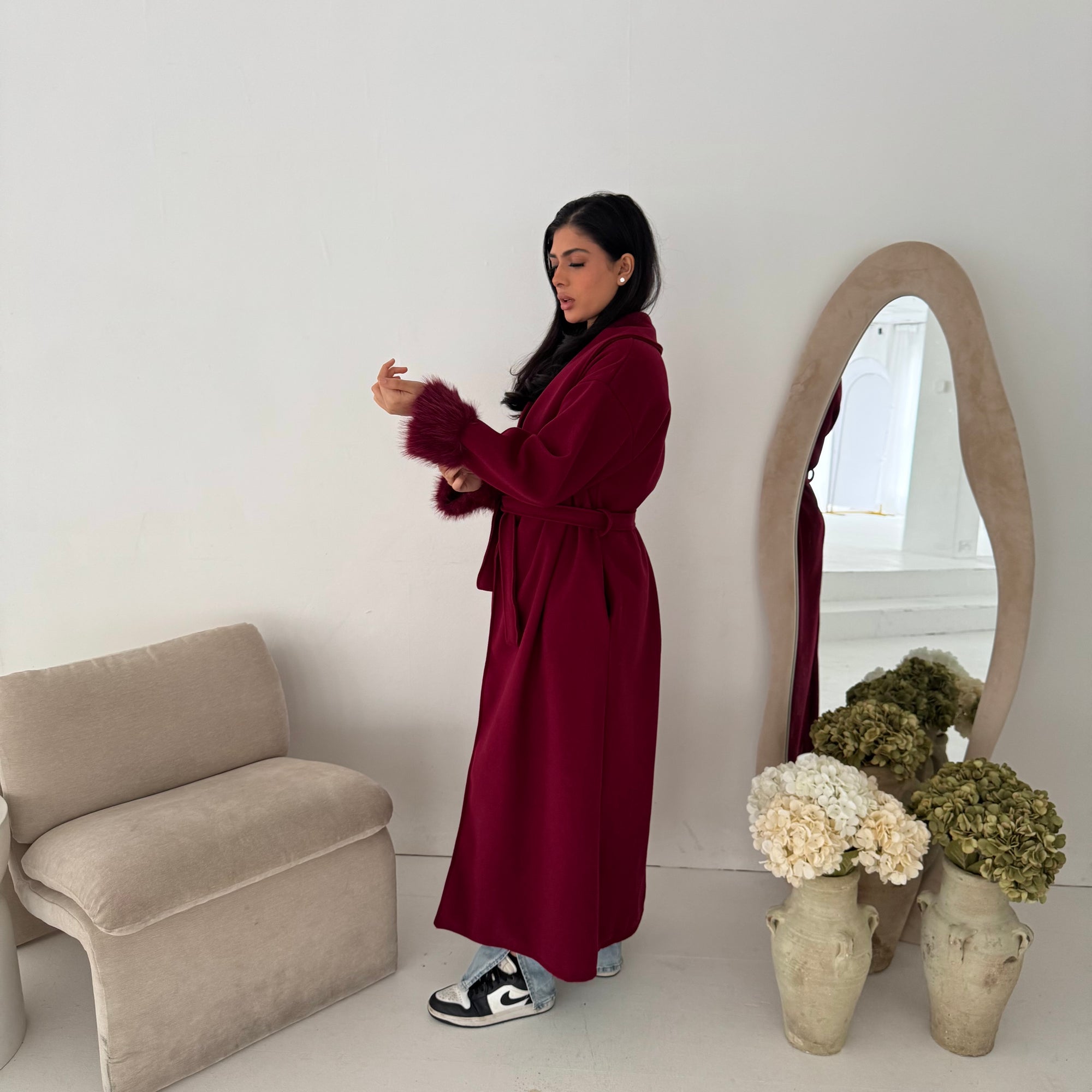 Mona Wine Fur Sleeve Belted Coat