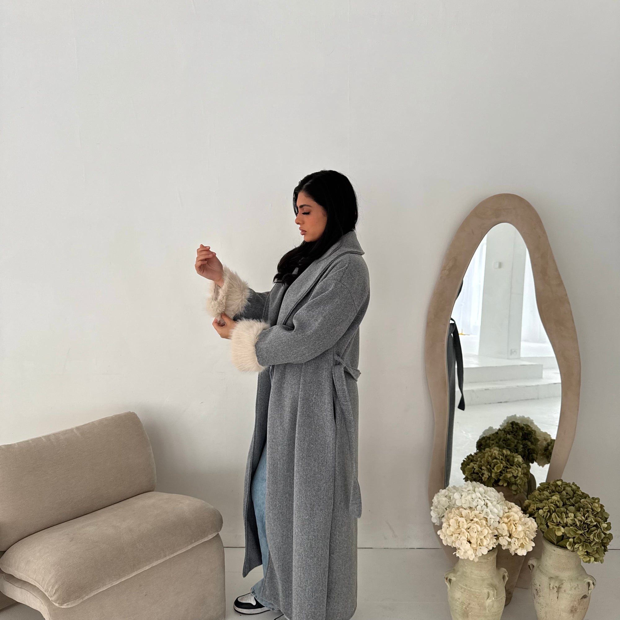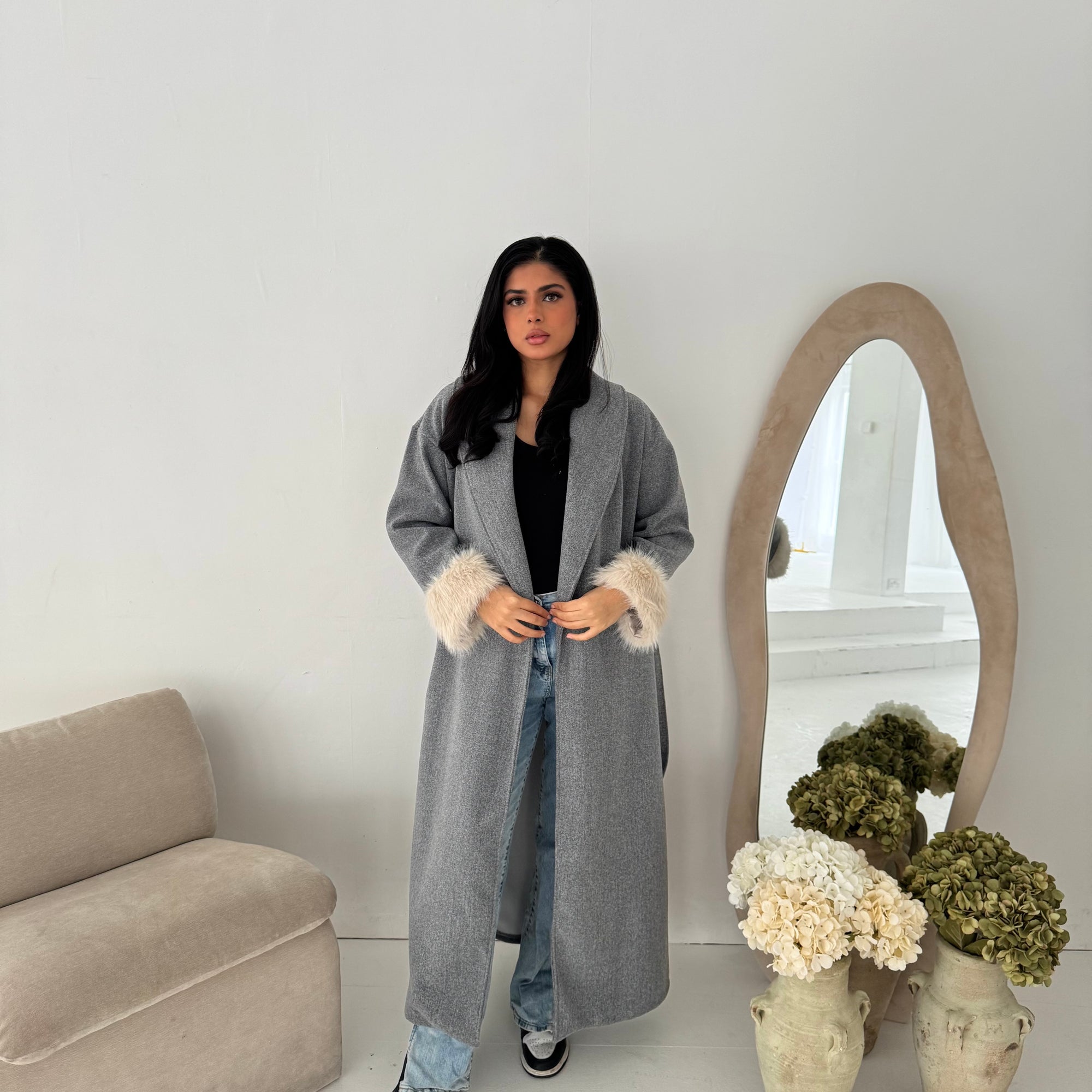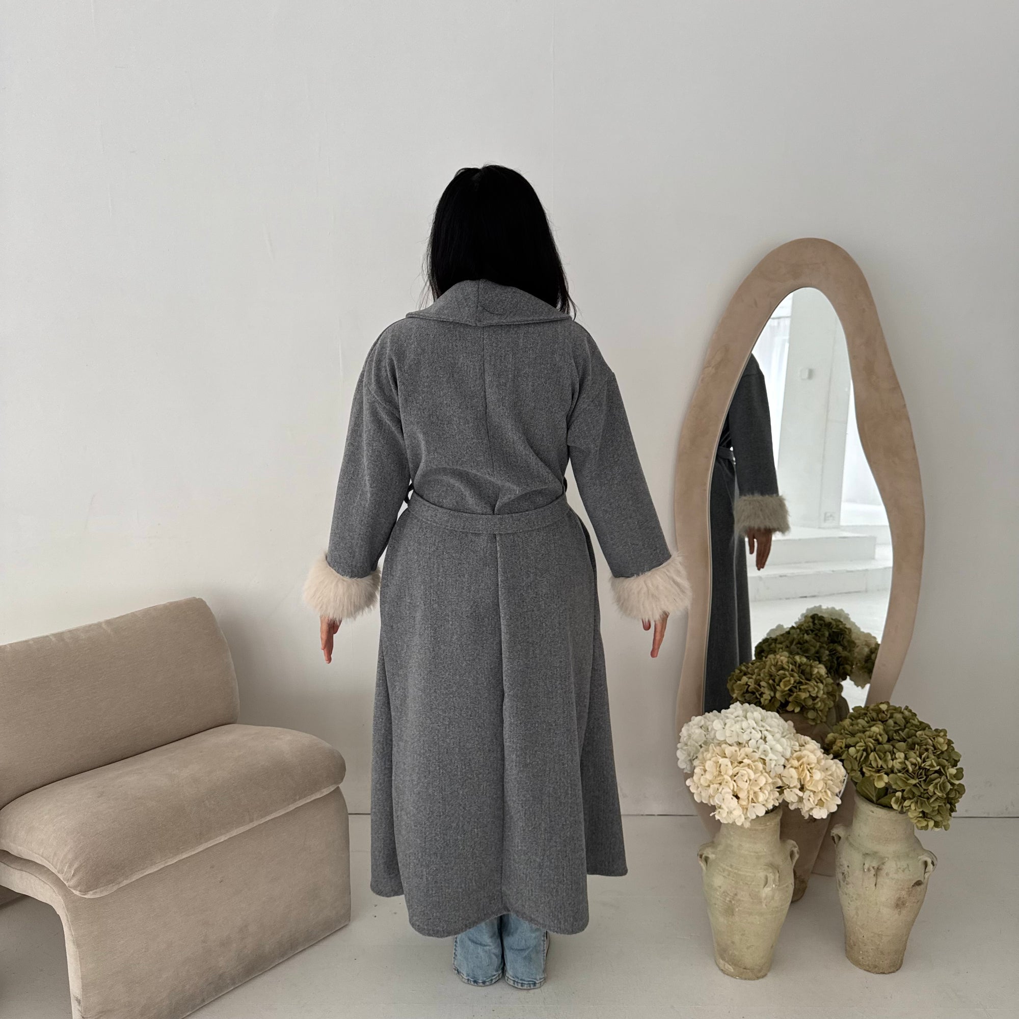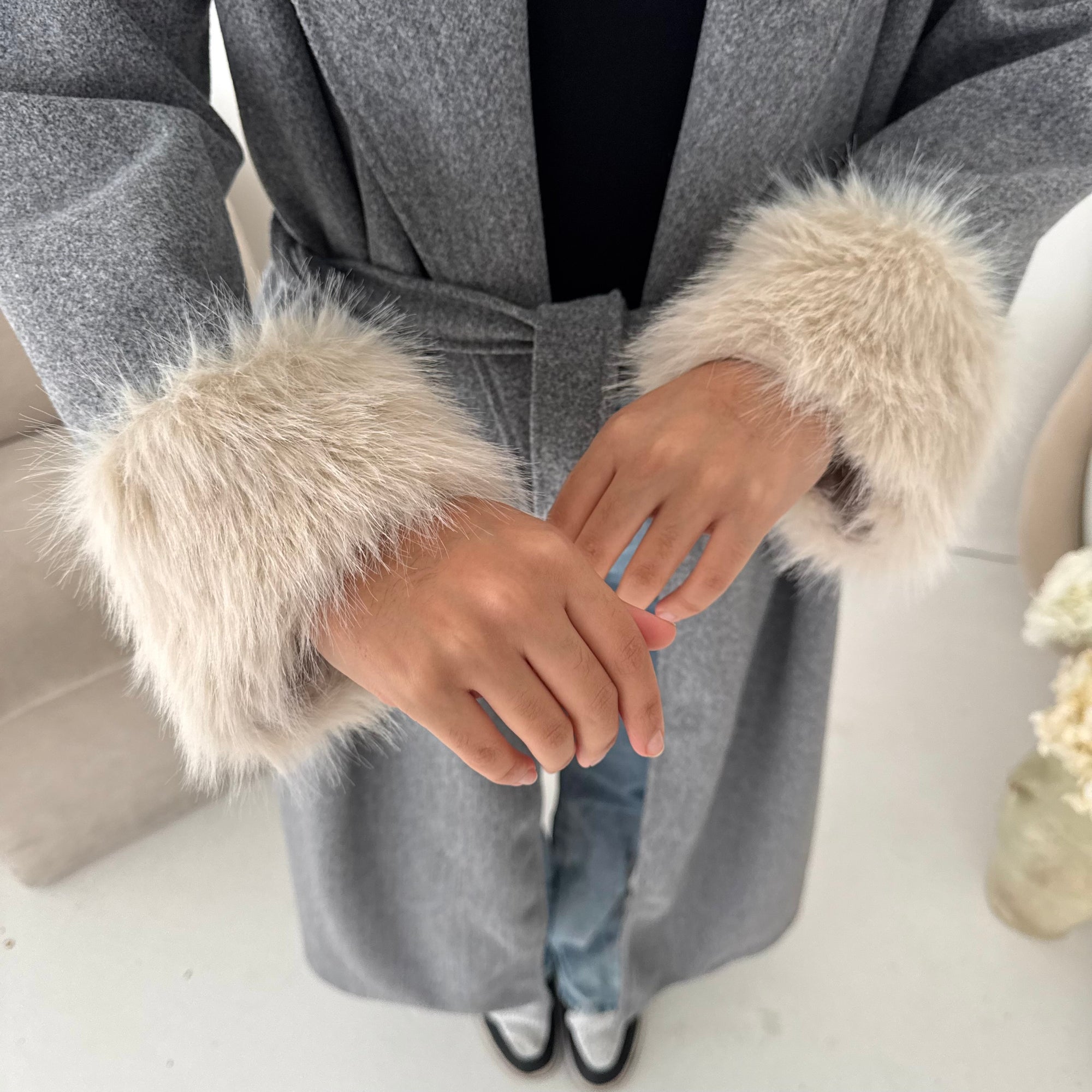 Mona Grey Fur Sleeve Belted Coat