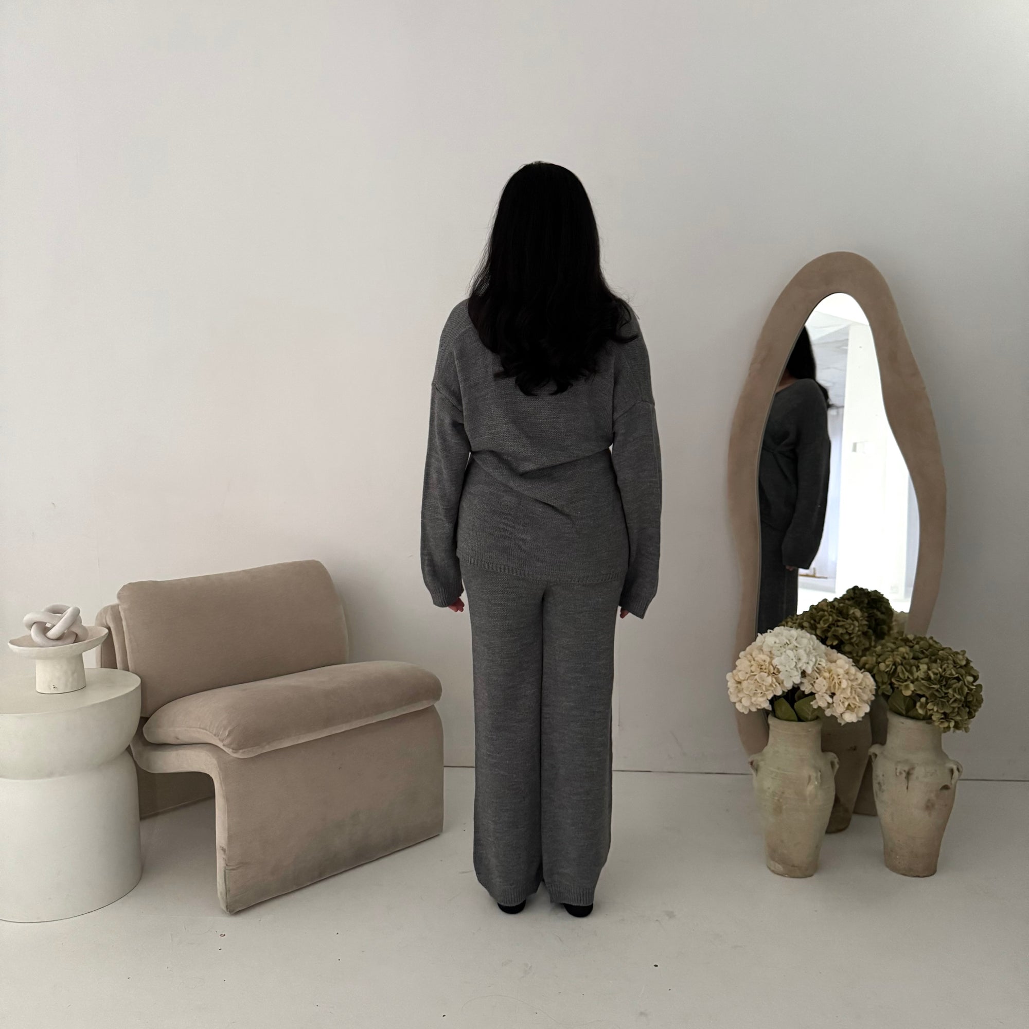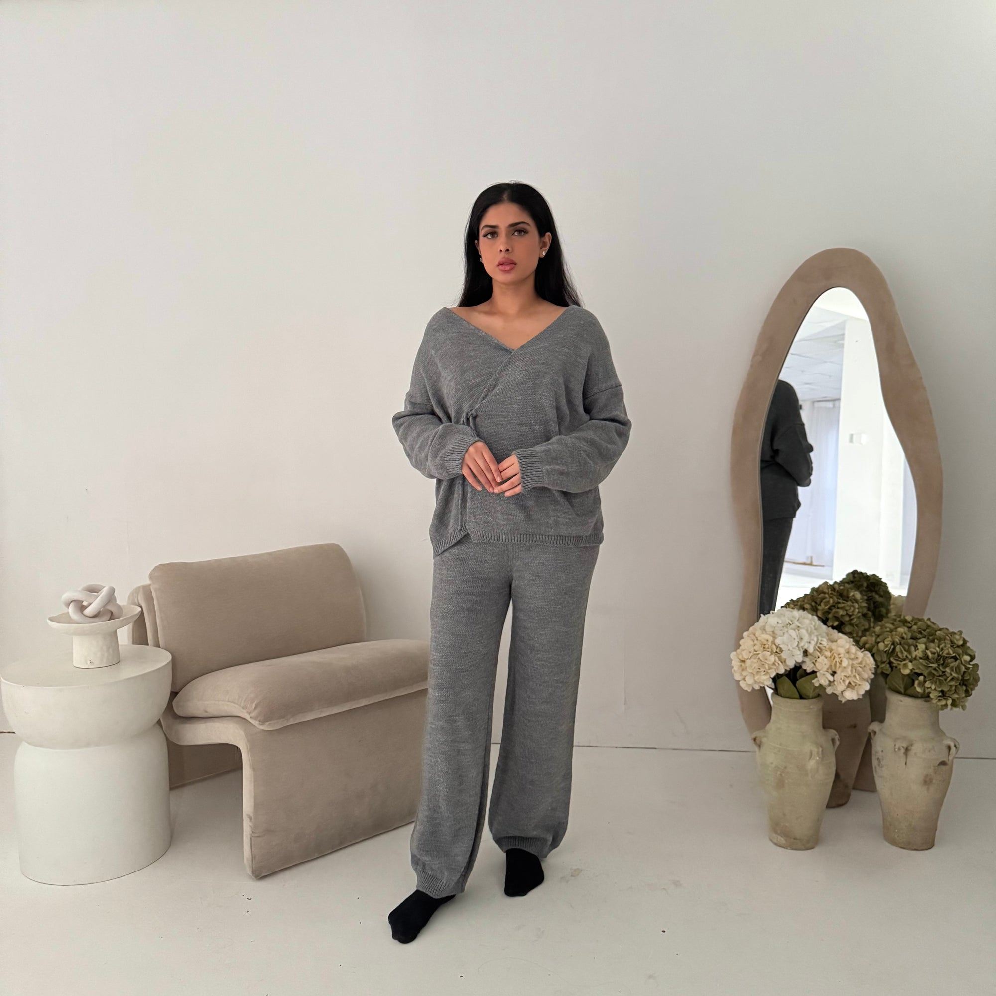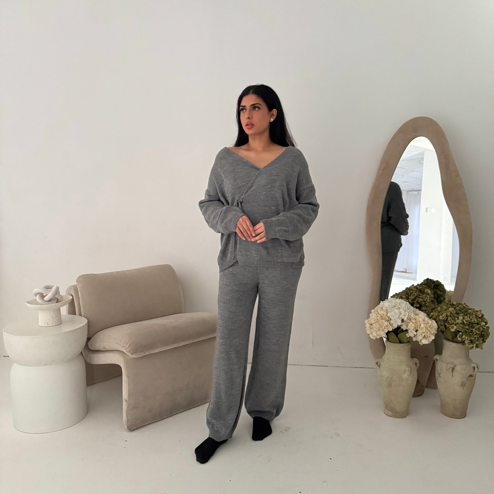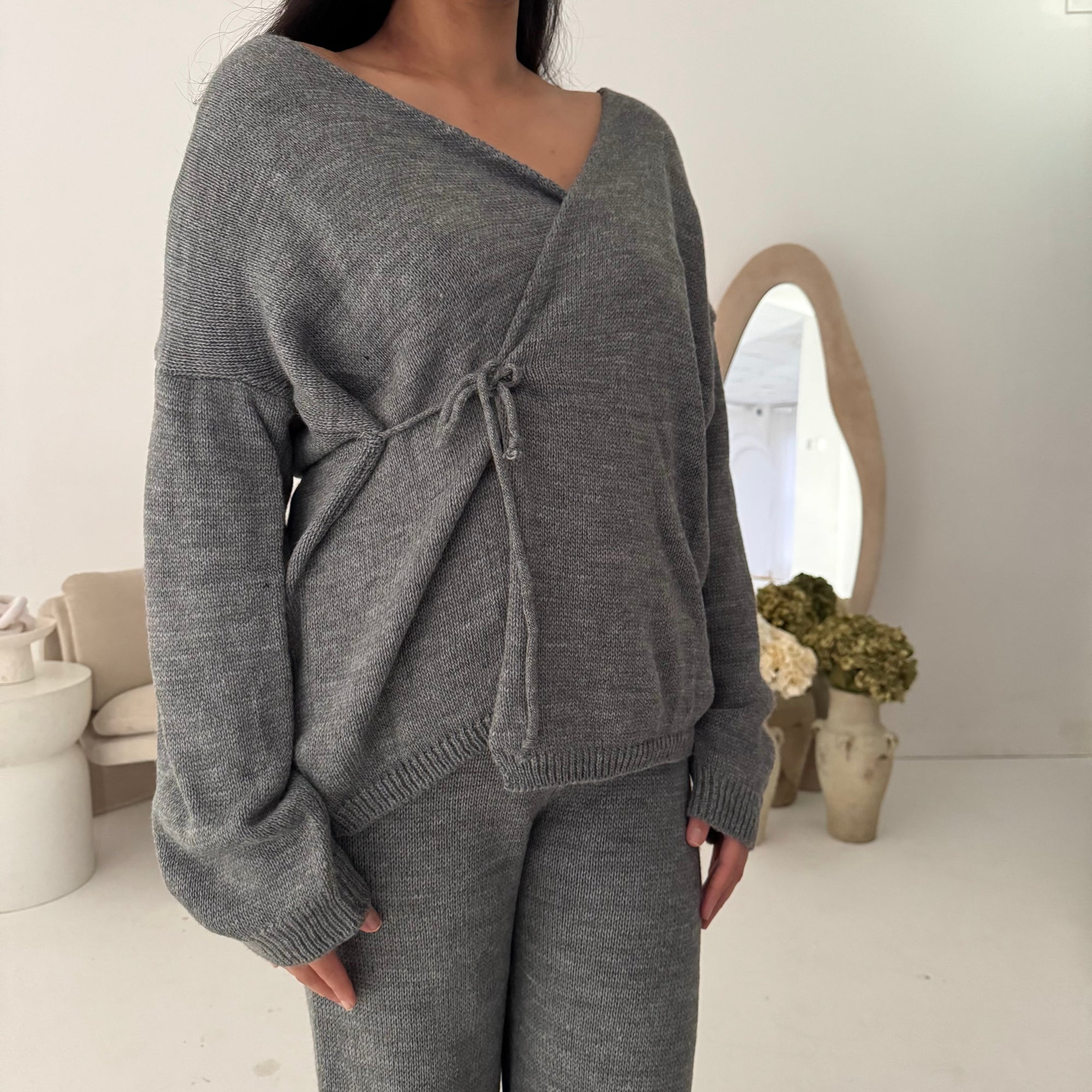 Harper Grey Plain Knitted Wrap Trouser Co Ord