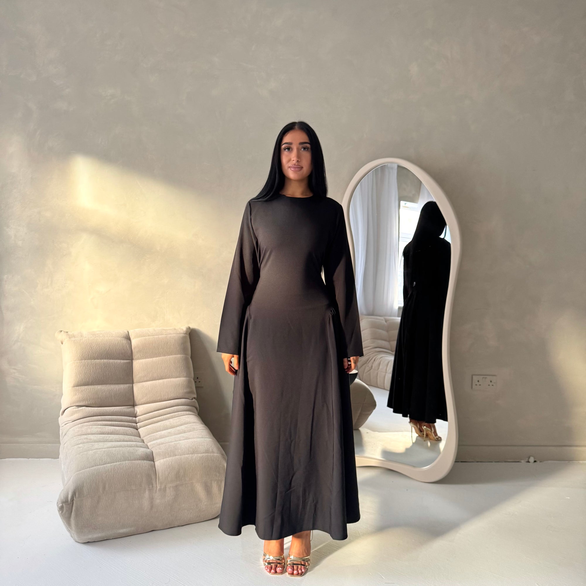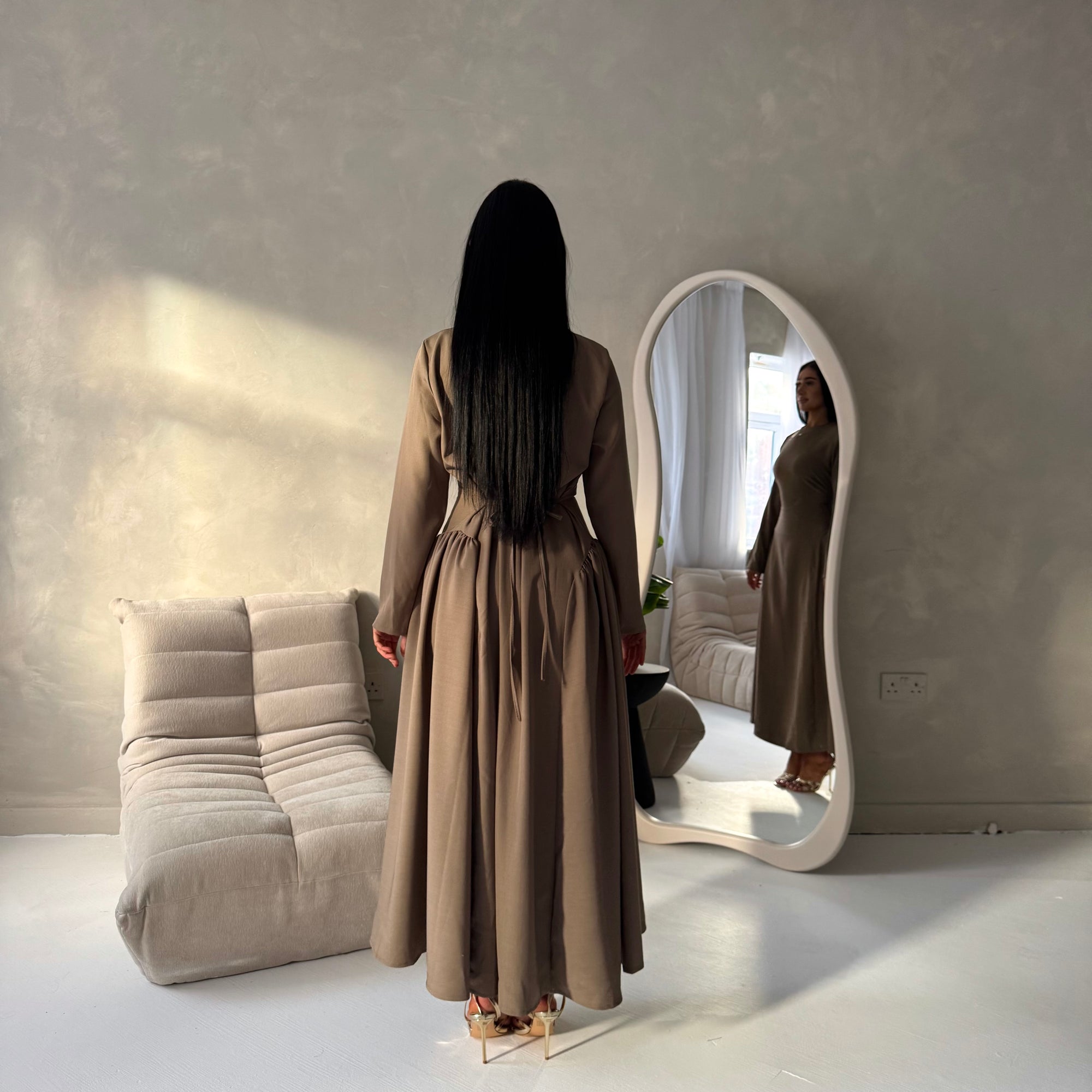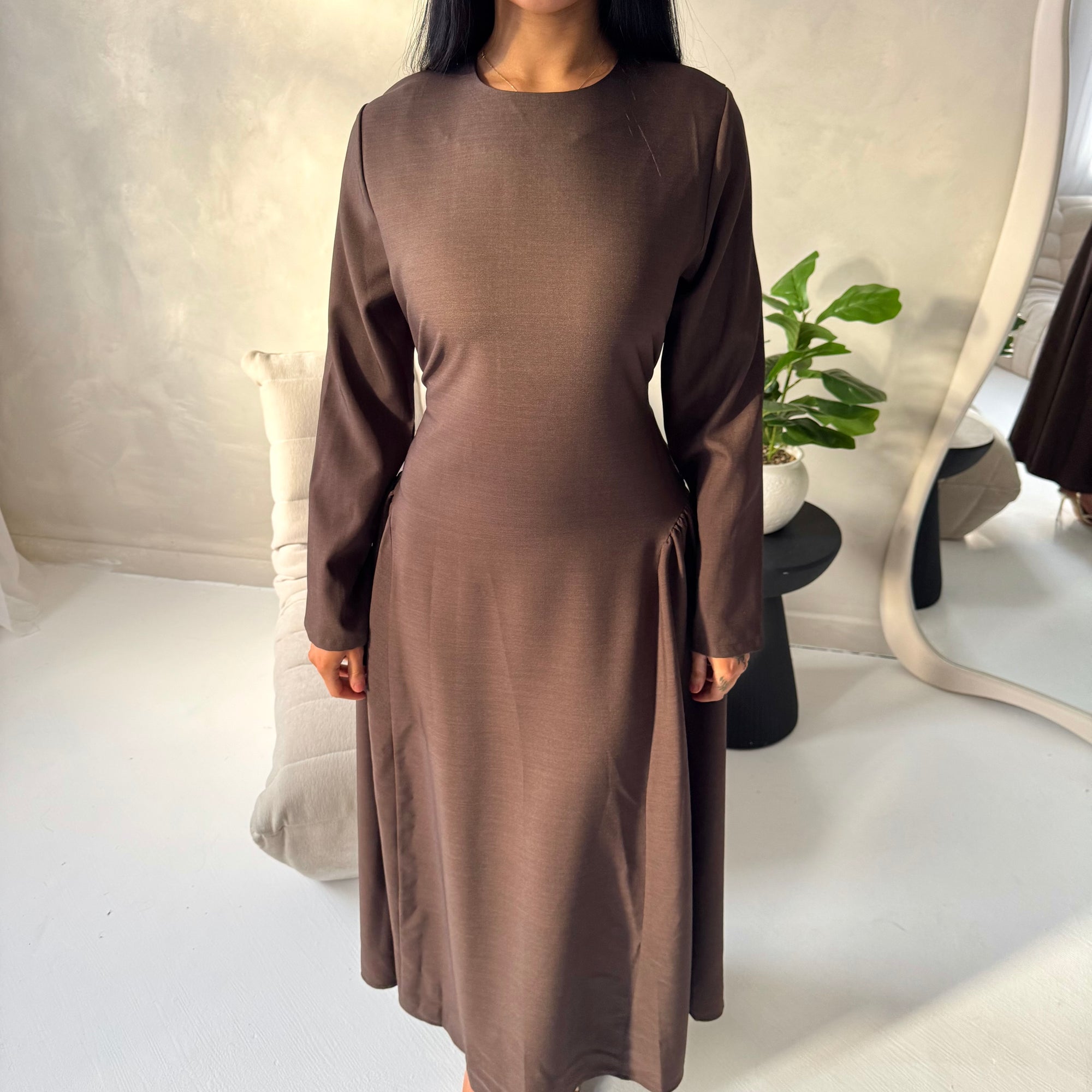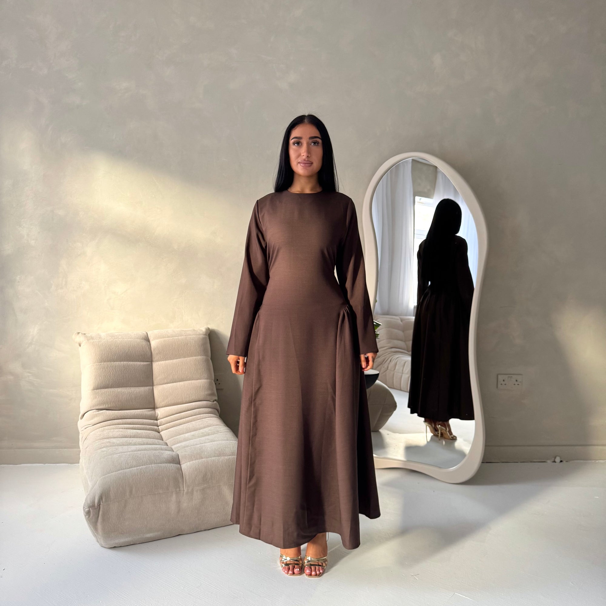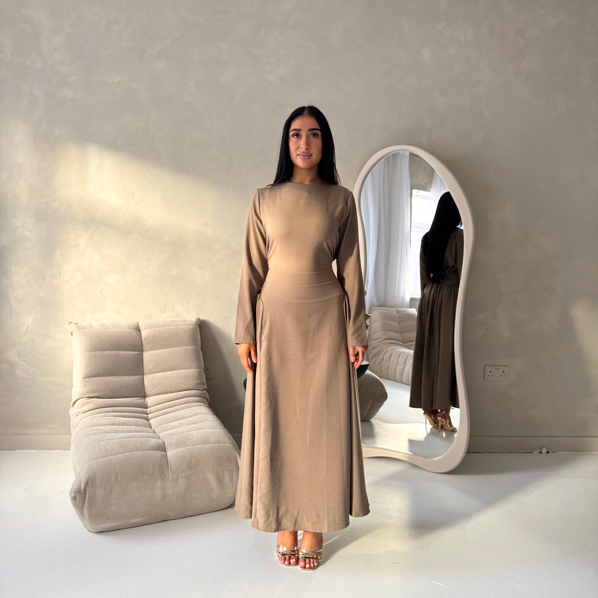 Marnia Mocha A Line Tie Back Side Gather Dress