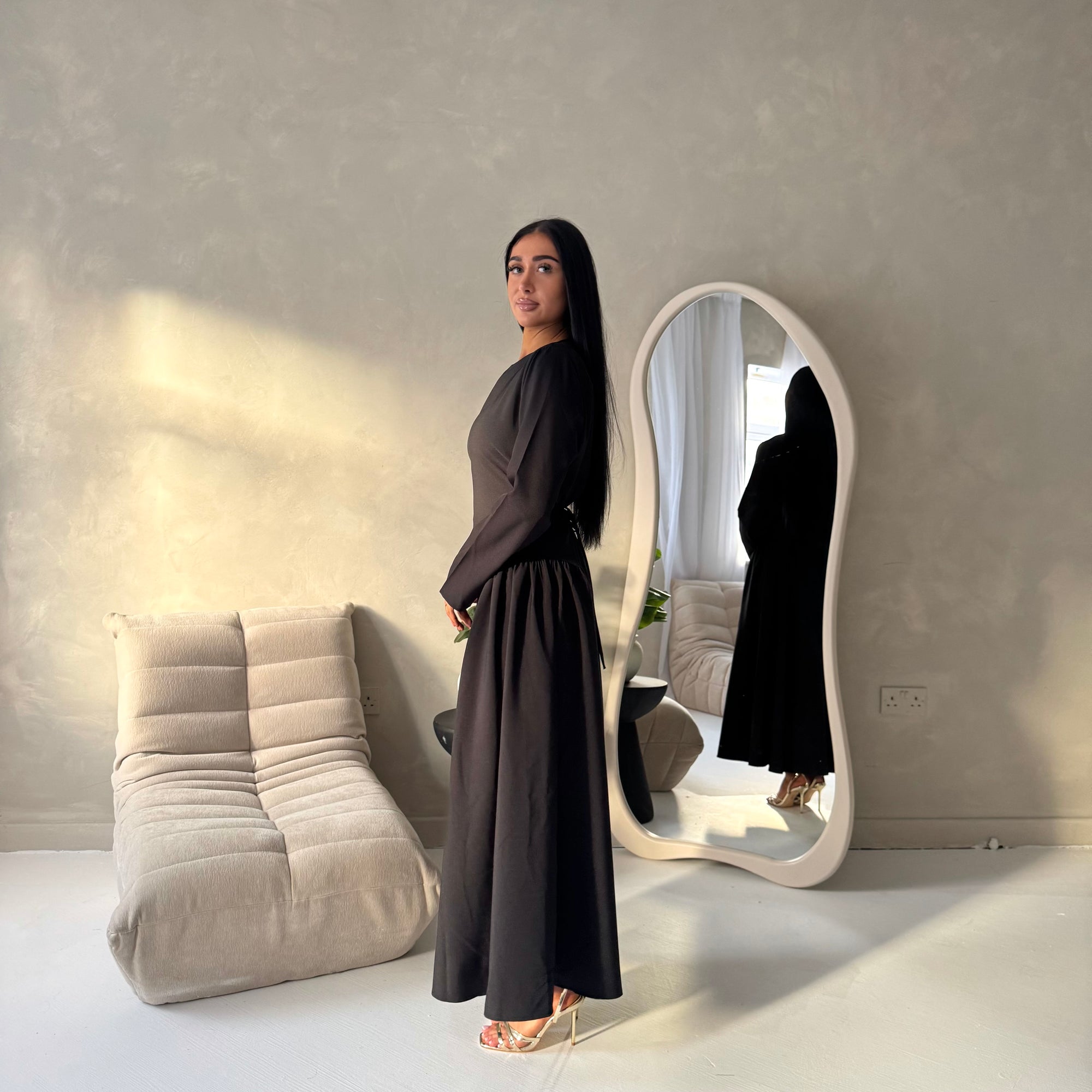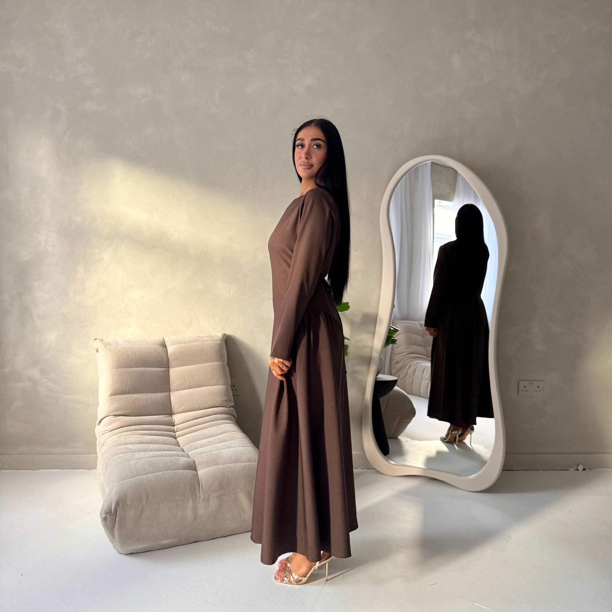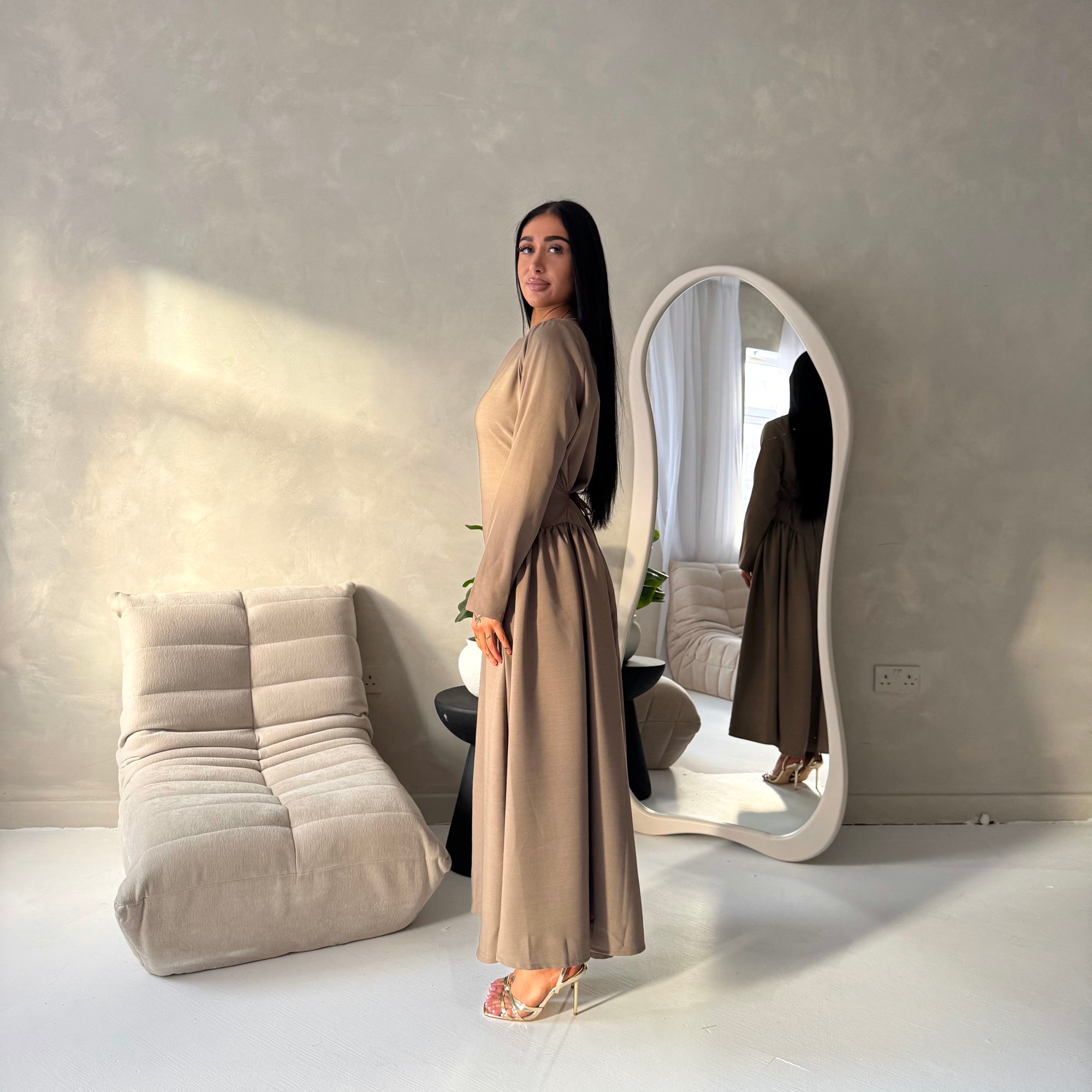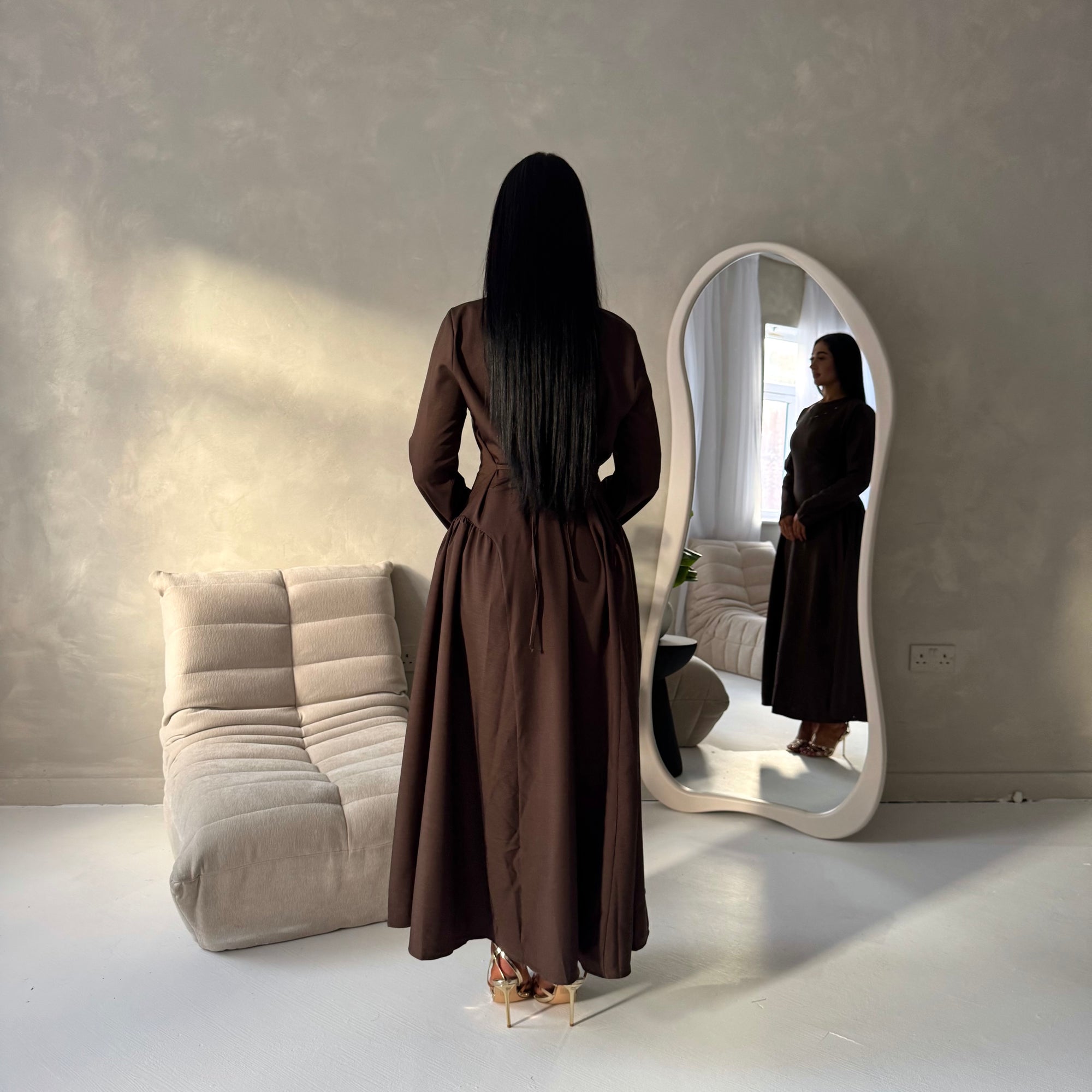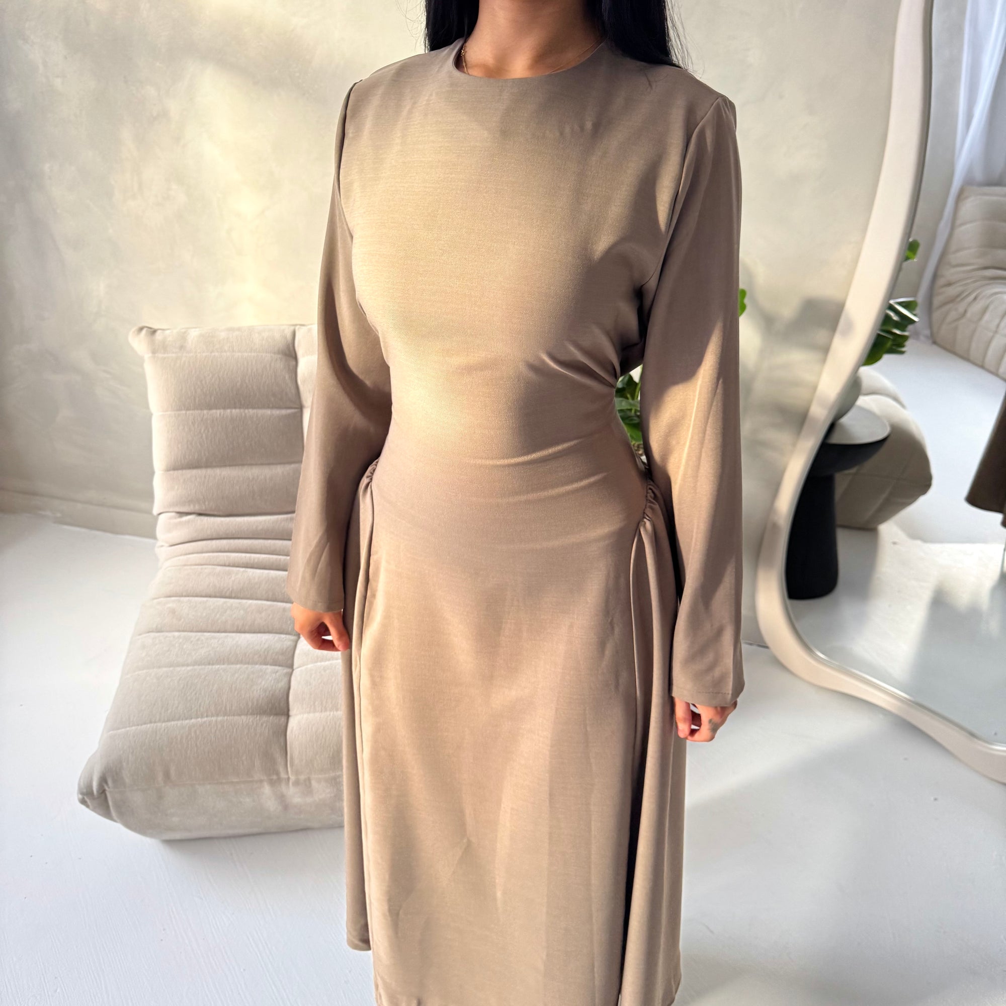 Marnia Mocha A Line Tie Back Side Gather Dress