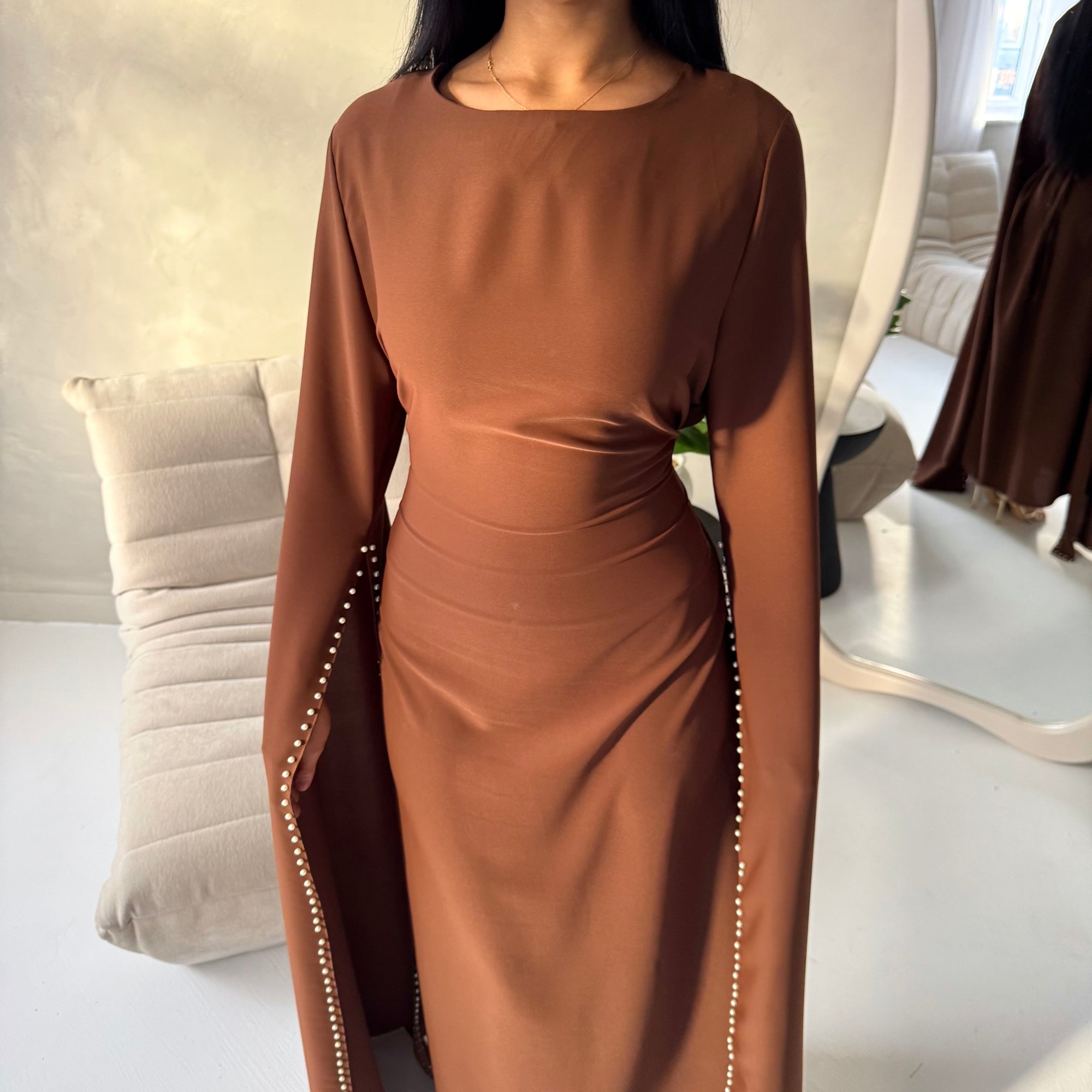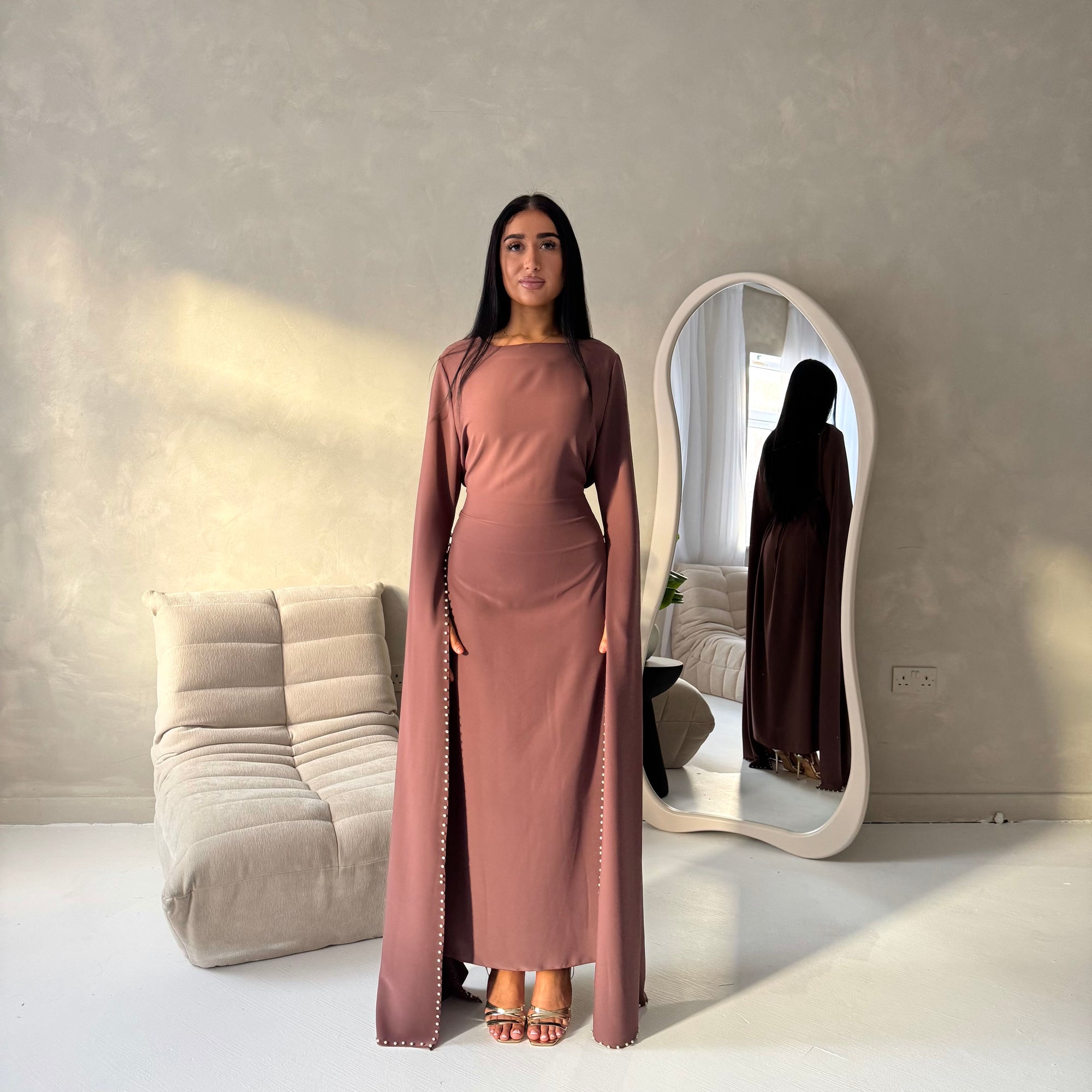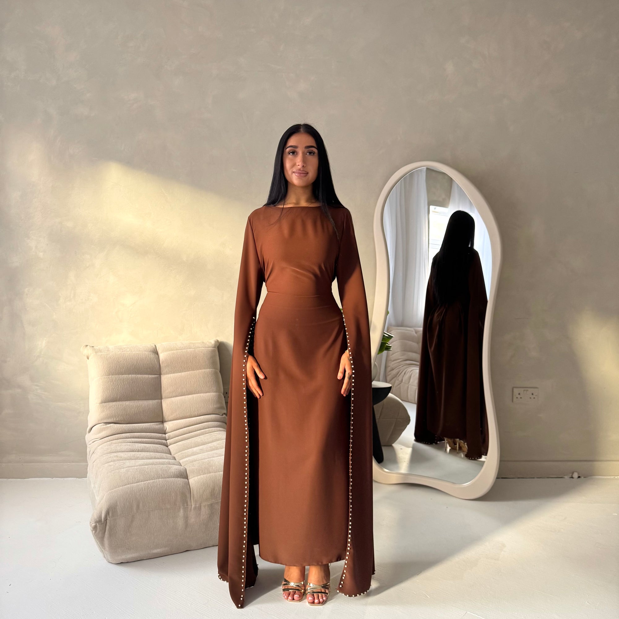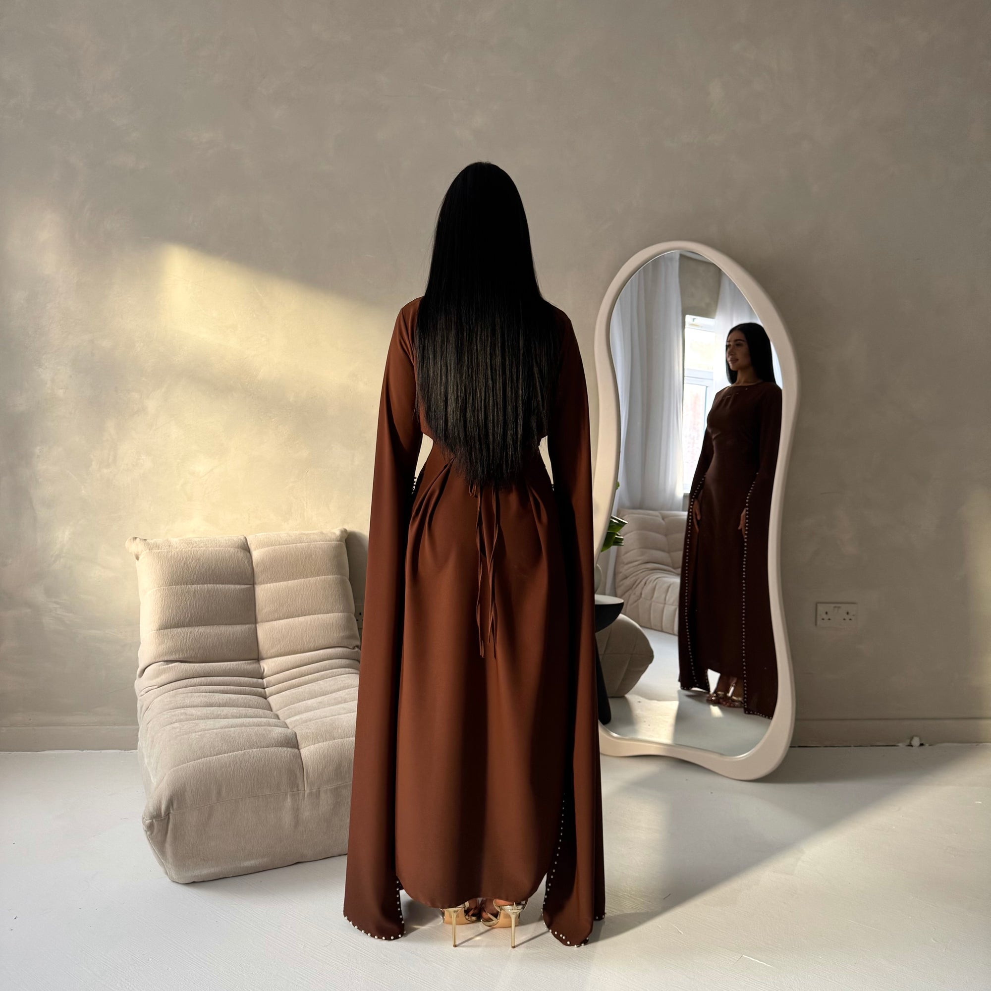 Sisi Brown Pearl Detail Cape Sleeve Tie Back Dress