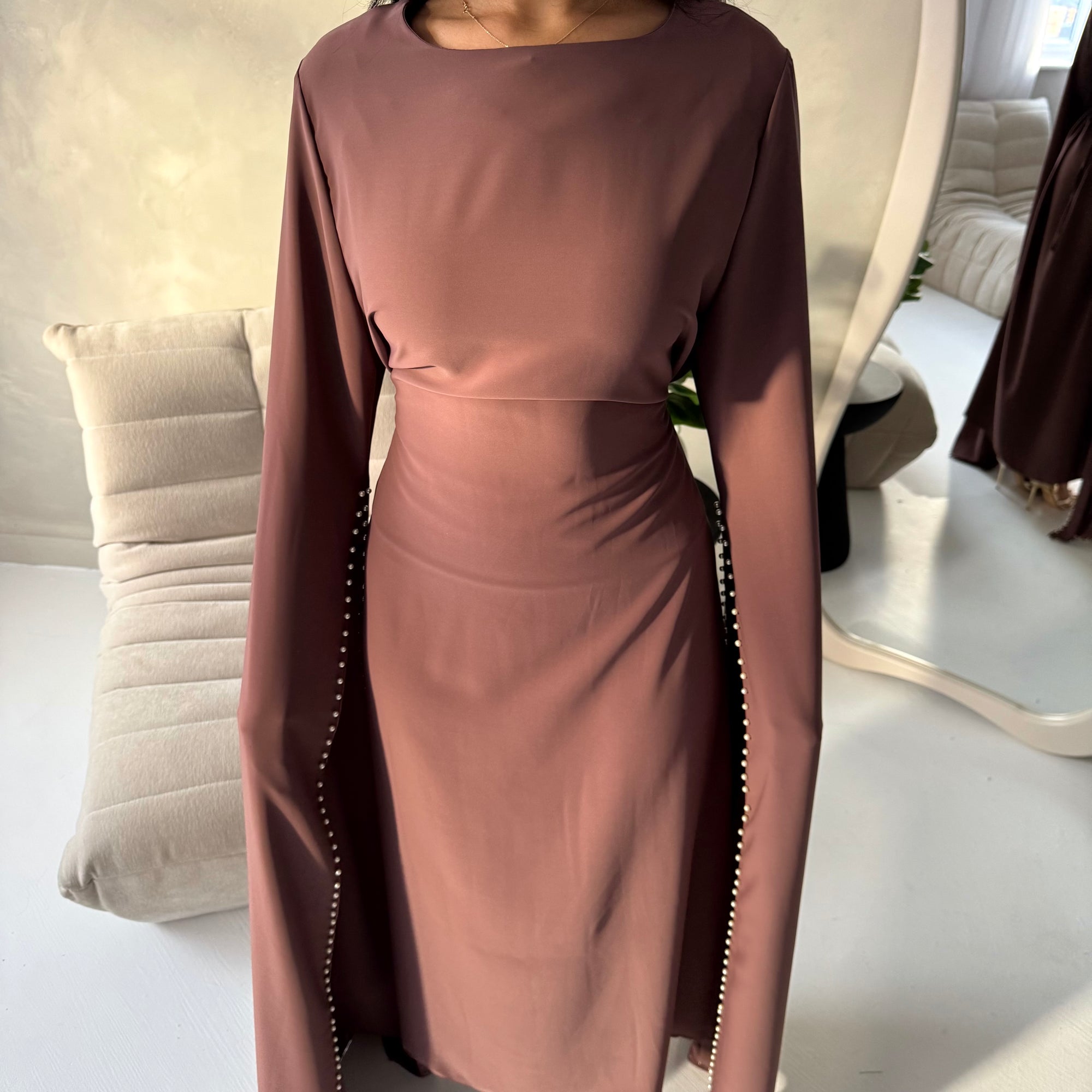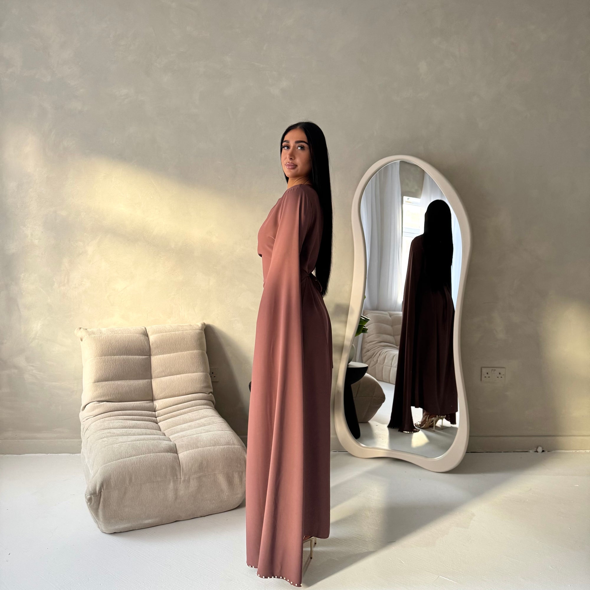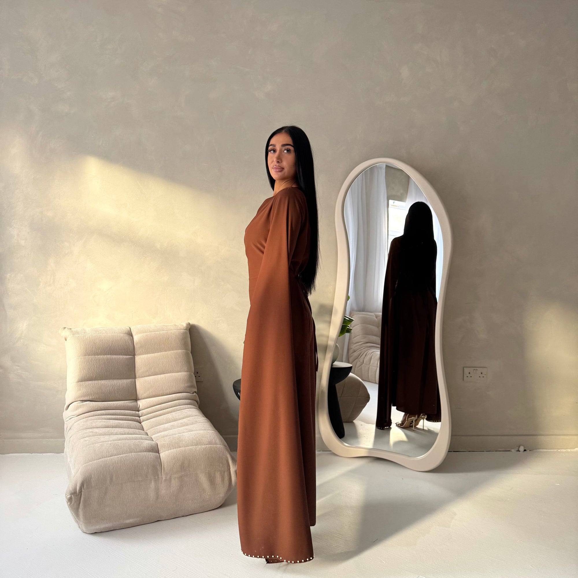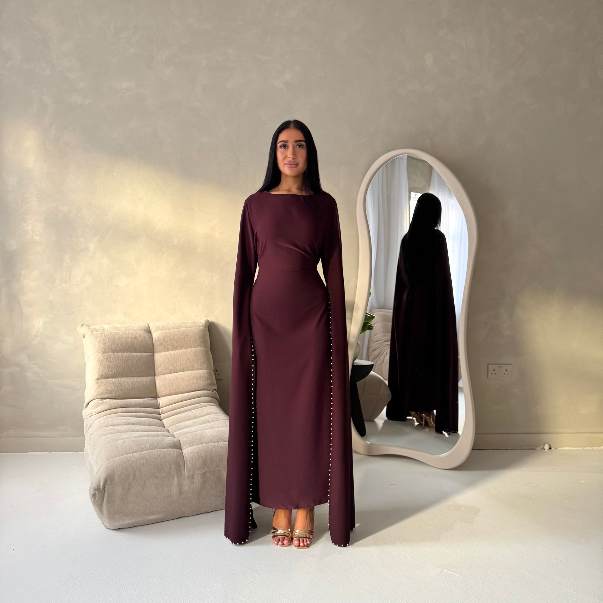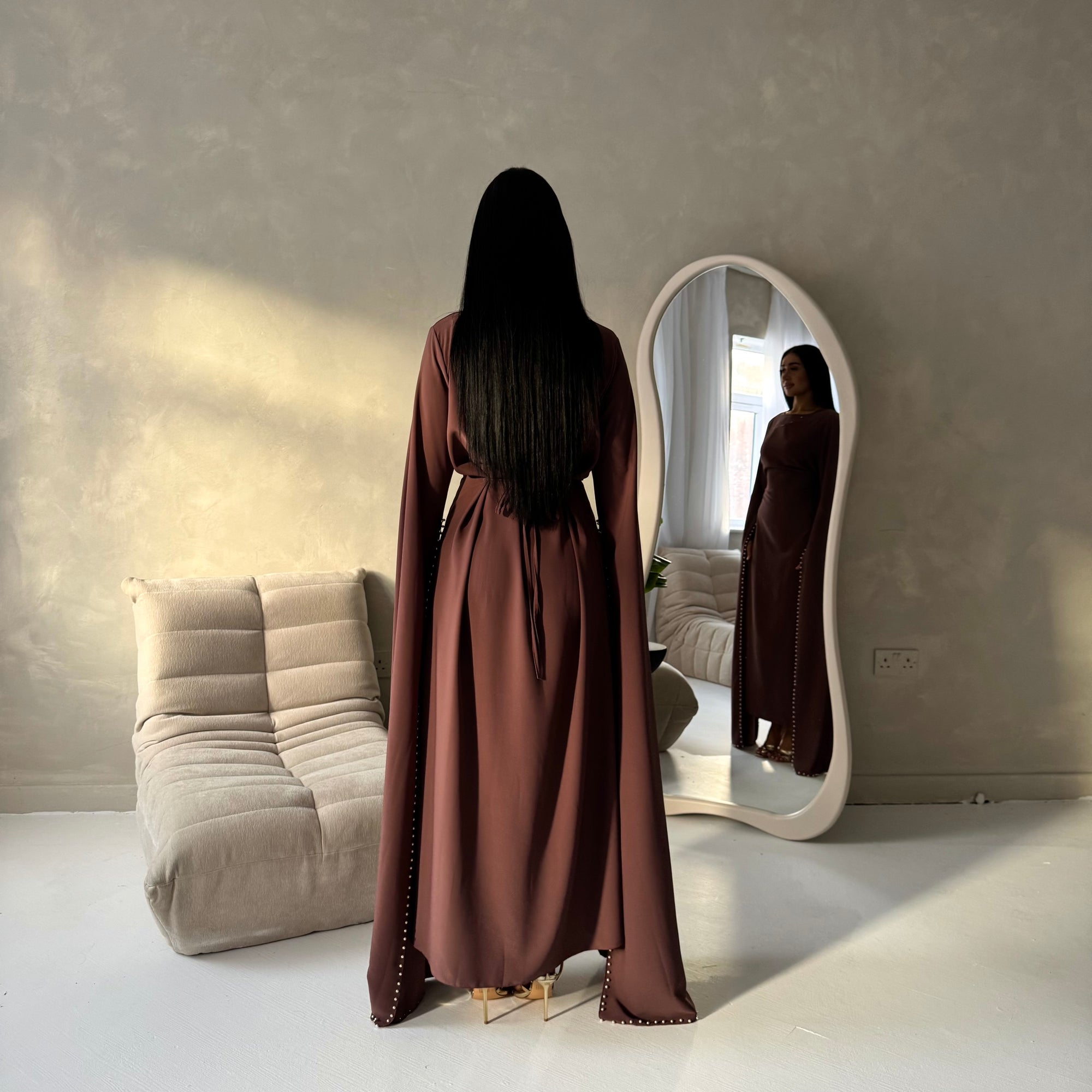 Sisi Brown Pearl Detail Cape Sleeve Tie Back Dress