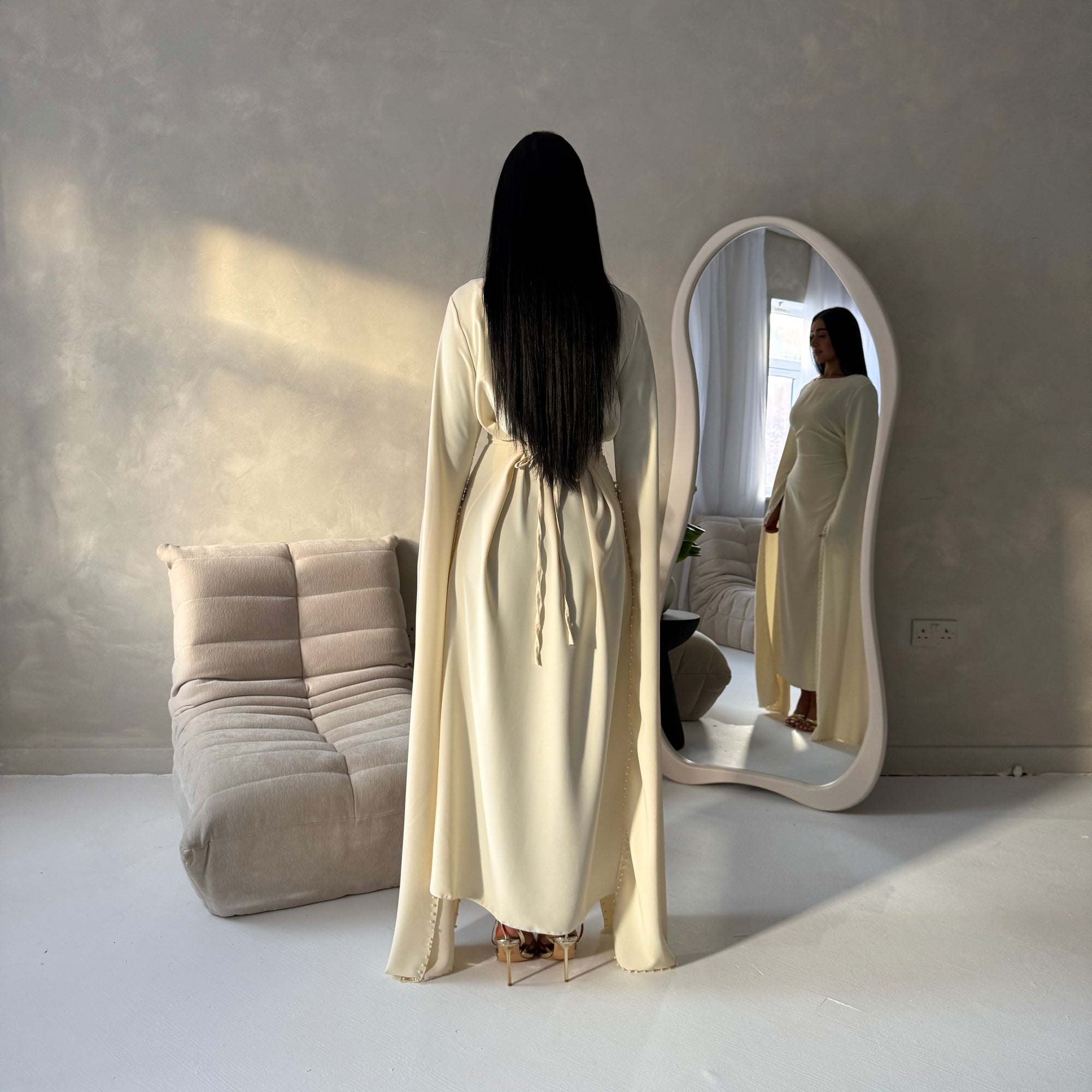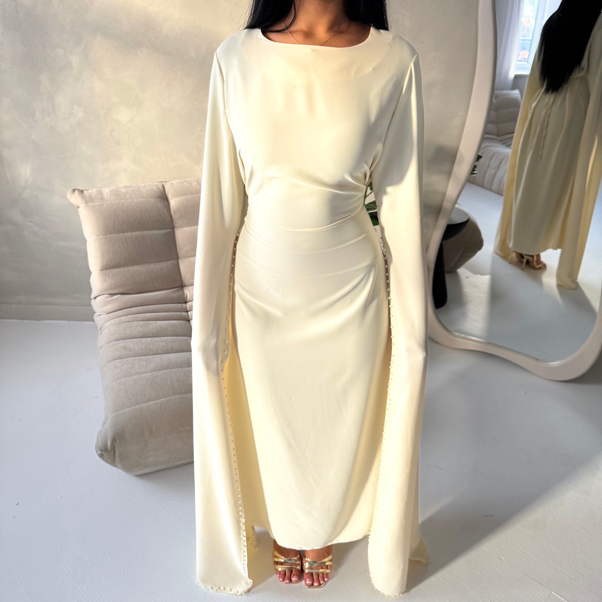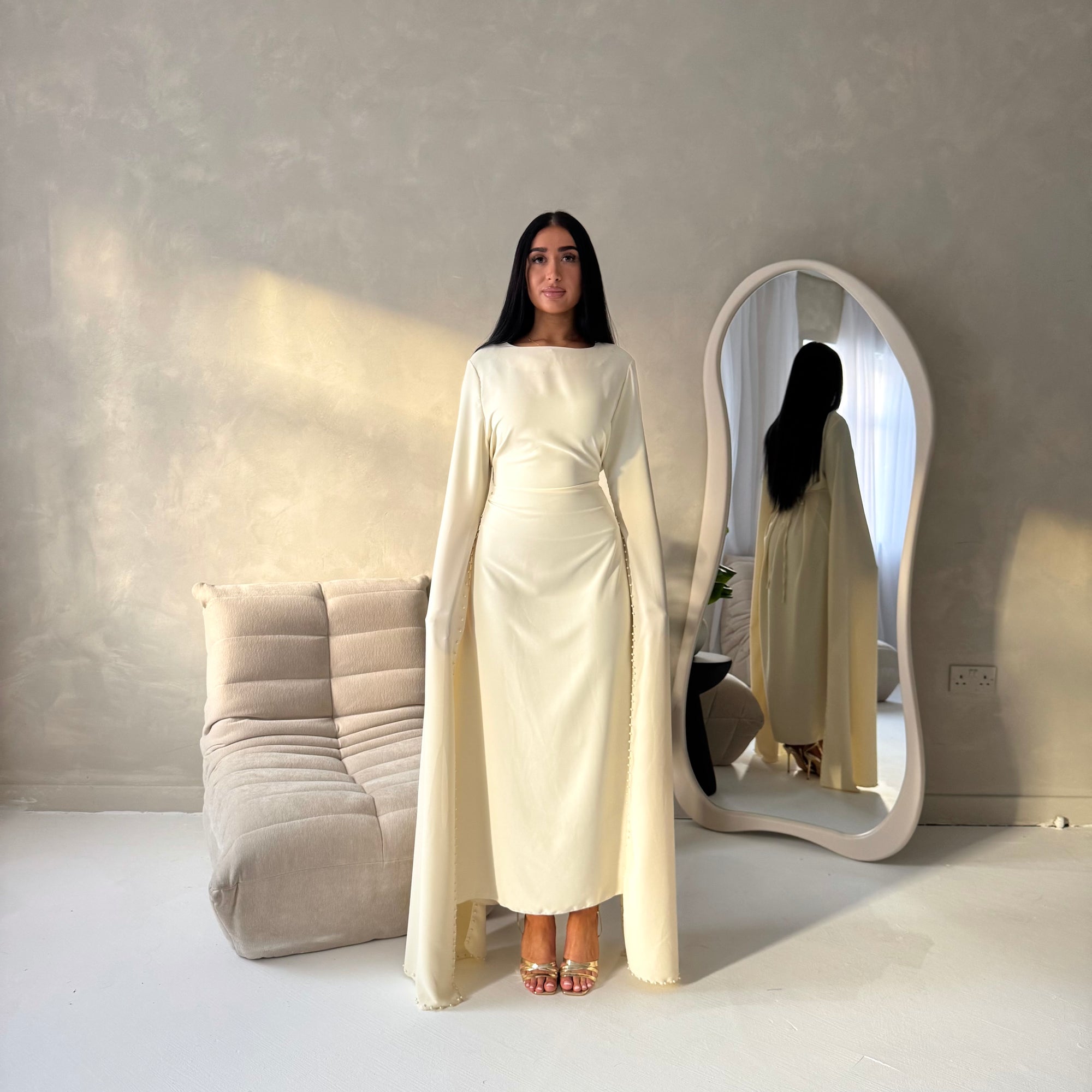 Sisi Cream Pearl Detail Cape Sleeve Tie Back Dress