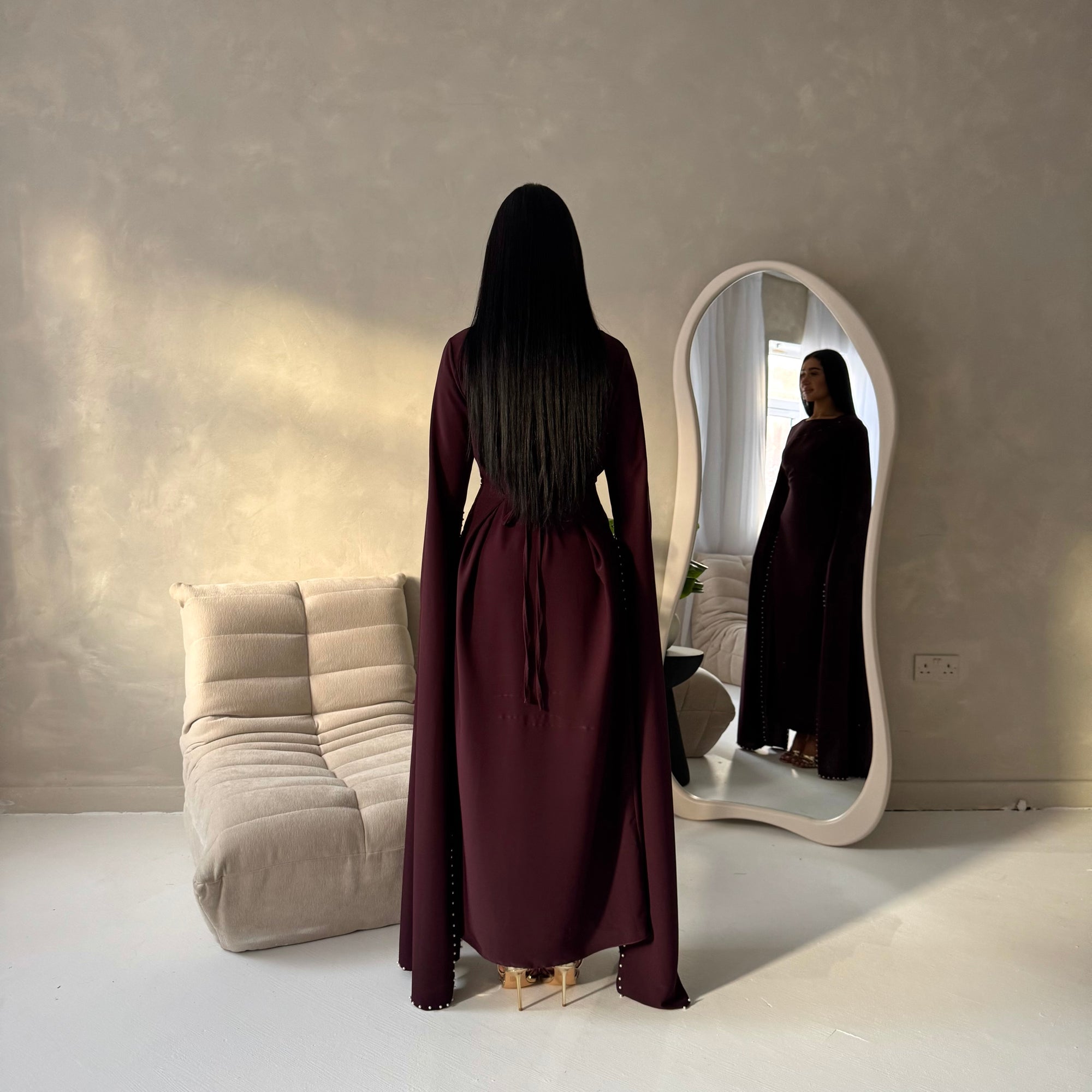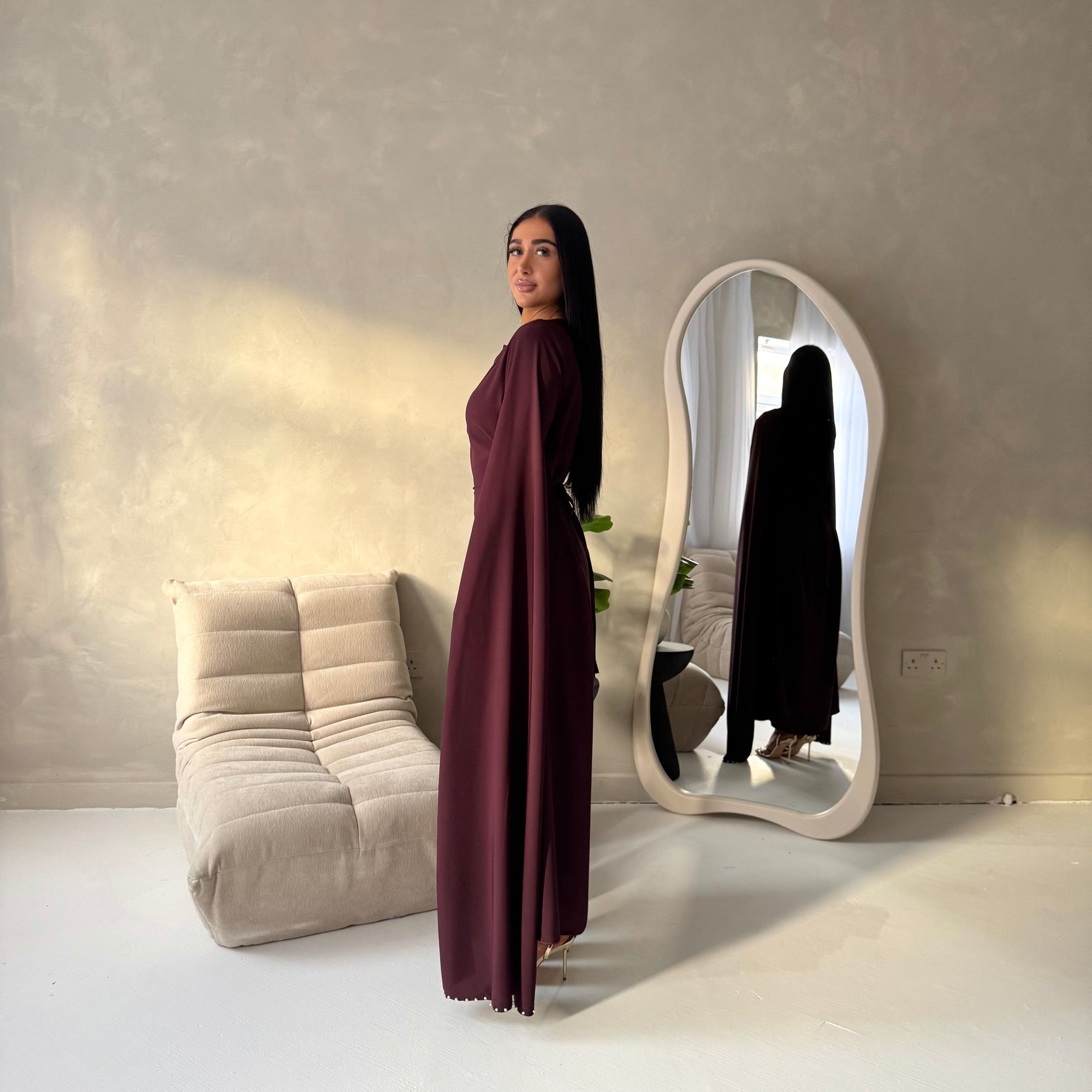 Sisi Plum Pearl Detail Cape Sleeve Tie Back Dress