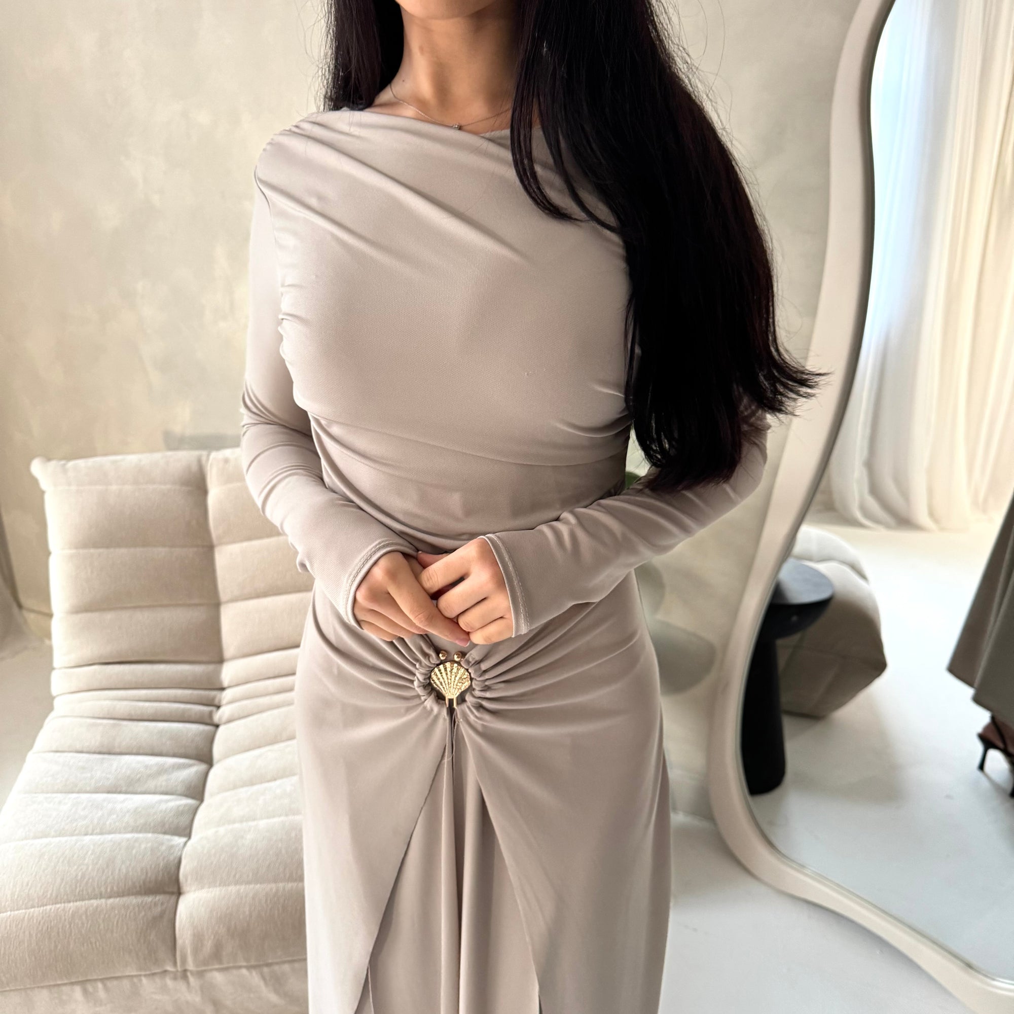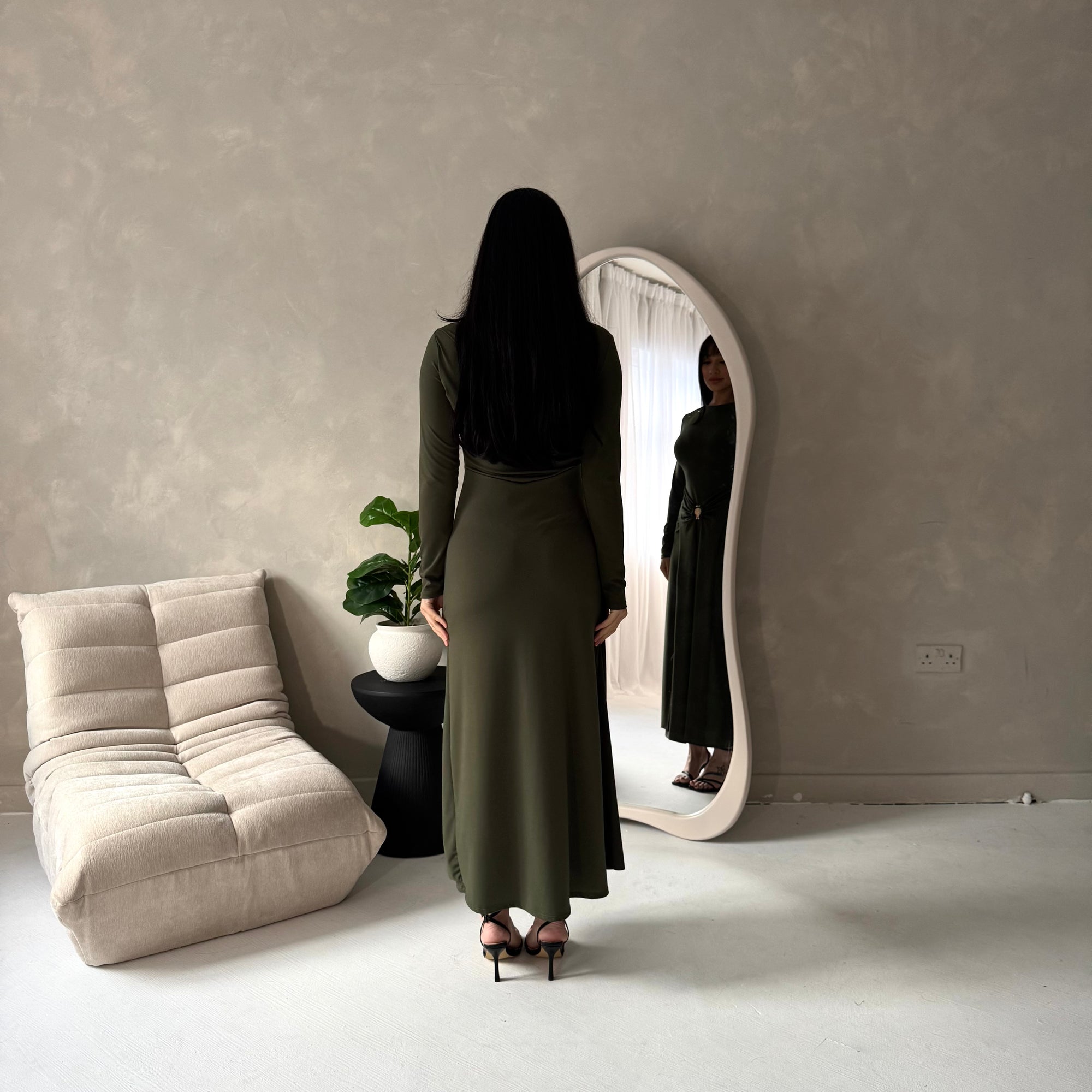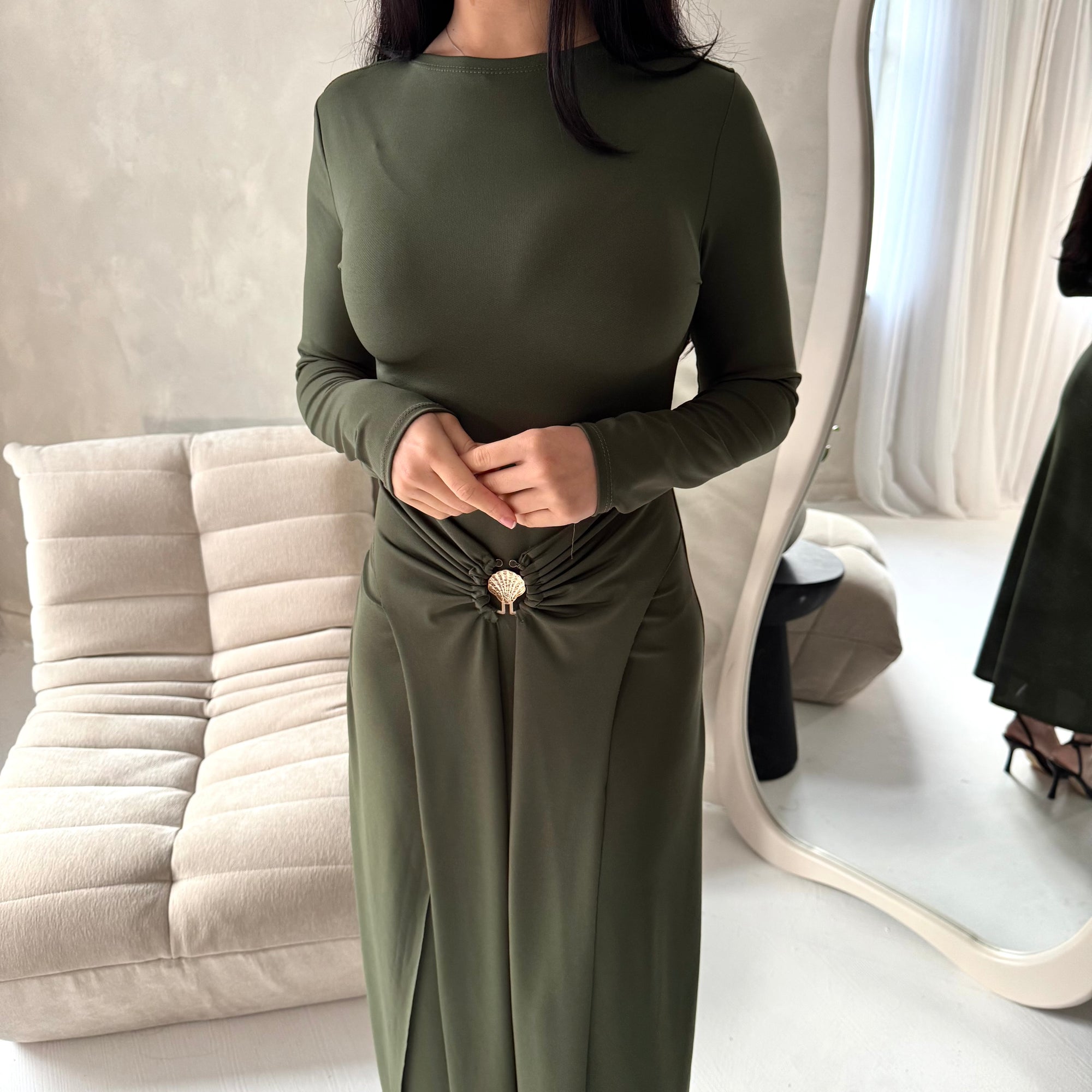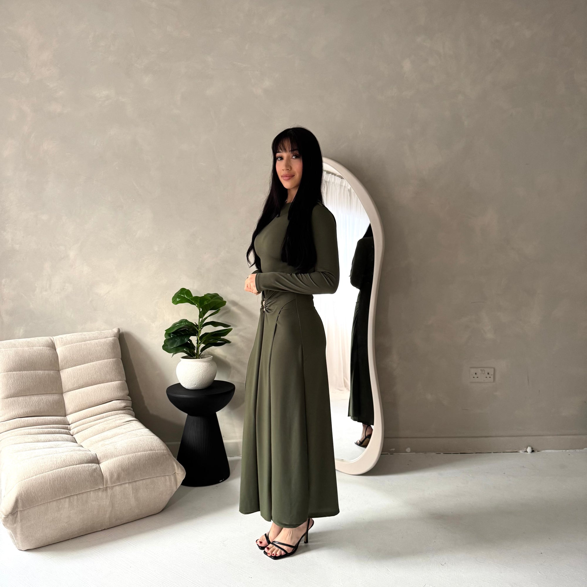 Alayna Khaki Soft Gold Buckle Modest Dress
