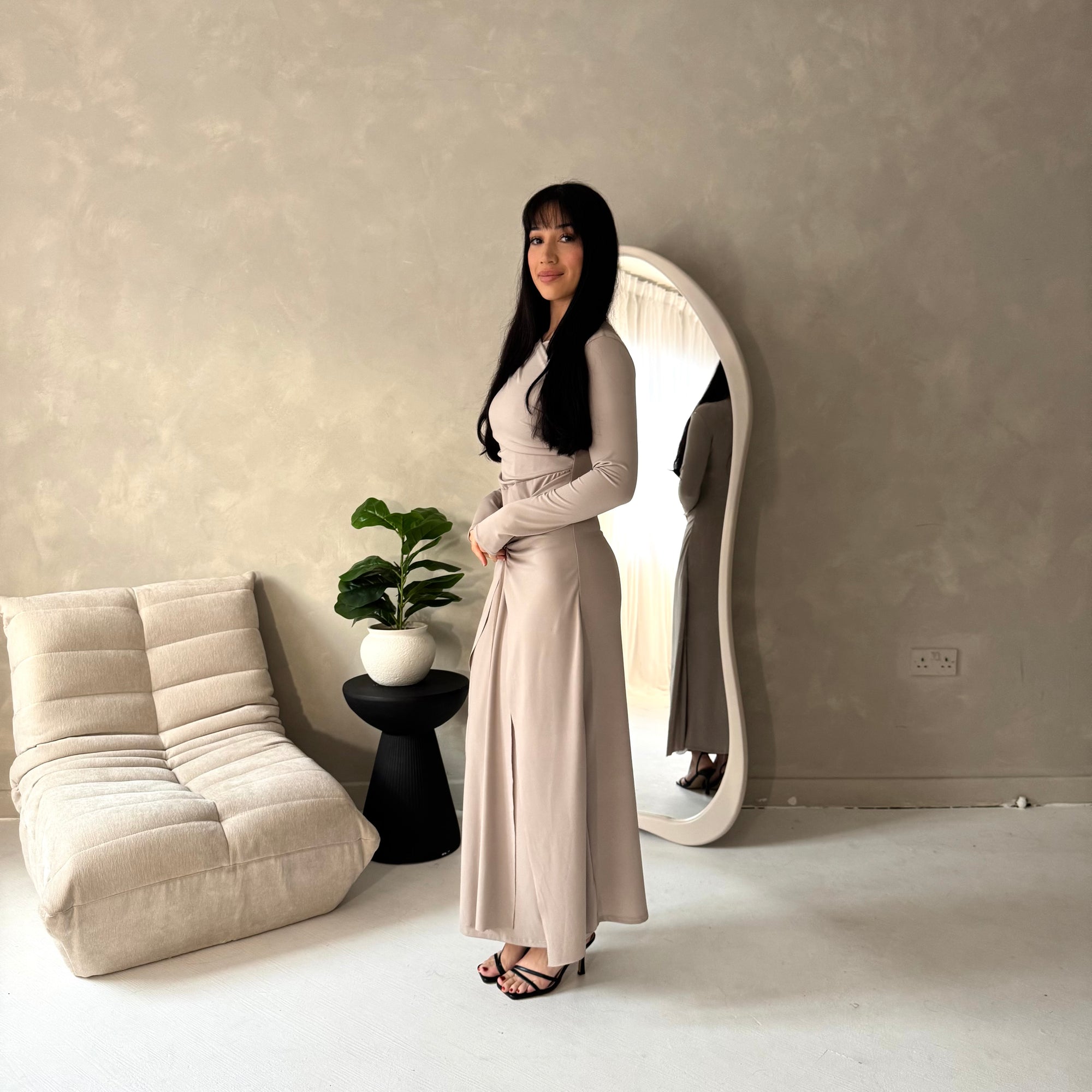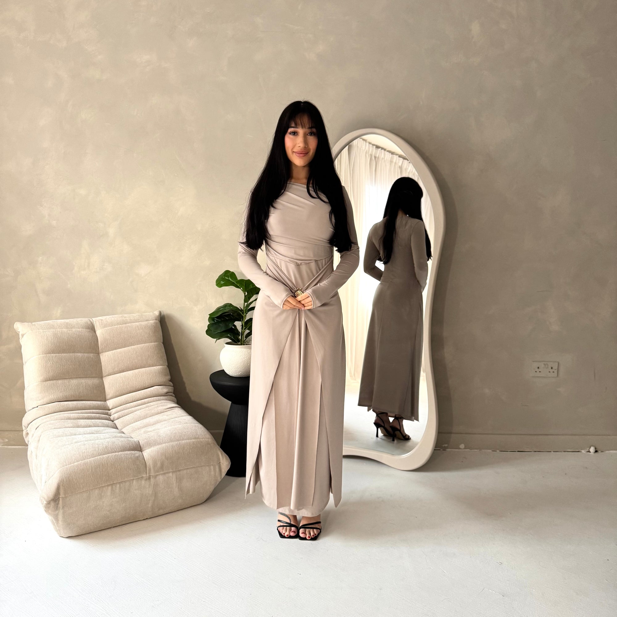Aleena Beige Plain Silky Satin Batwing Kaftan Dress