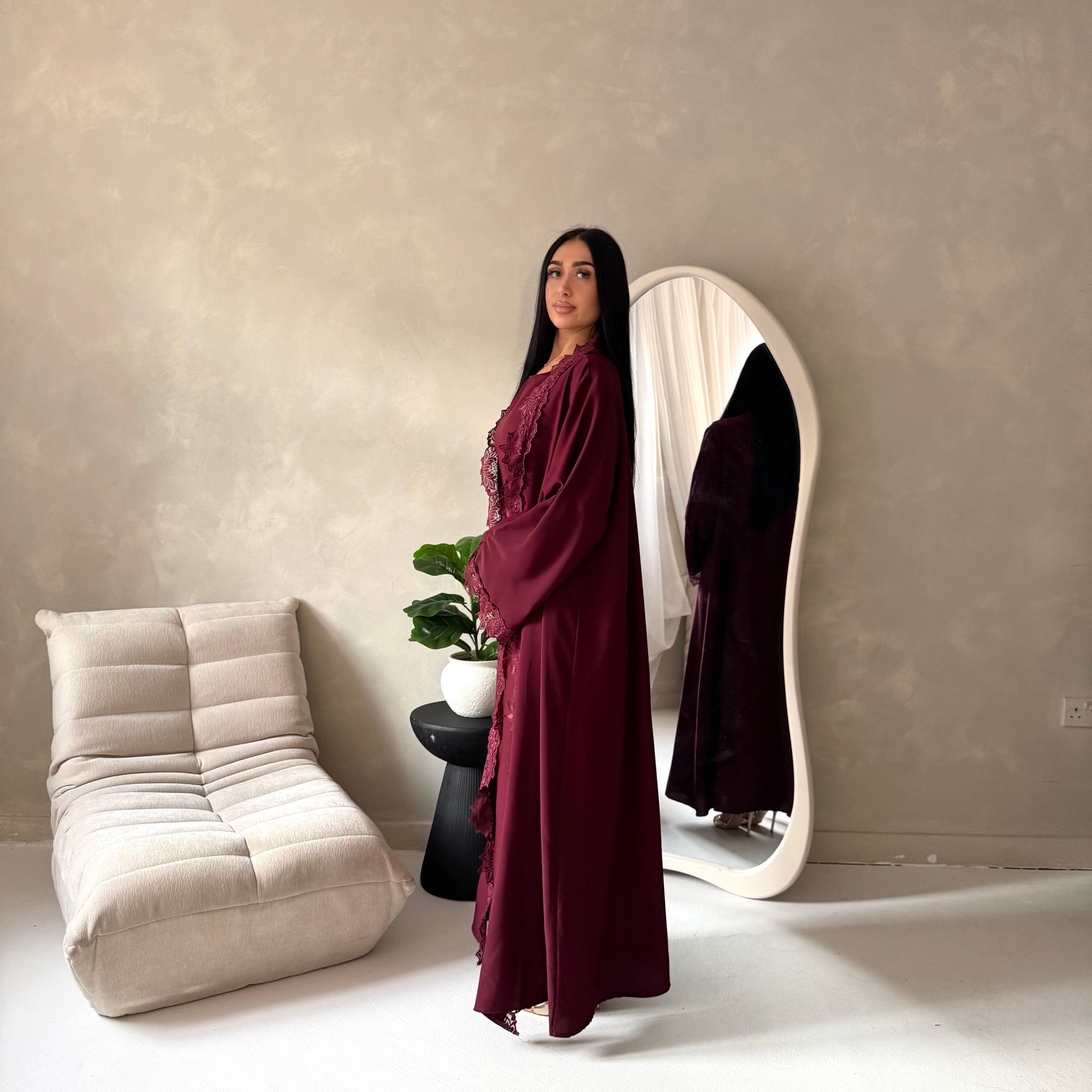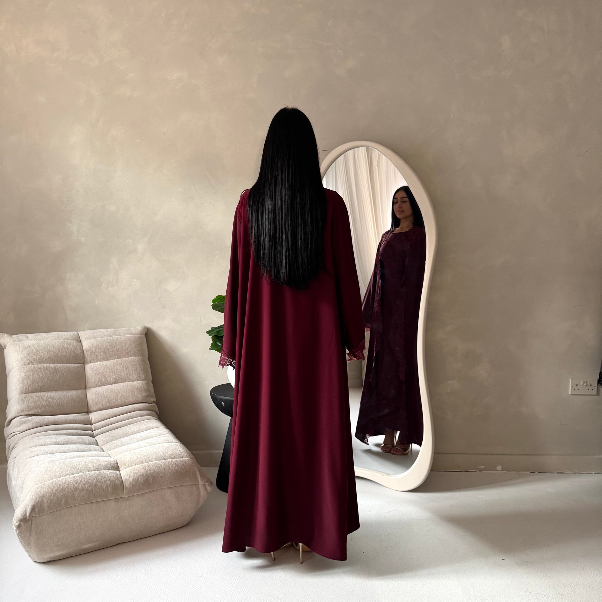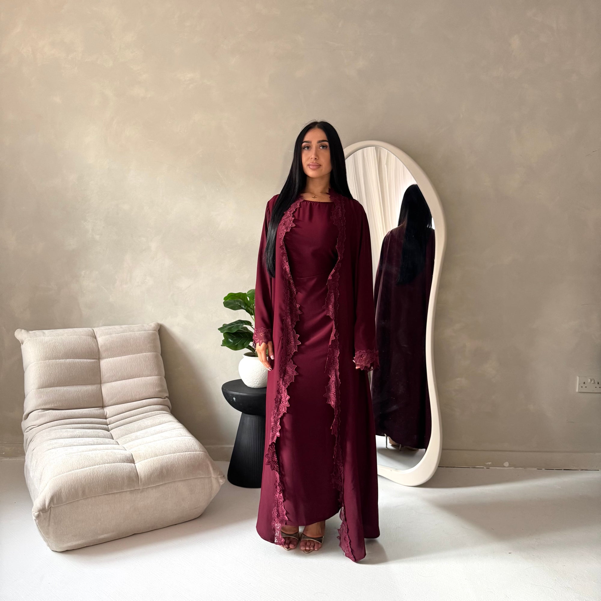 Amara Wine Lace Detail Two Peice Co Ord Abaya Set