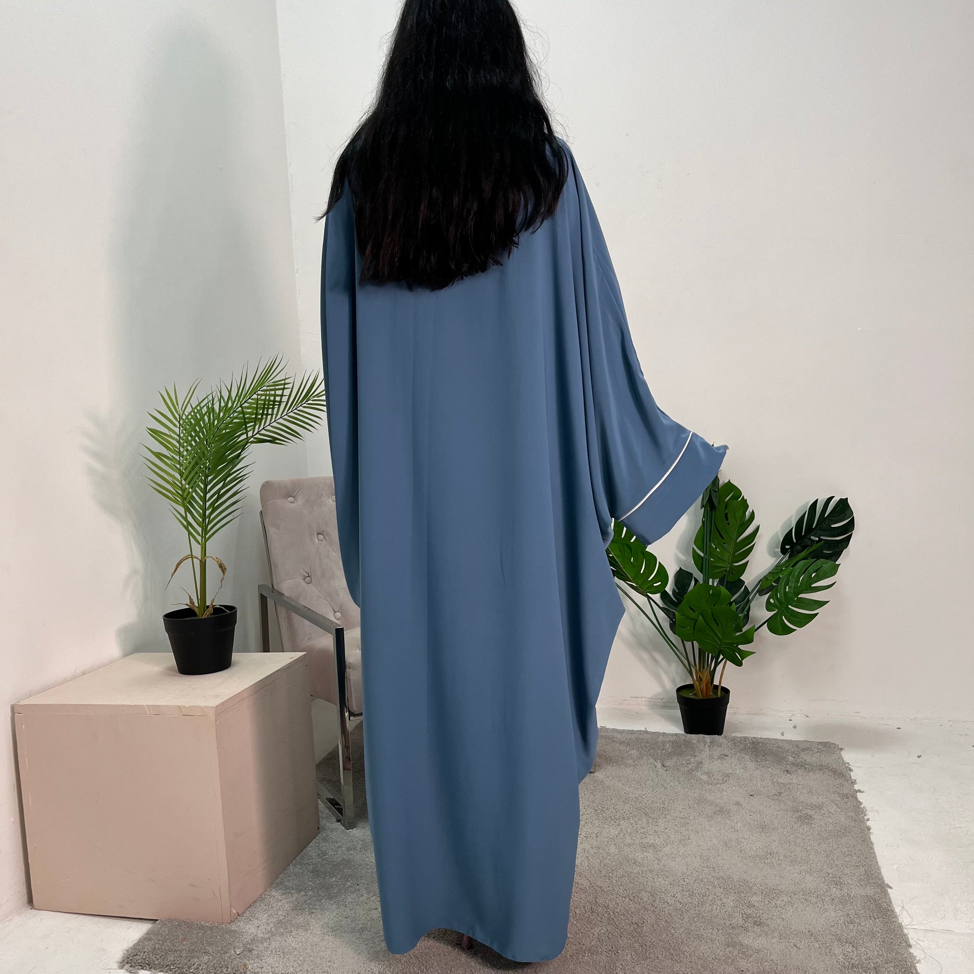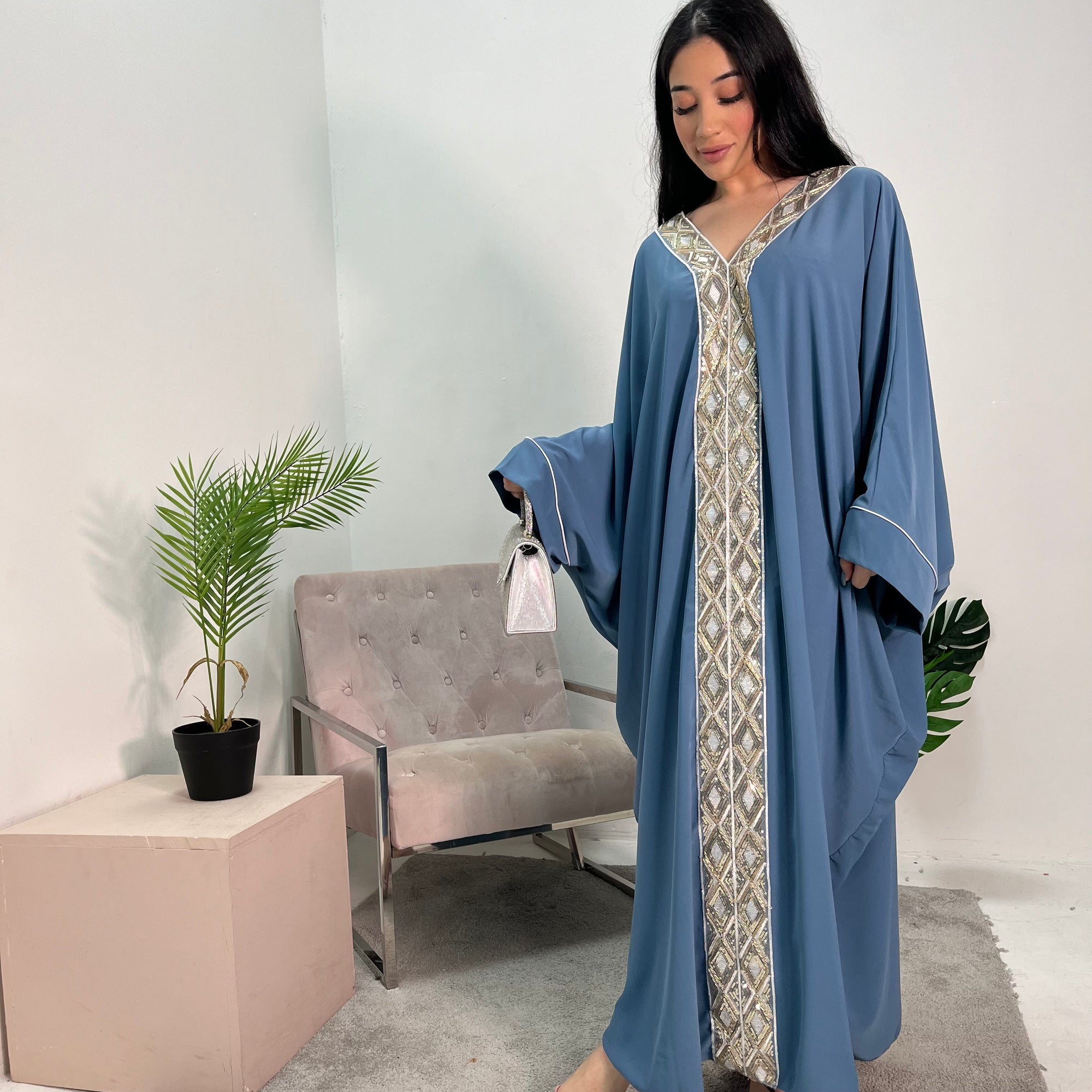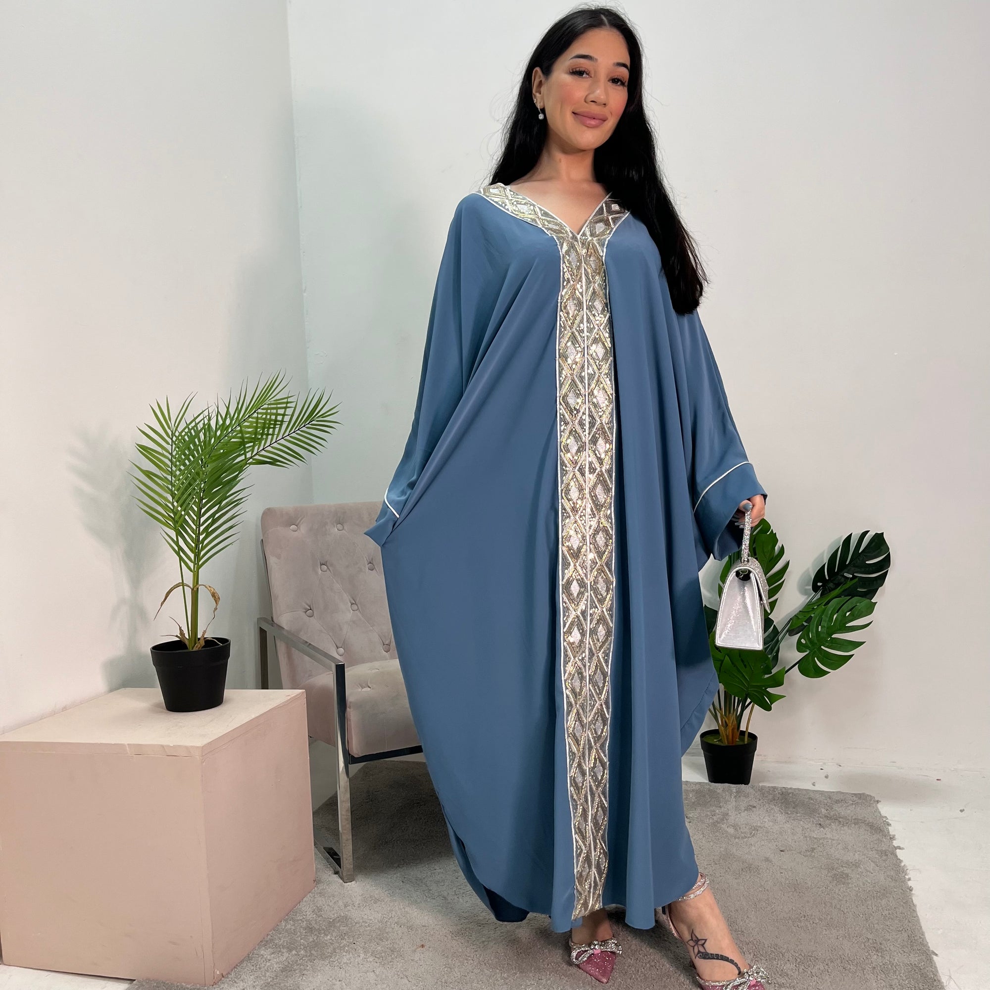 Arooj Charcoal Blue Sequin Trim V Neck Kaftan Abaya Dress