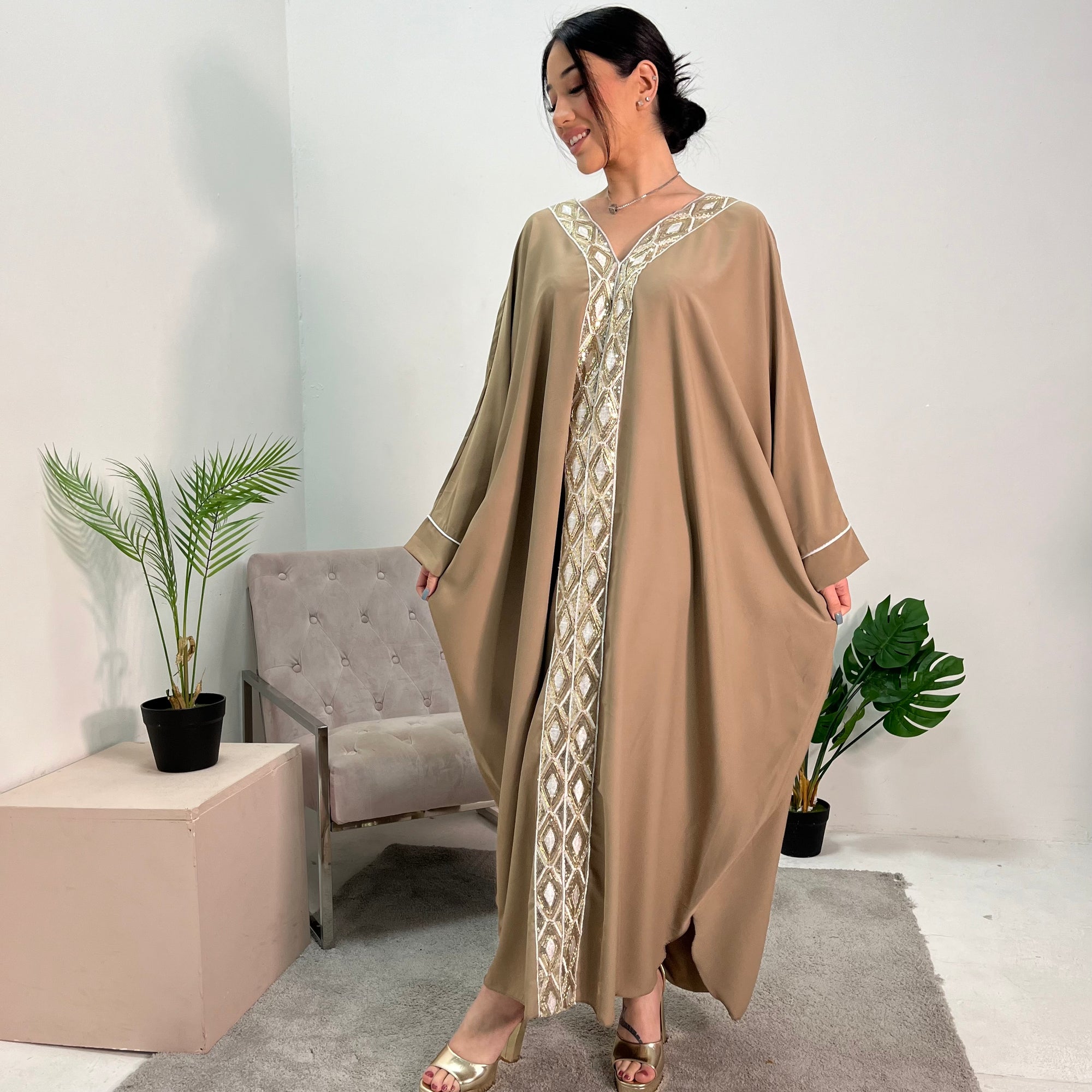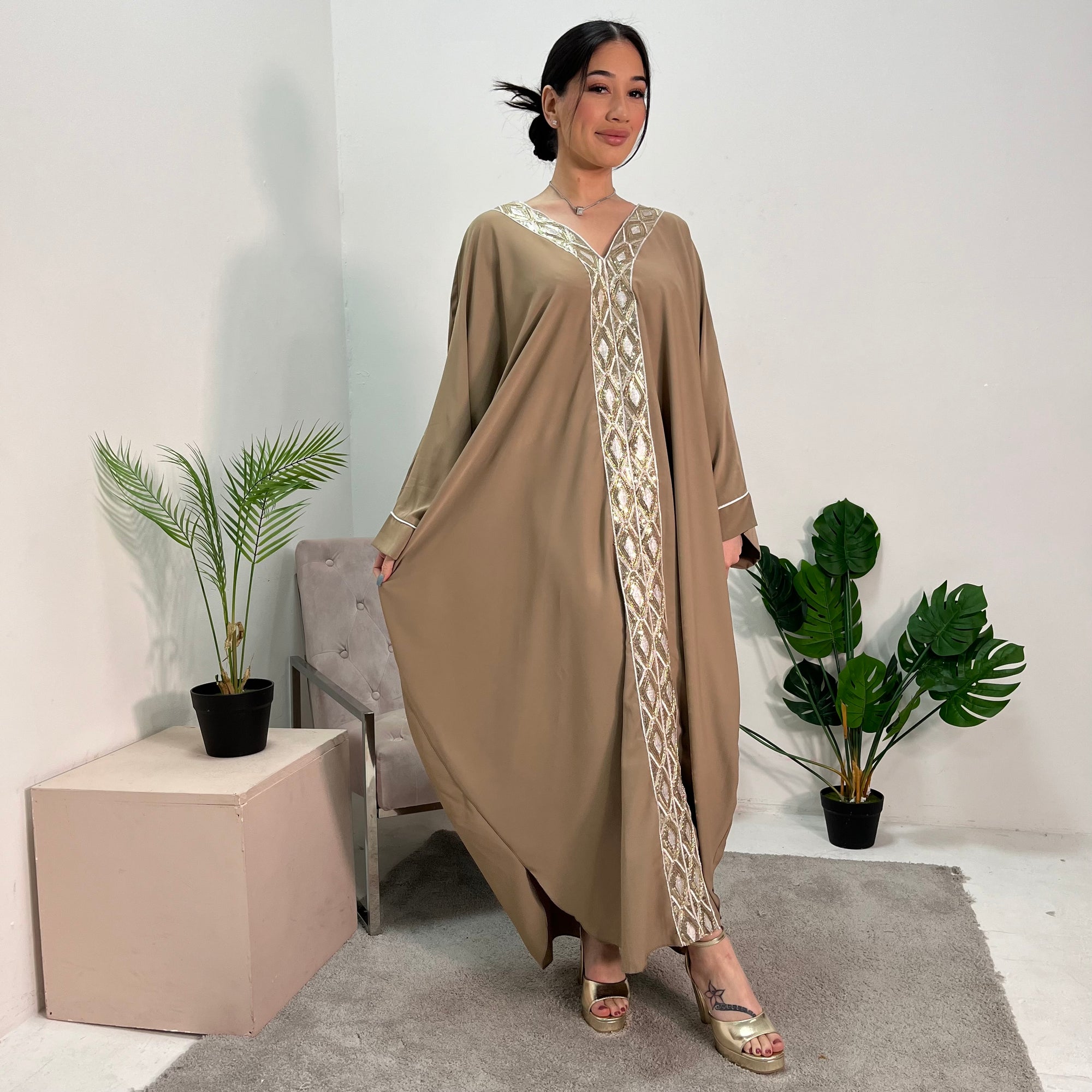 Arooj Khaki Sequin Trim V Neck Kaftan Abaya Dress