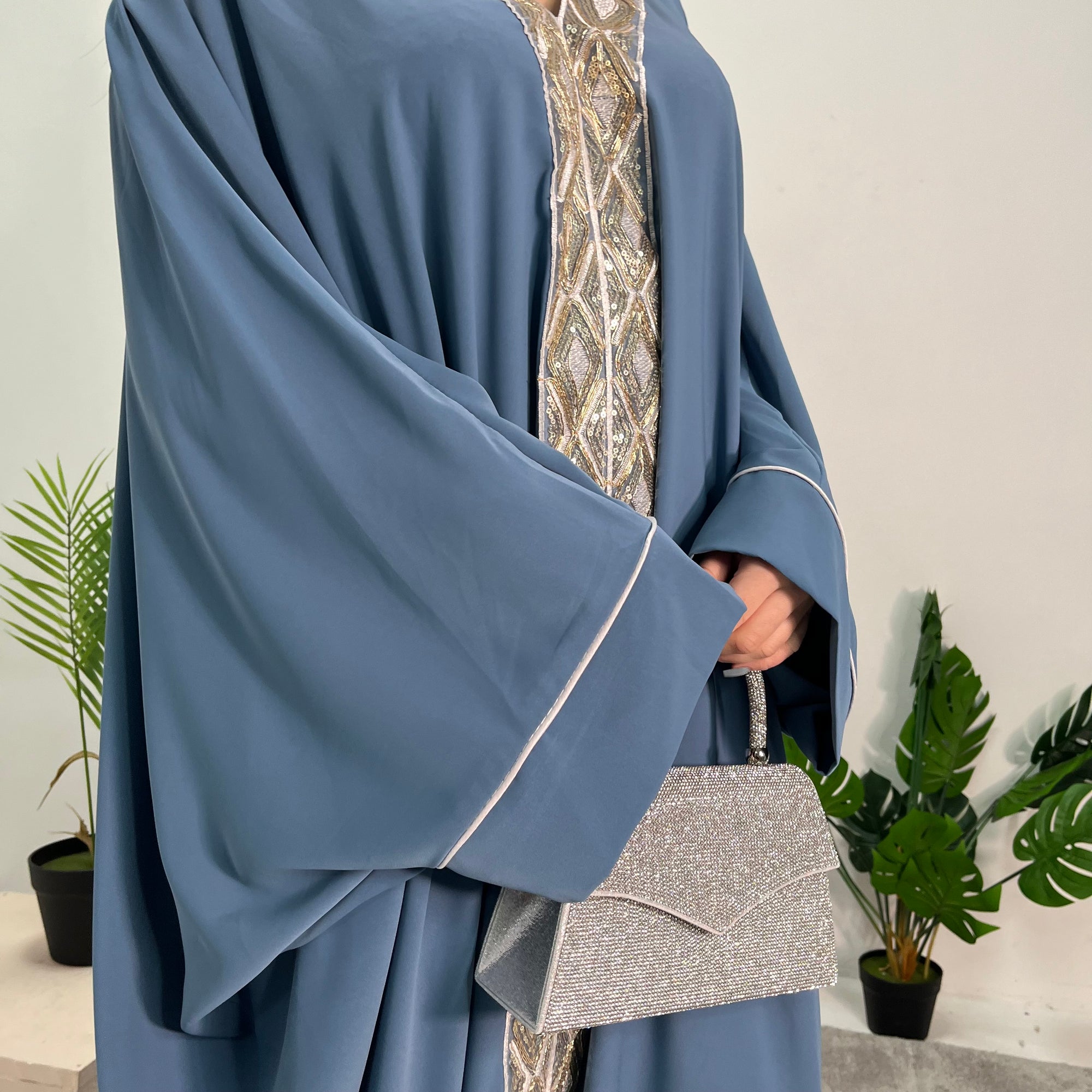 Arianna Aqua Sequin Trim Modest Abaya Kimono Jacket