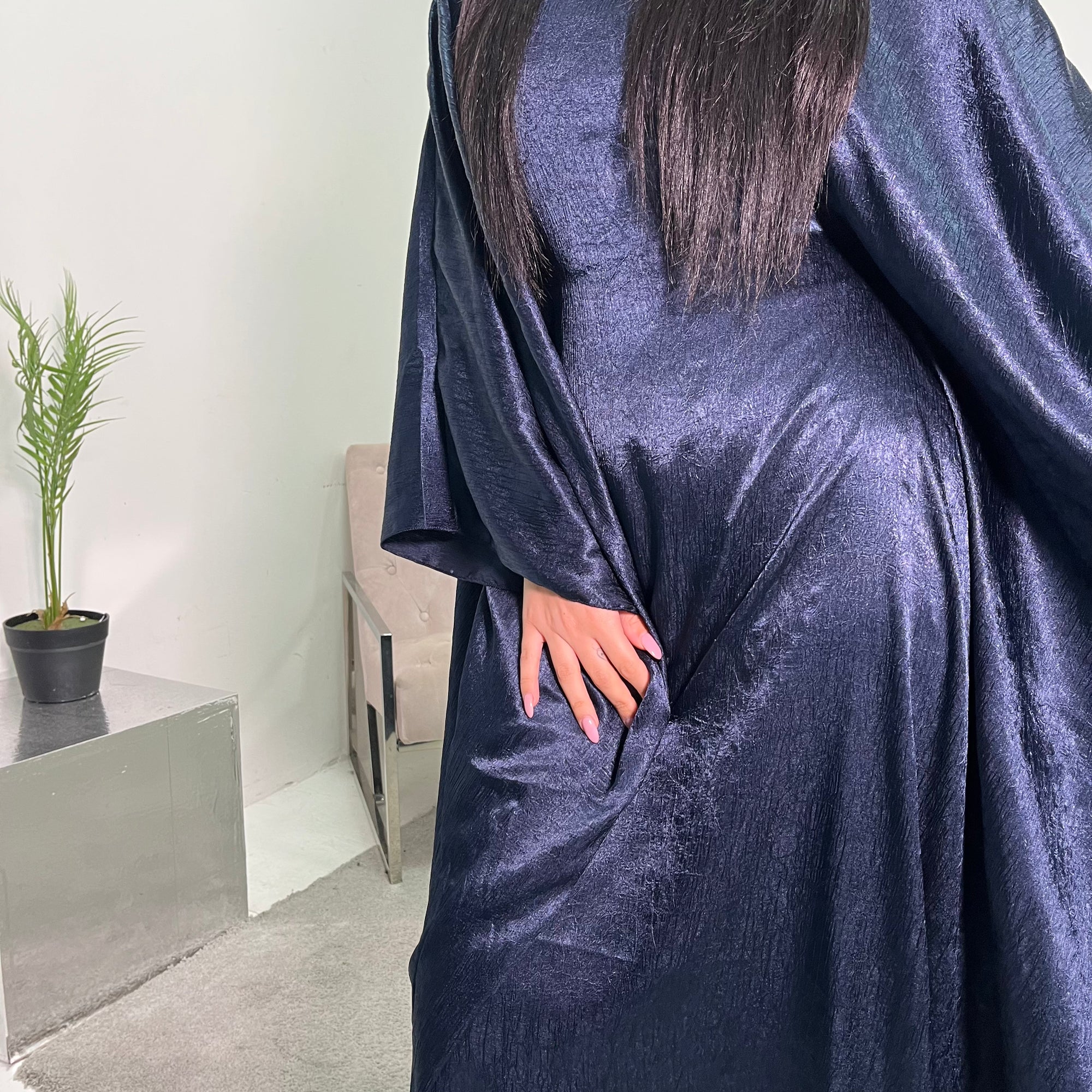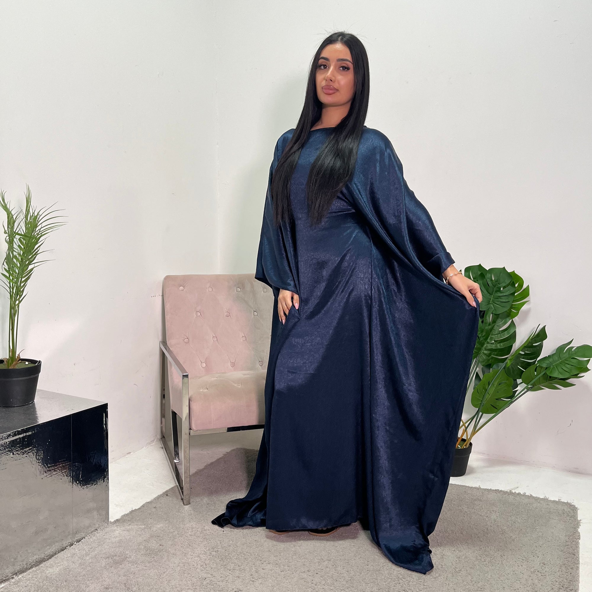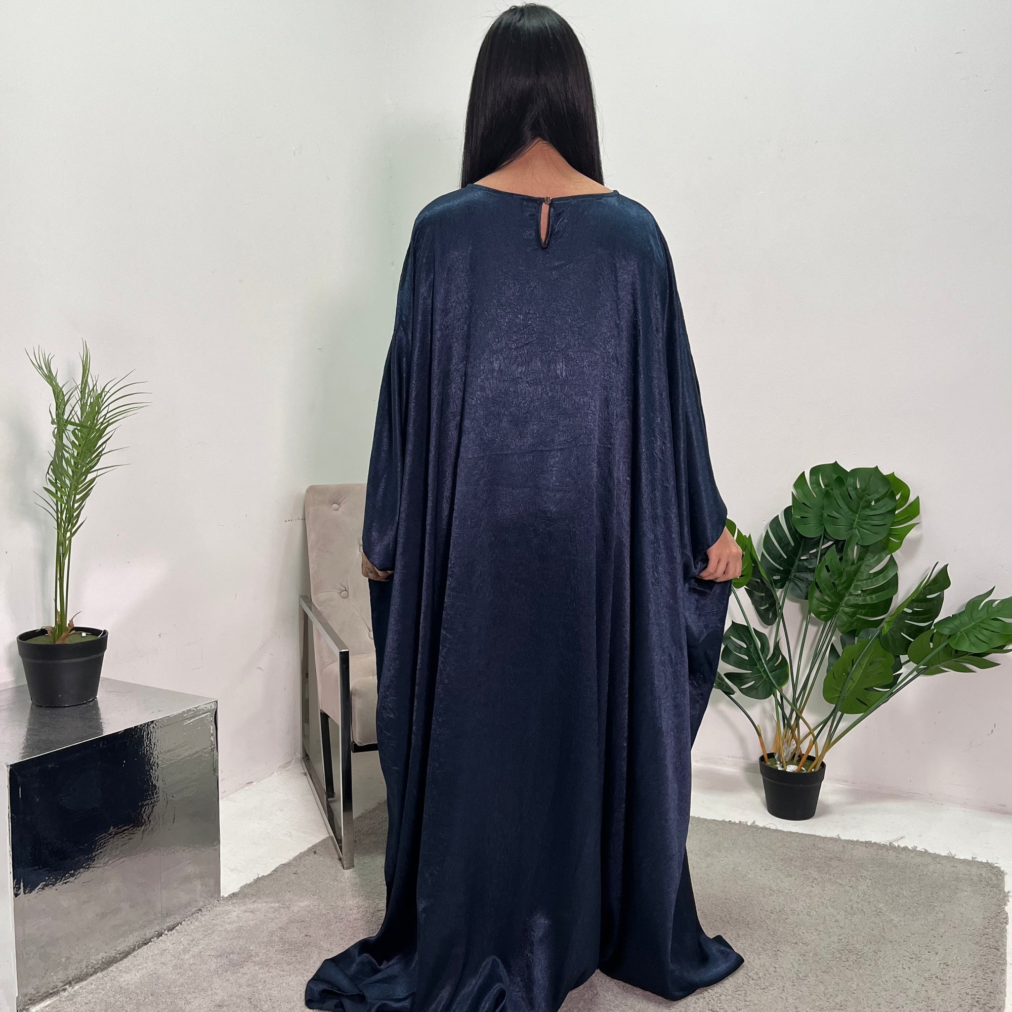Arooj Navy Sequin Trim V Neck Kaftan Abaya Dress