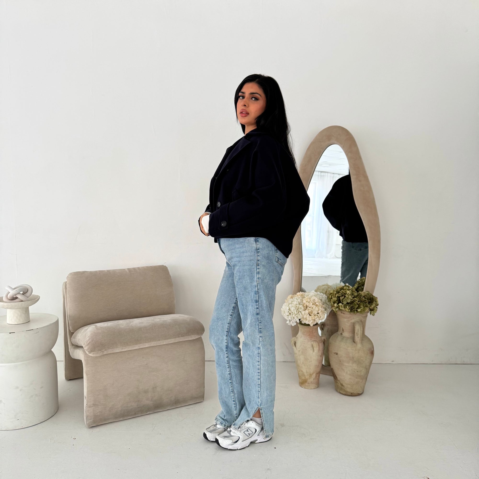 Atia Sky Blue Linen Gold Buckle Tie Back Modest Dress