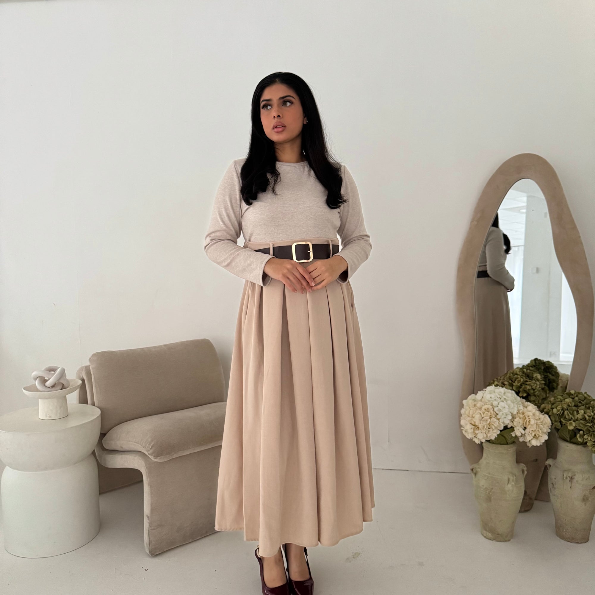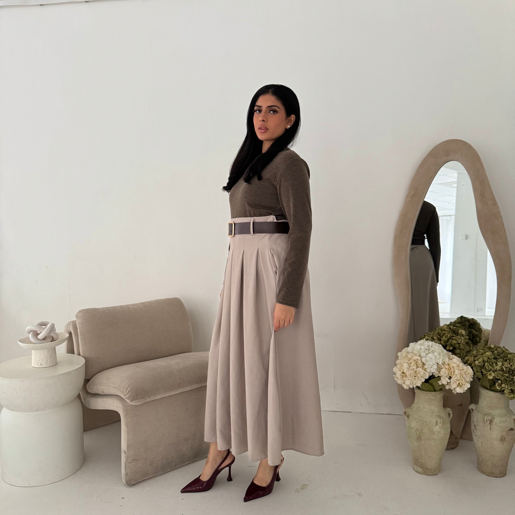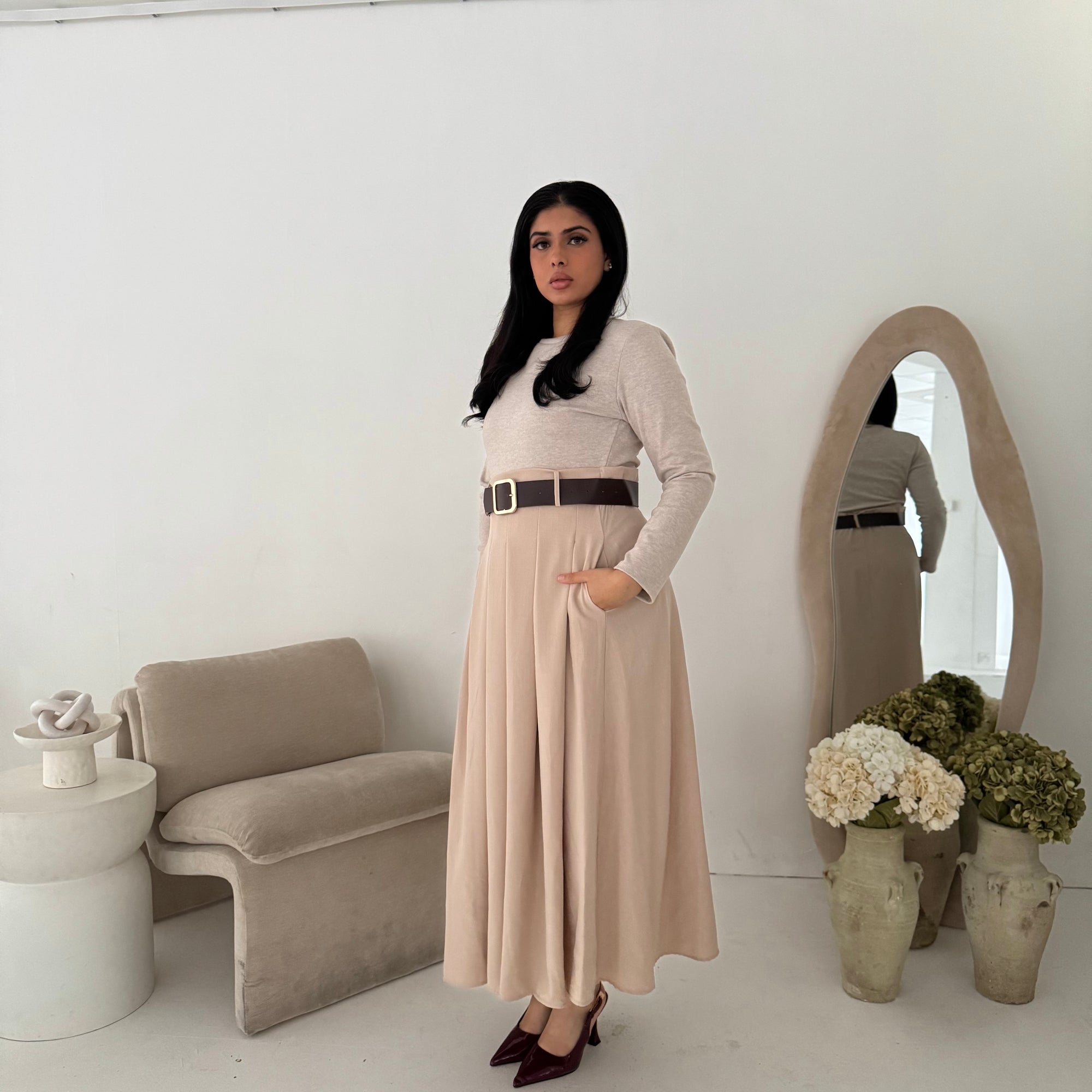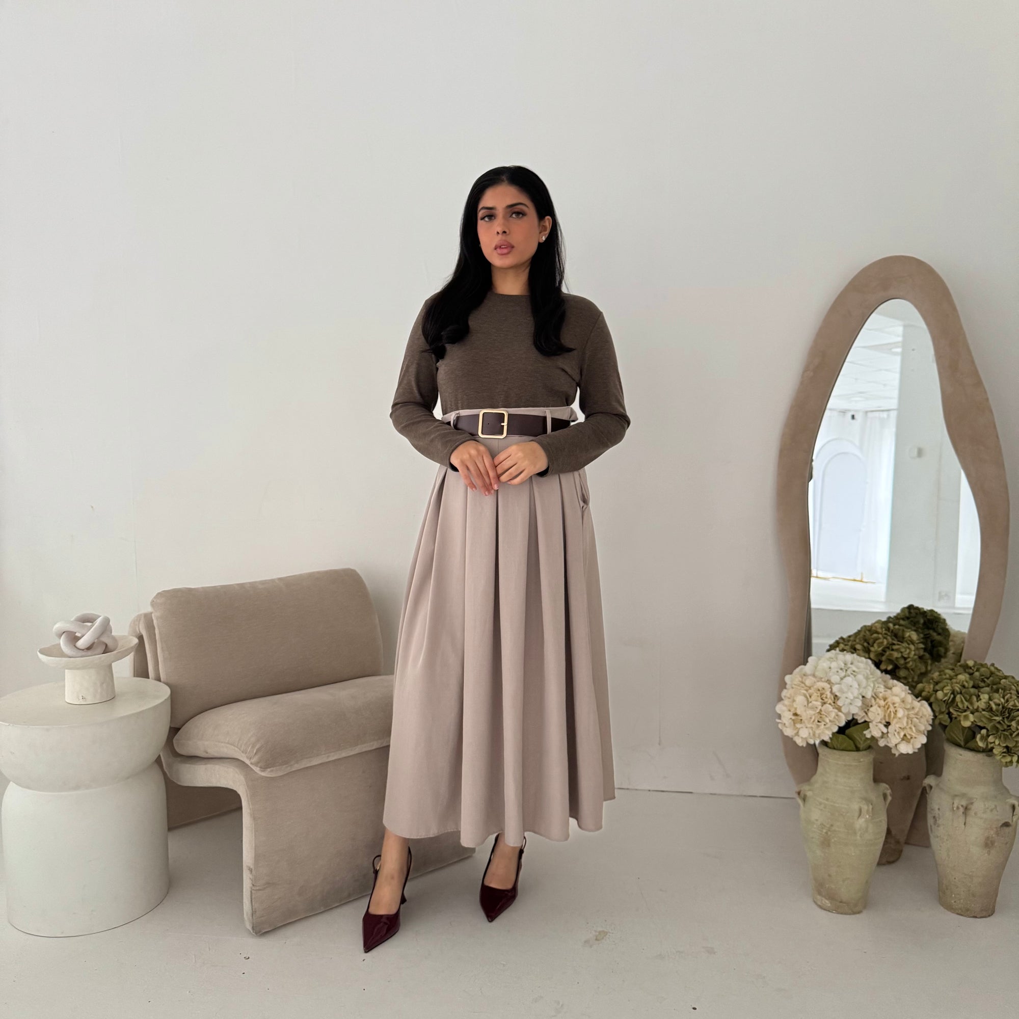 Evera Beige Soft Rib Top Skirt Belted Dress