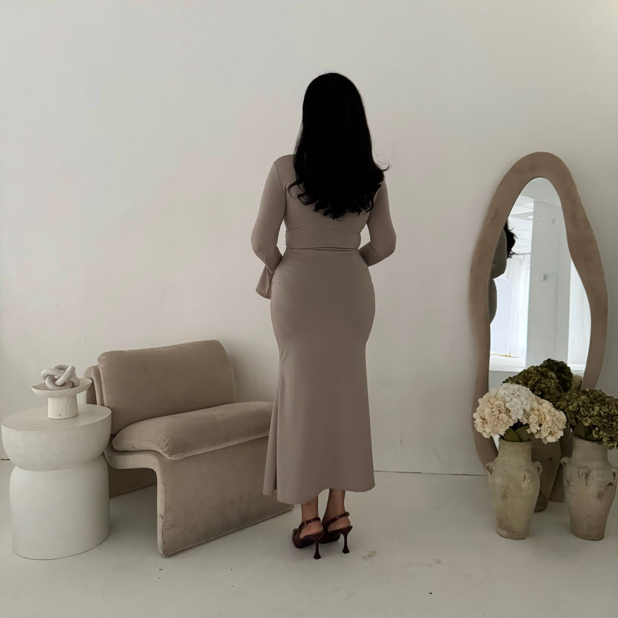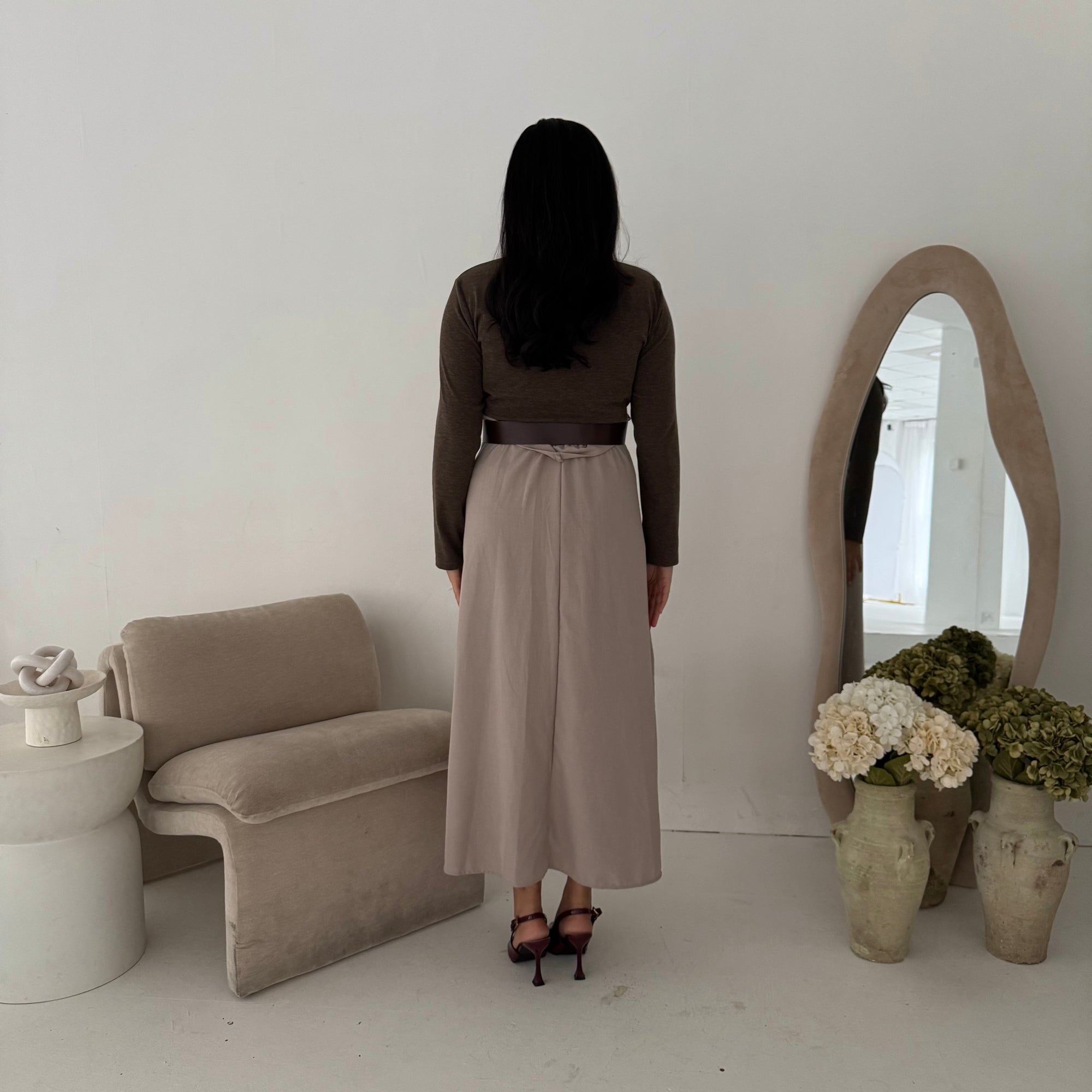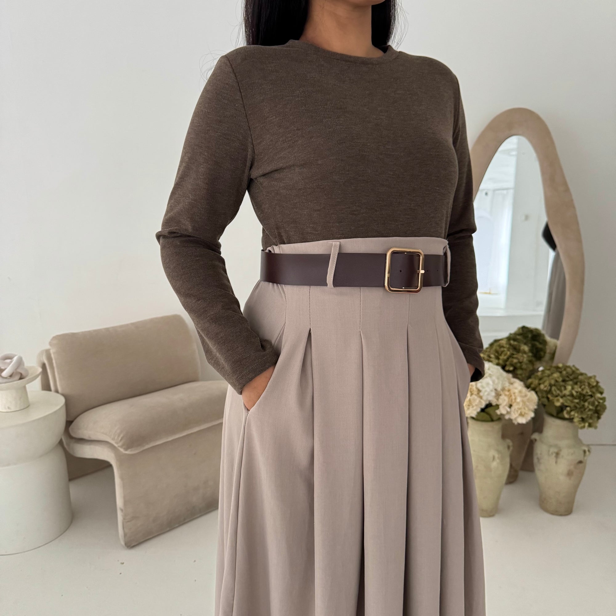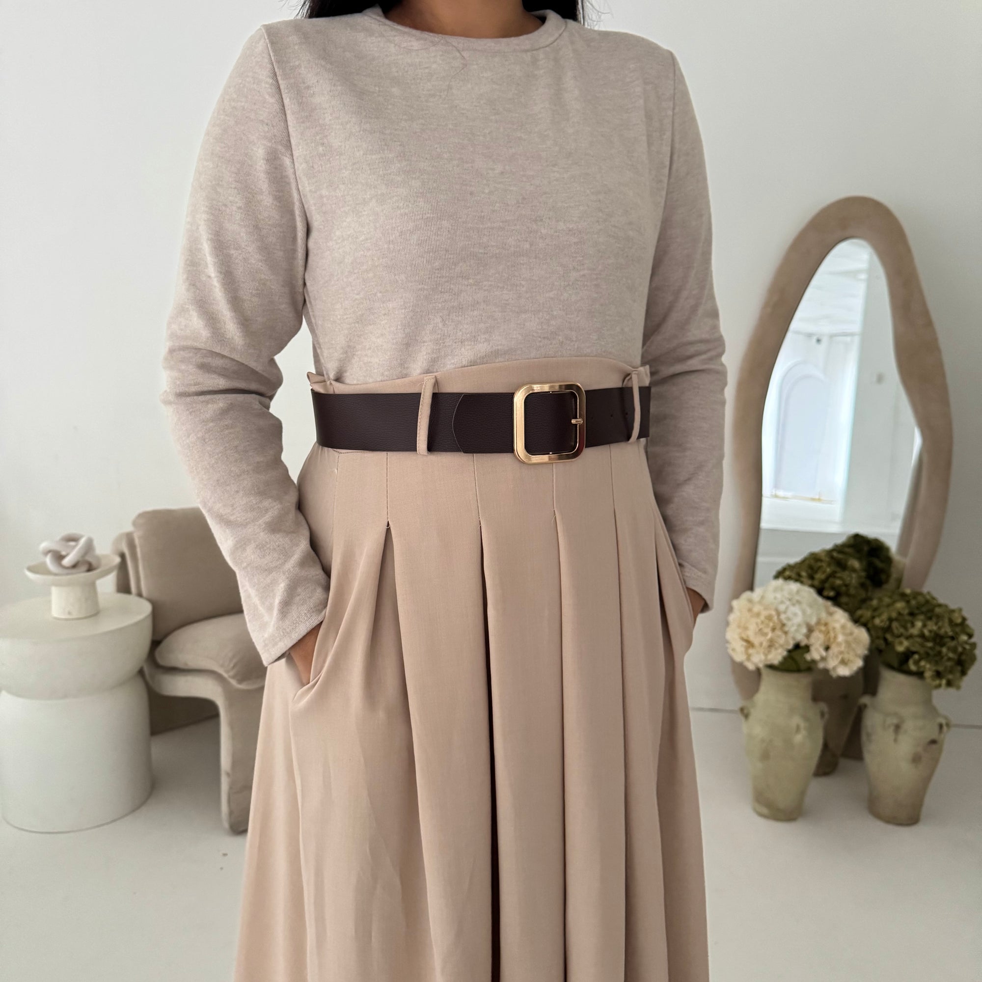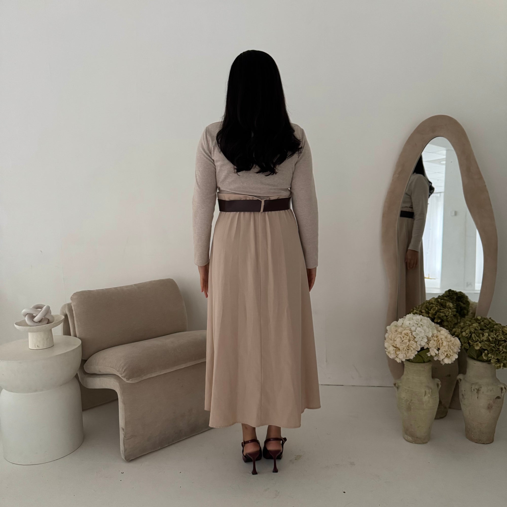 Evera Beige Soft Rib Top Skirt Belted Dress