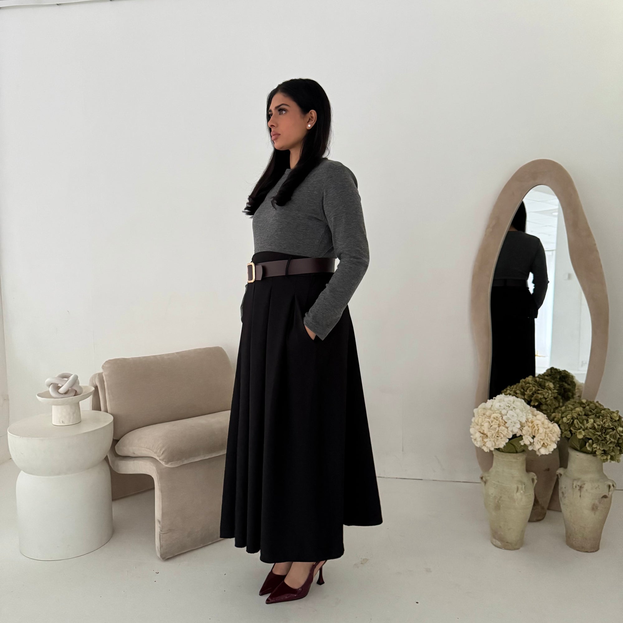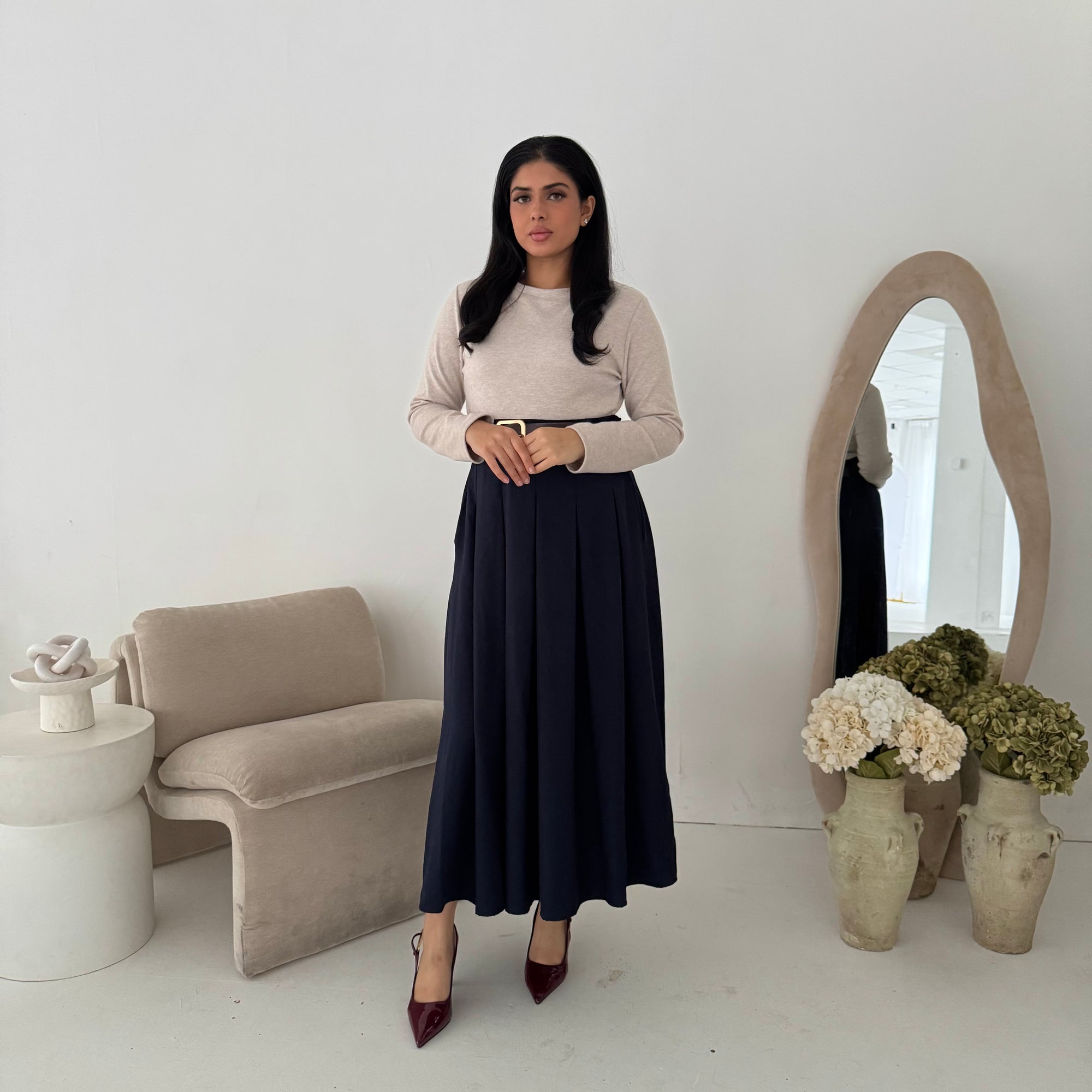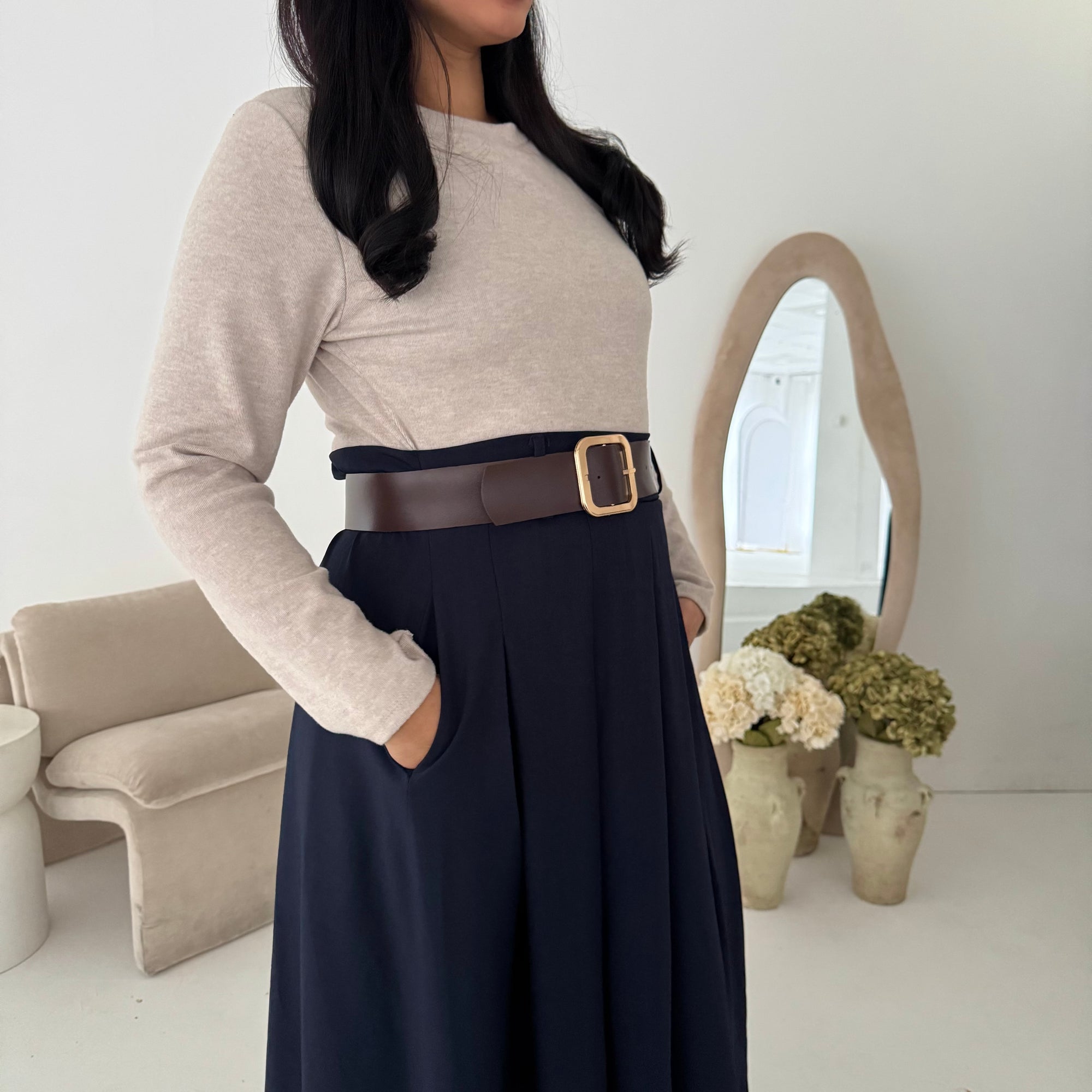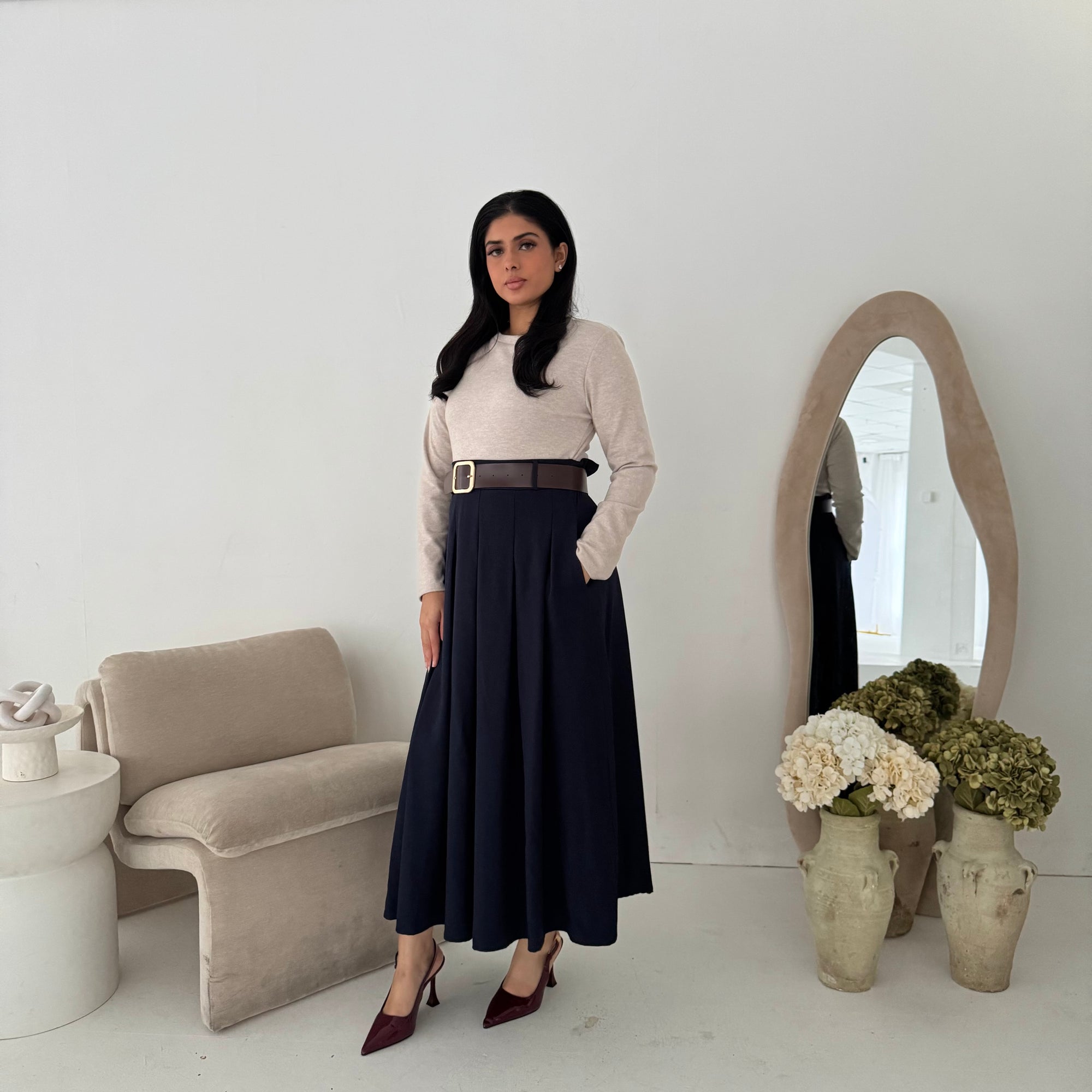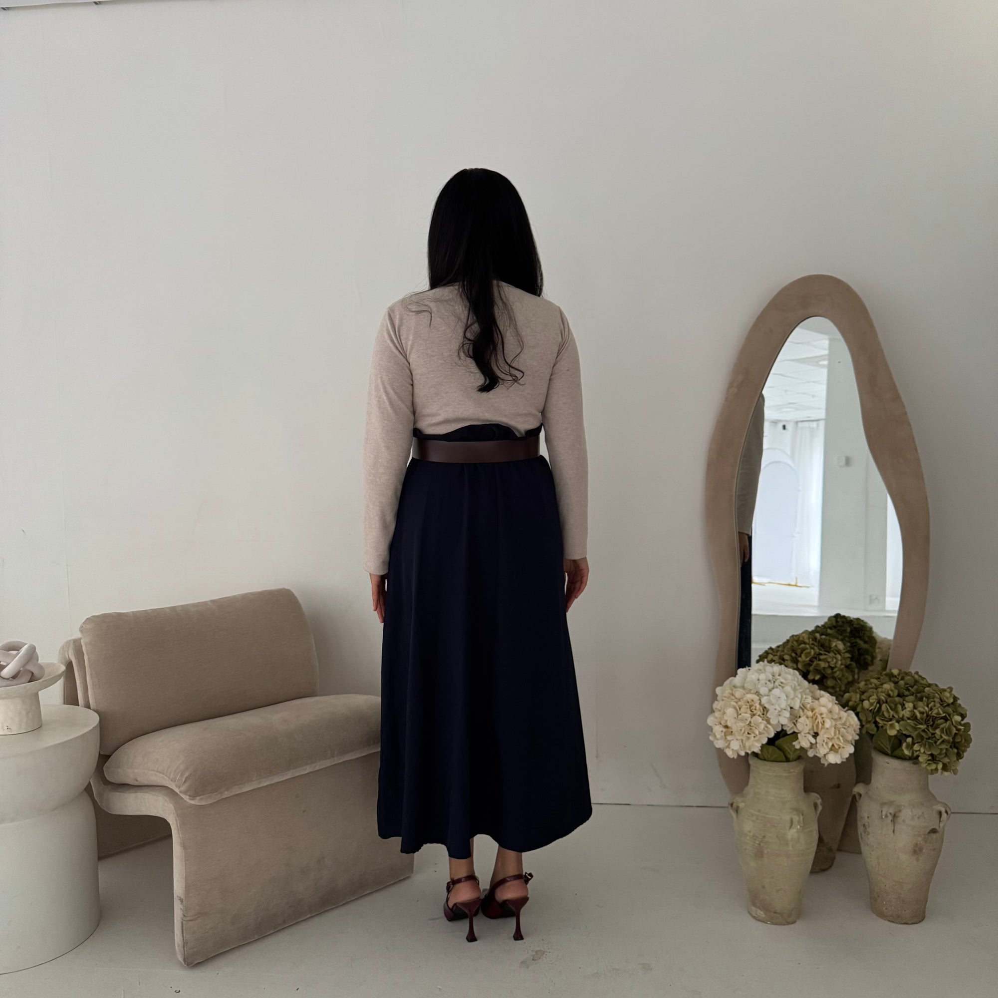 Evera Navy Soft Rib Top Skirt Belted Dress