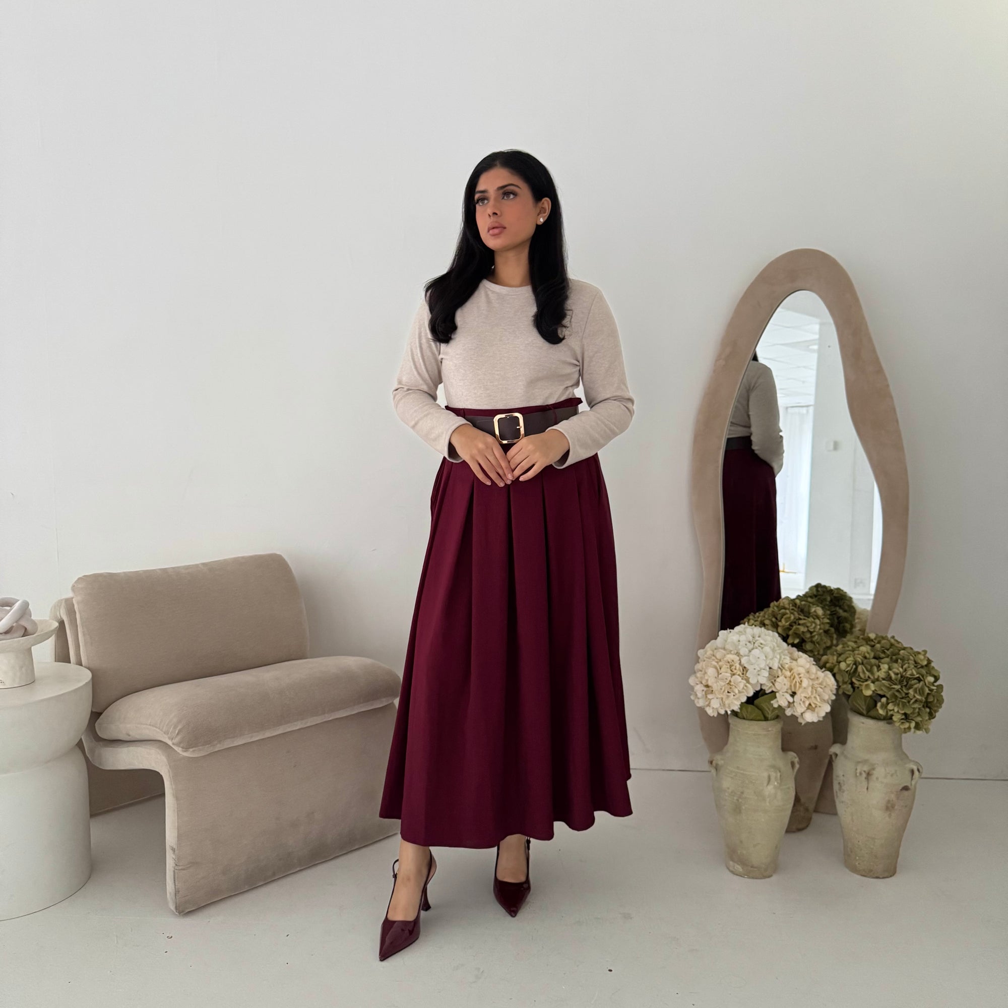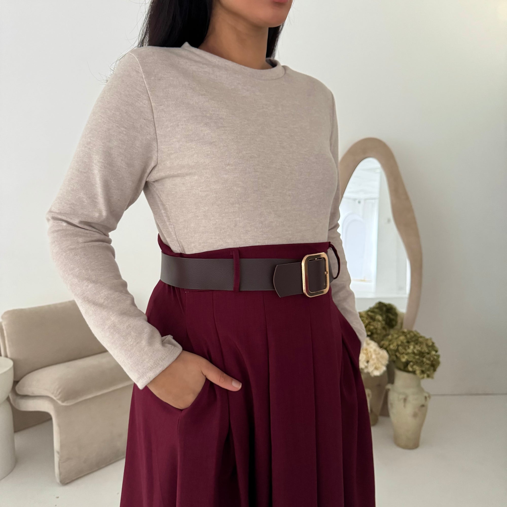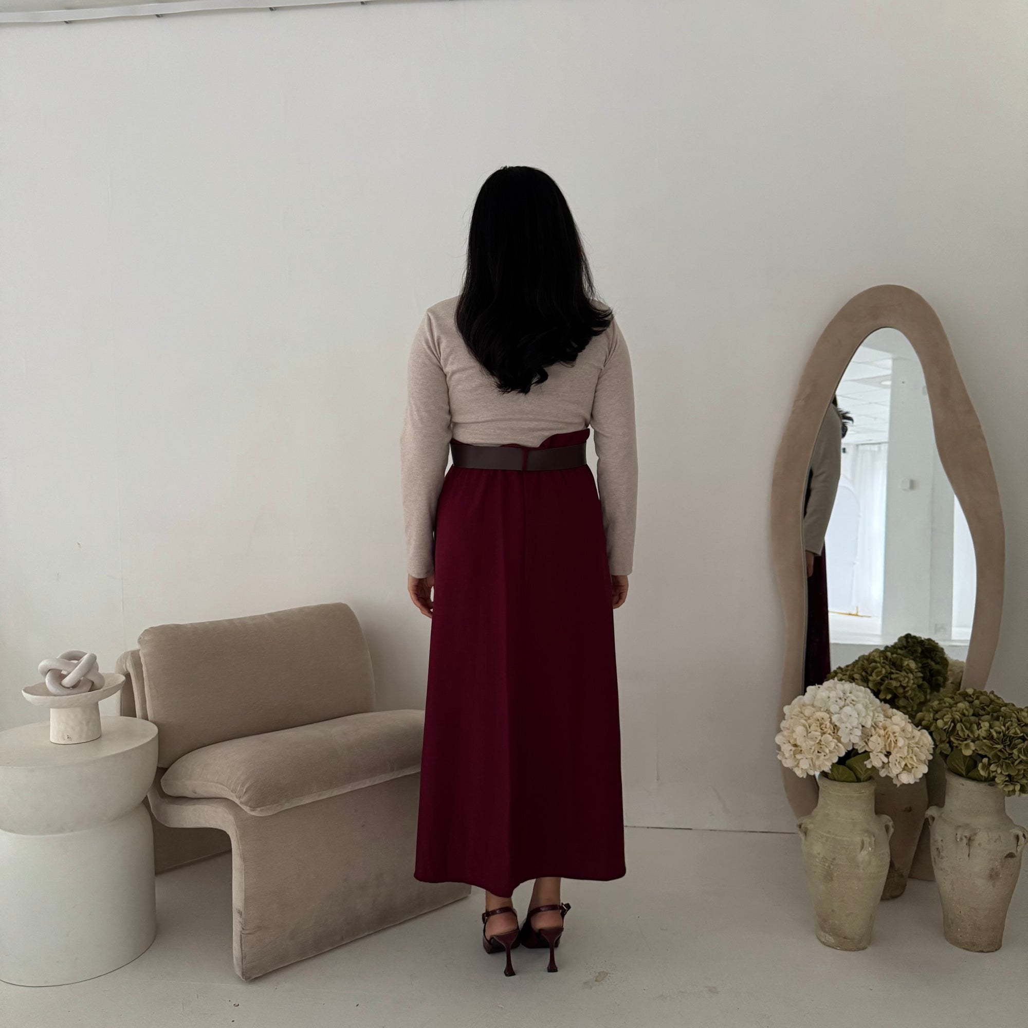 Evera Wine Soft Rib Top Skirt Belted Dress