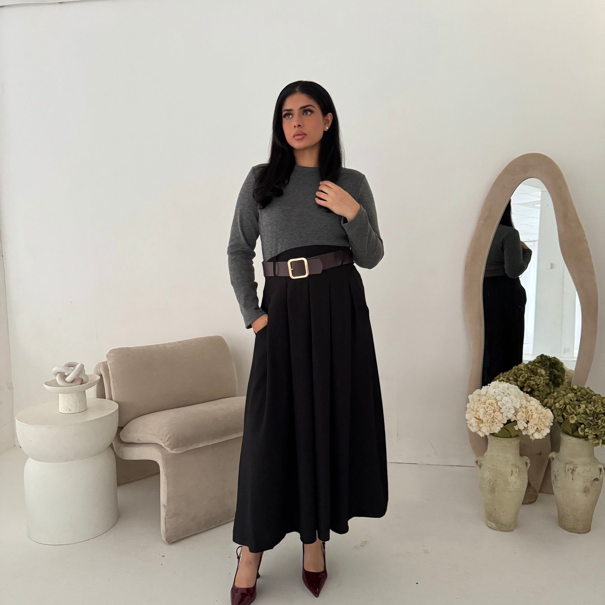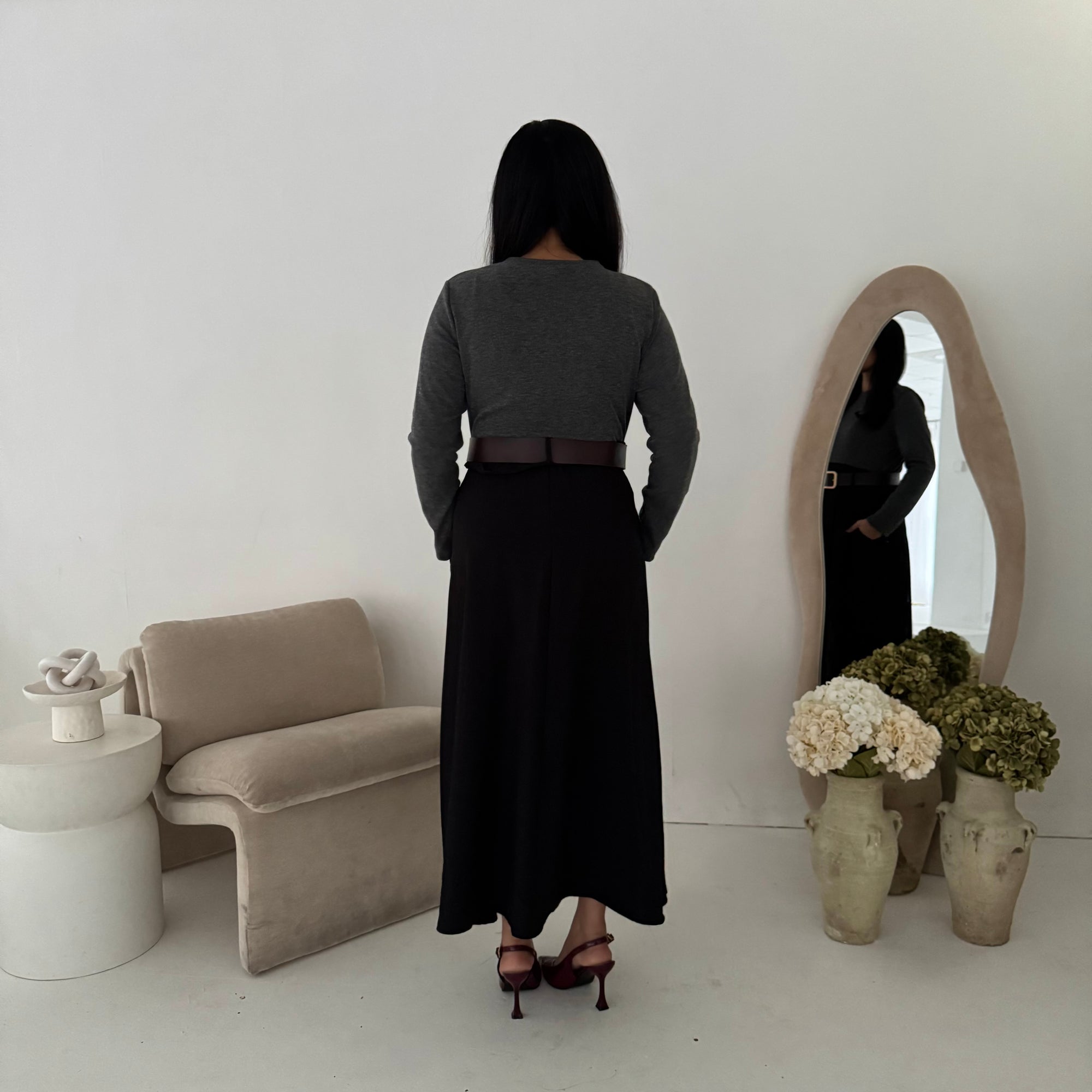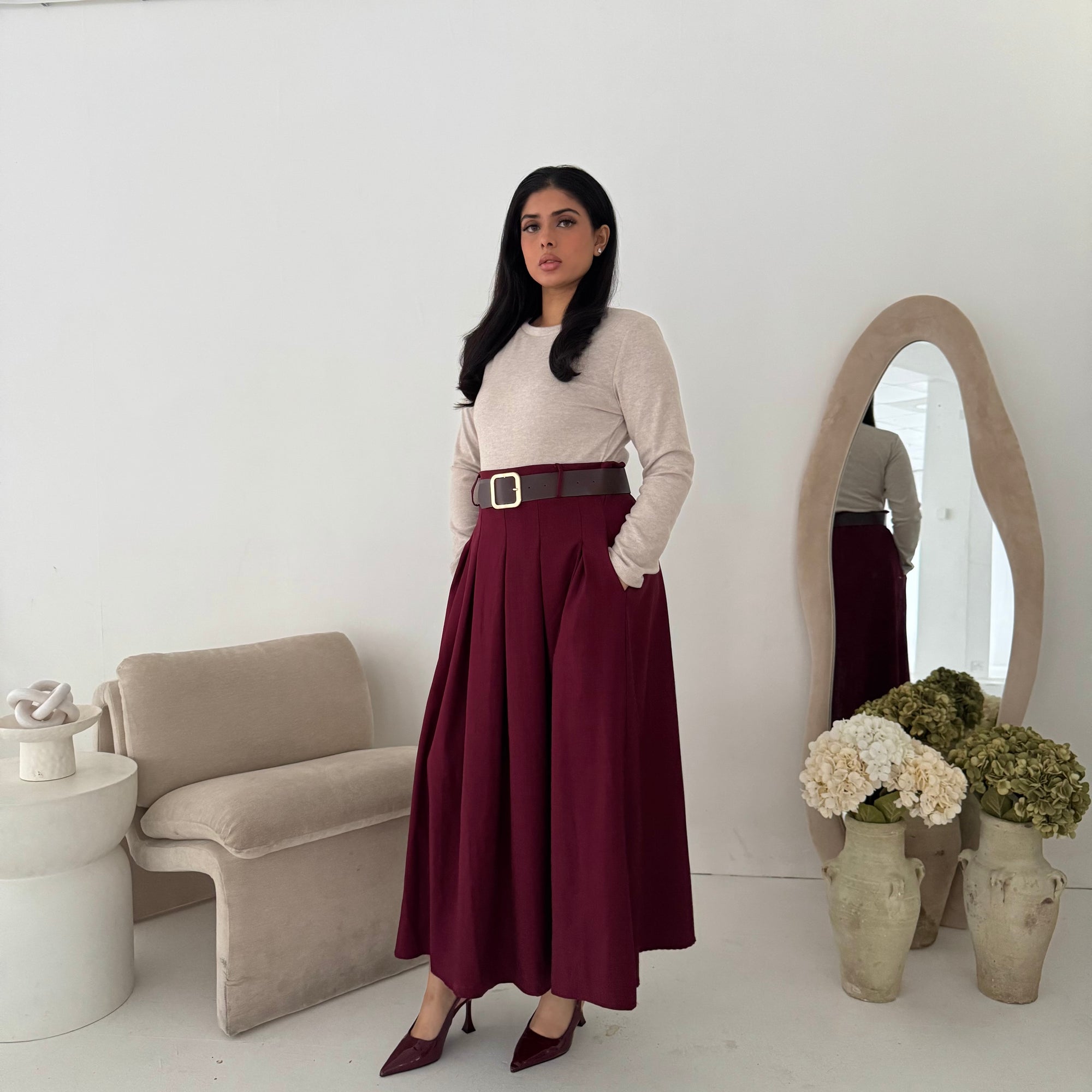 Evera Wine Soft Rib Top Skirt Belted Dress