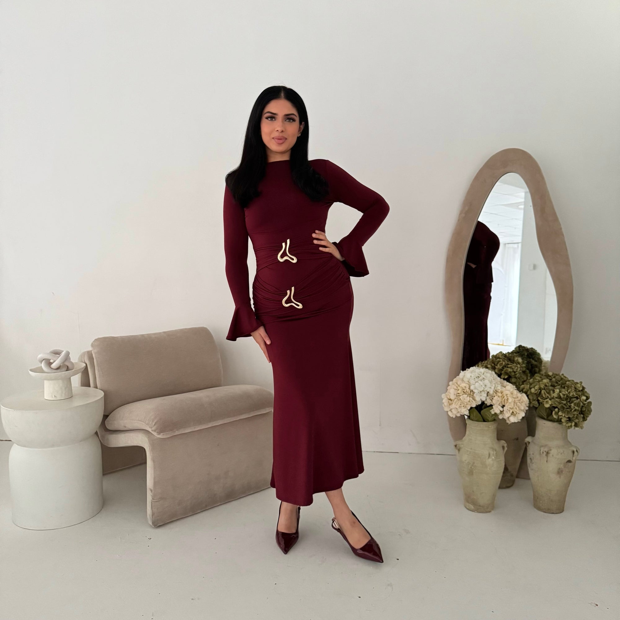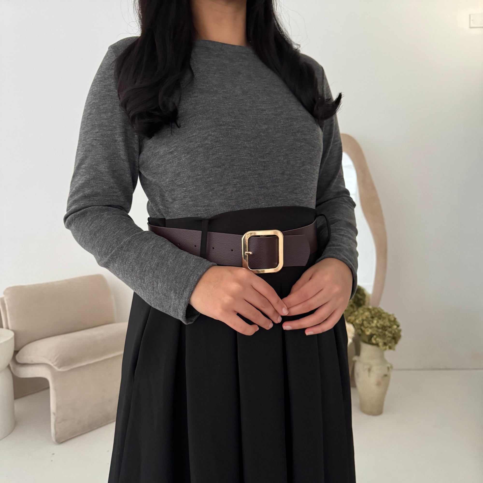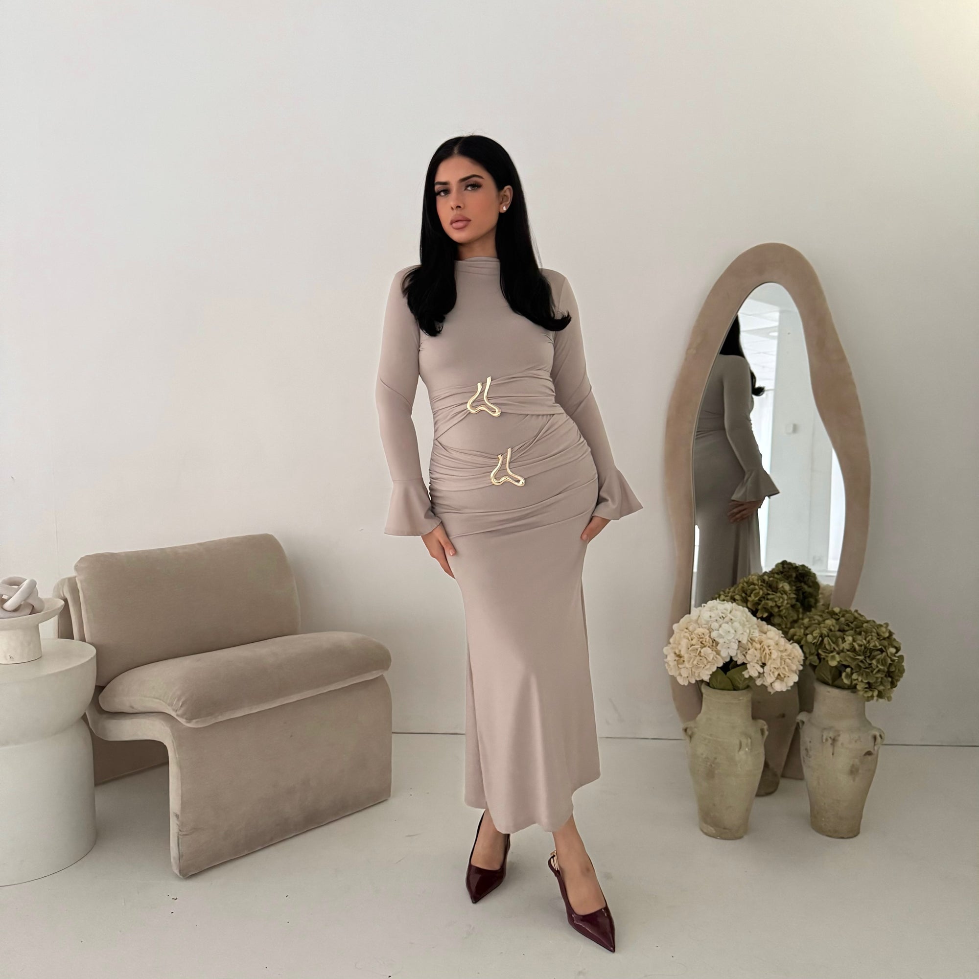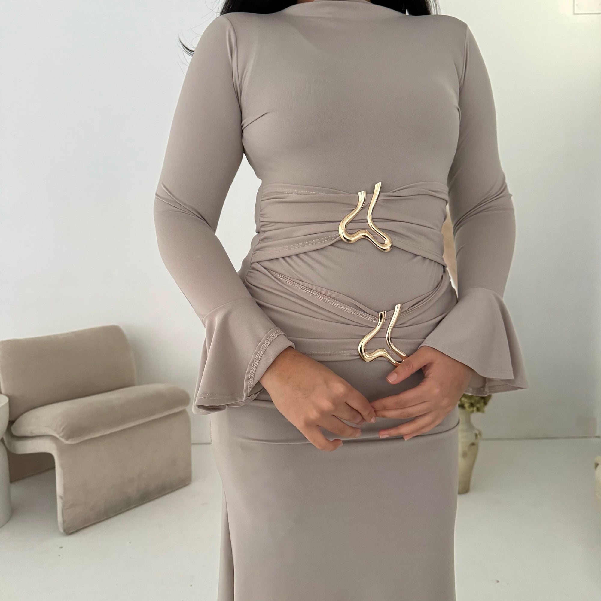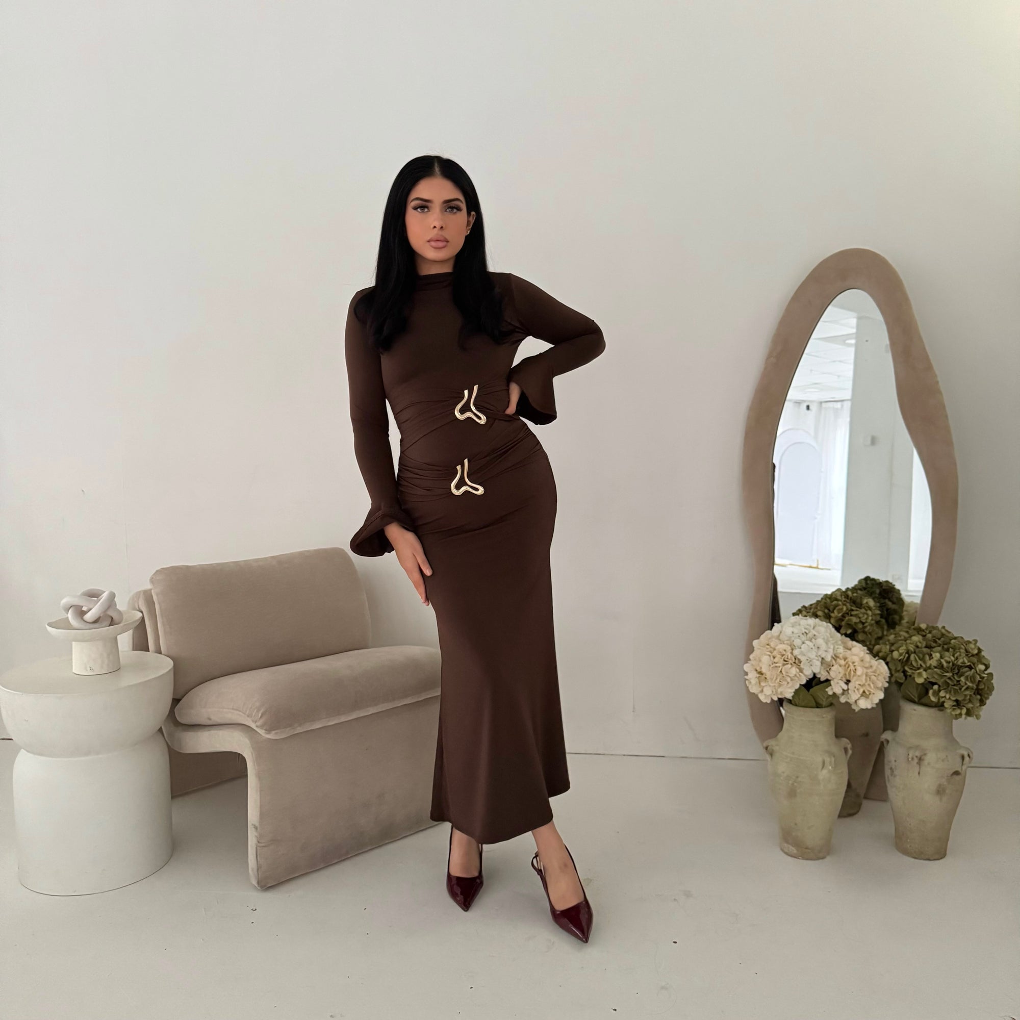 Serenity Mocha Gold Buckle Detail Modest Dress