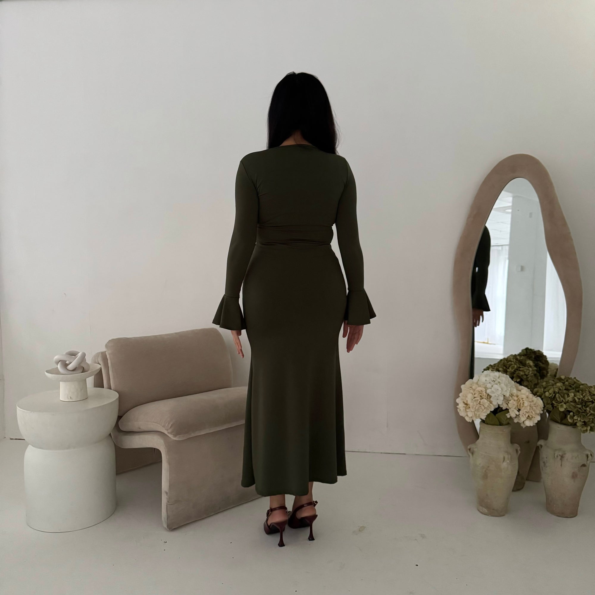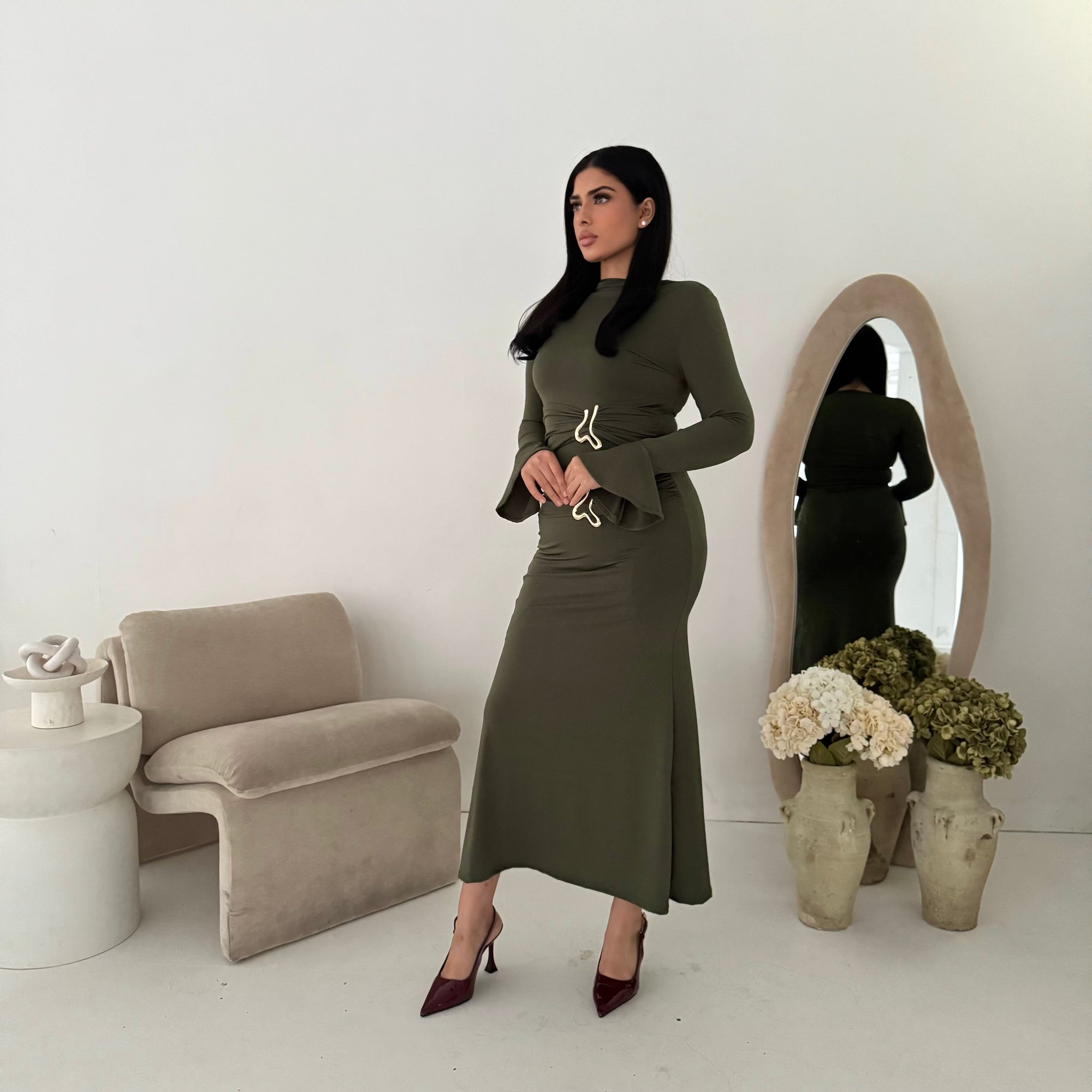 Serenity Khaki Gold Buckle Detail Modest Dress