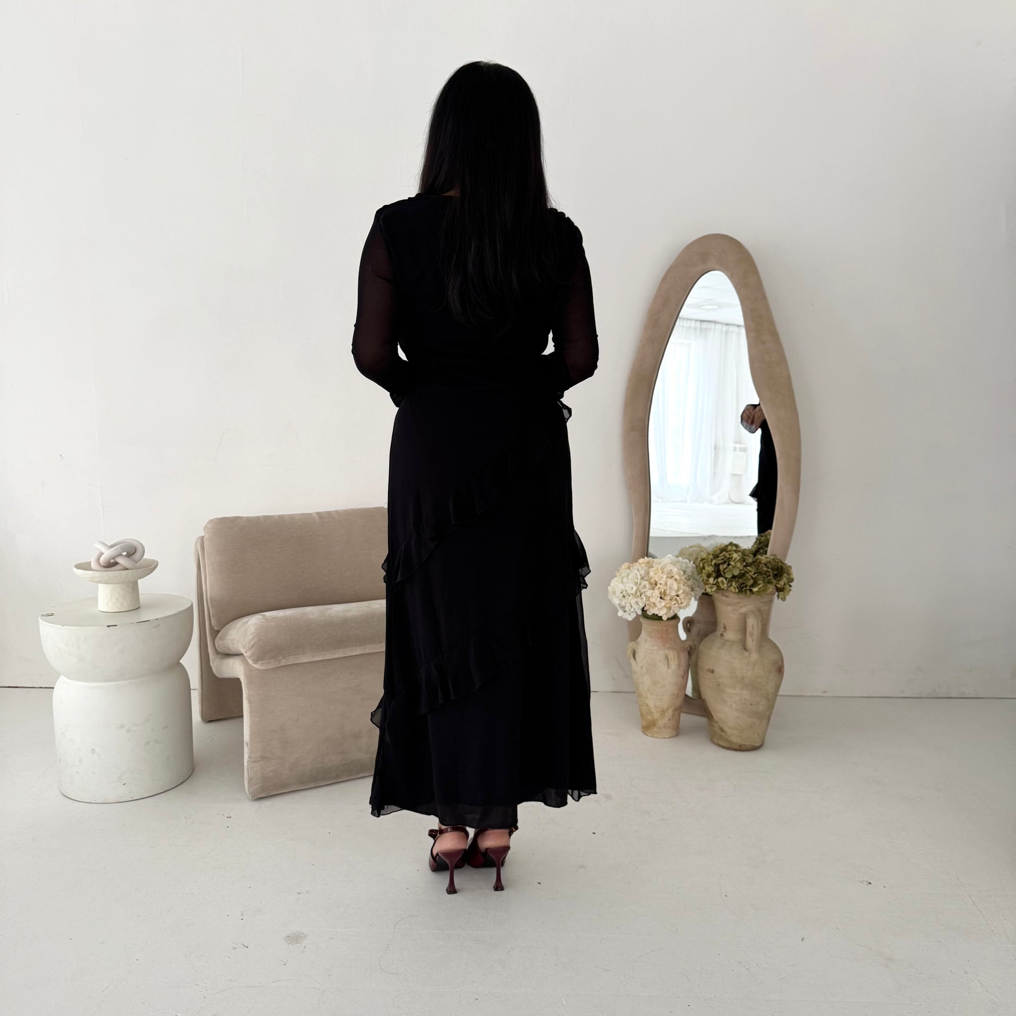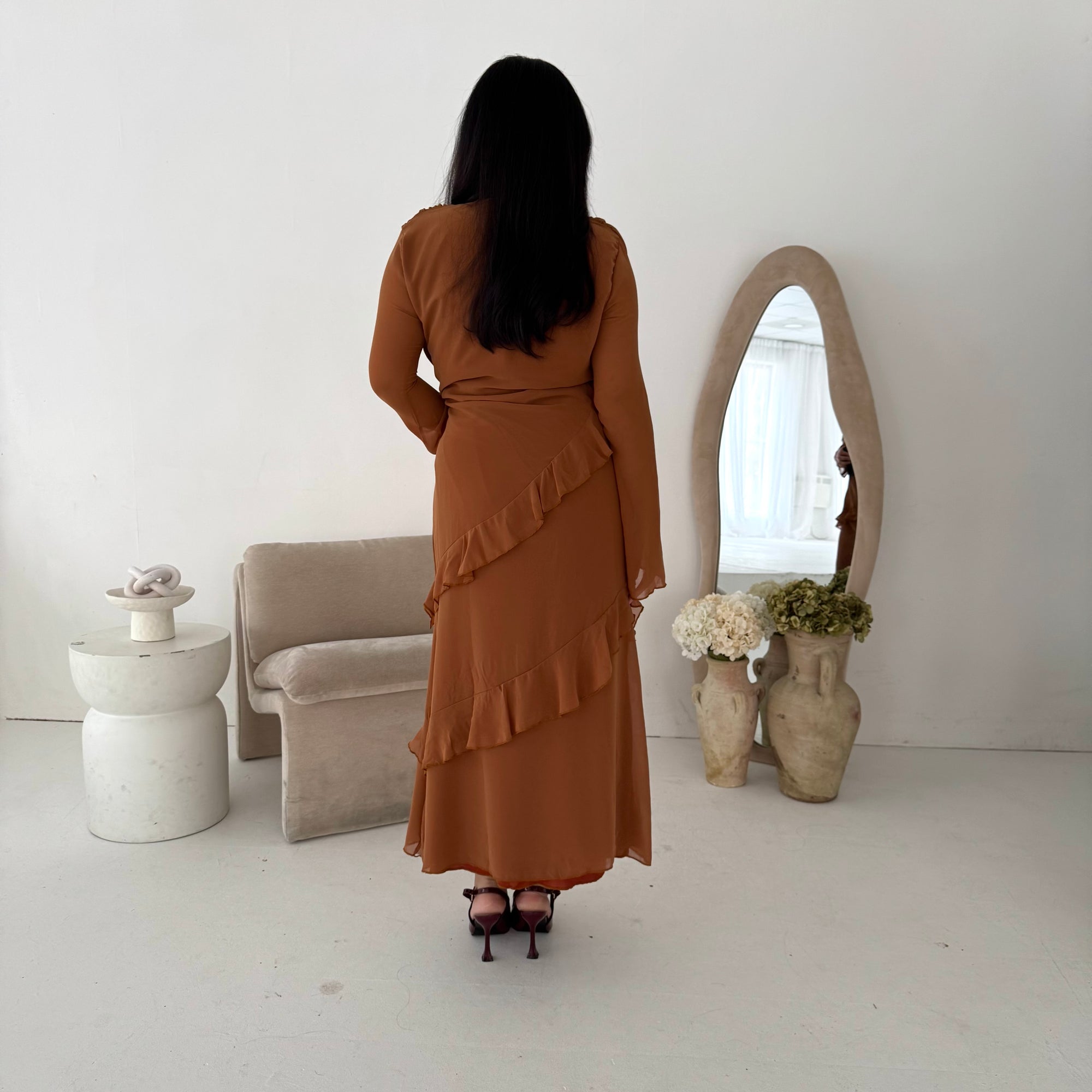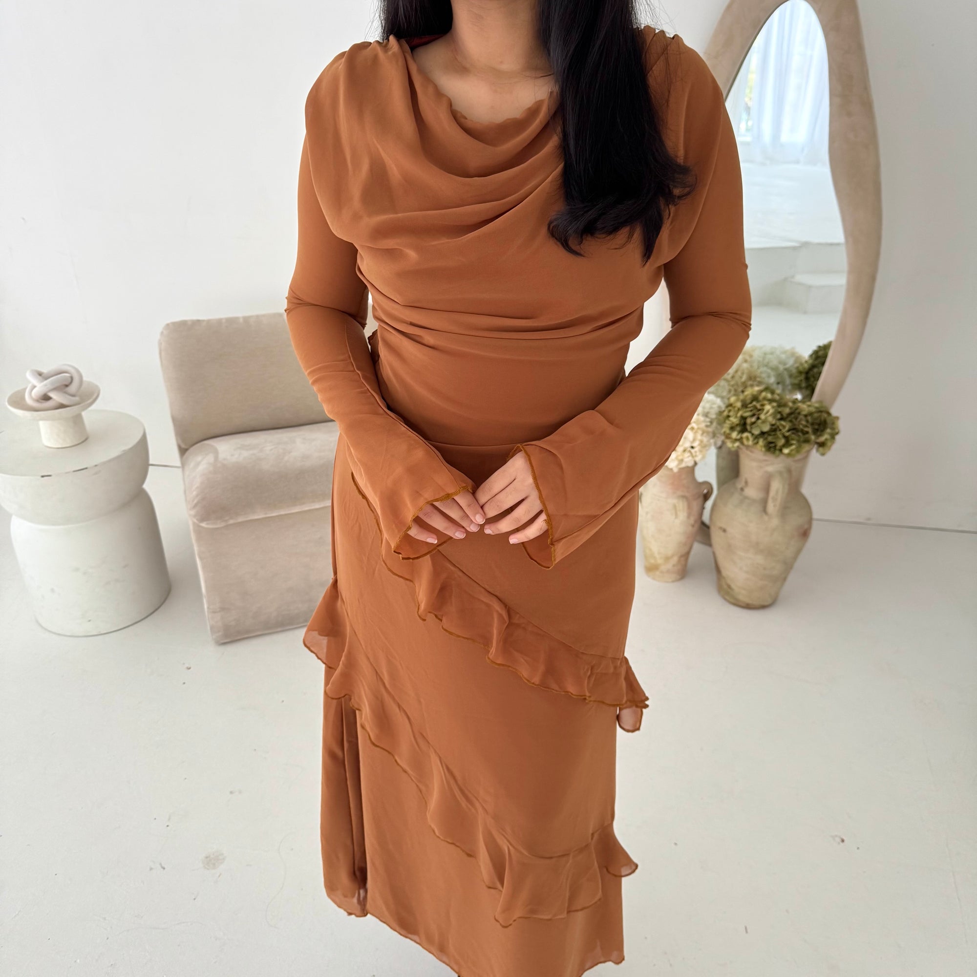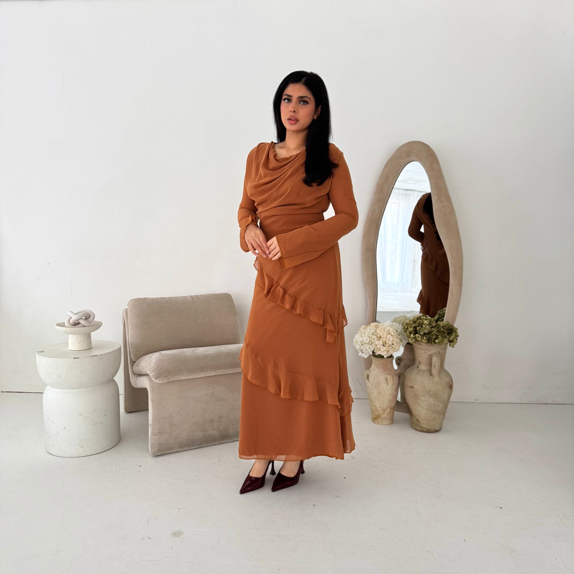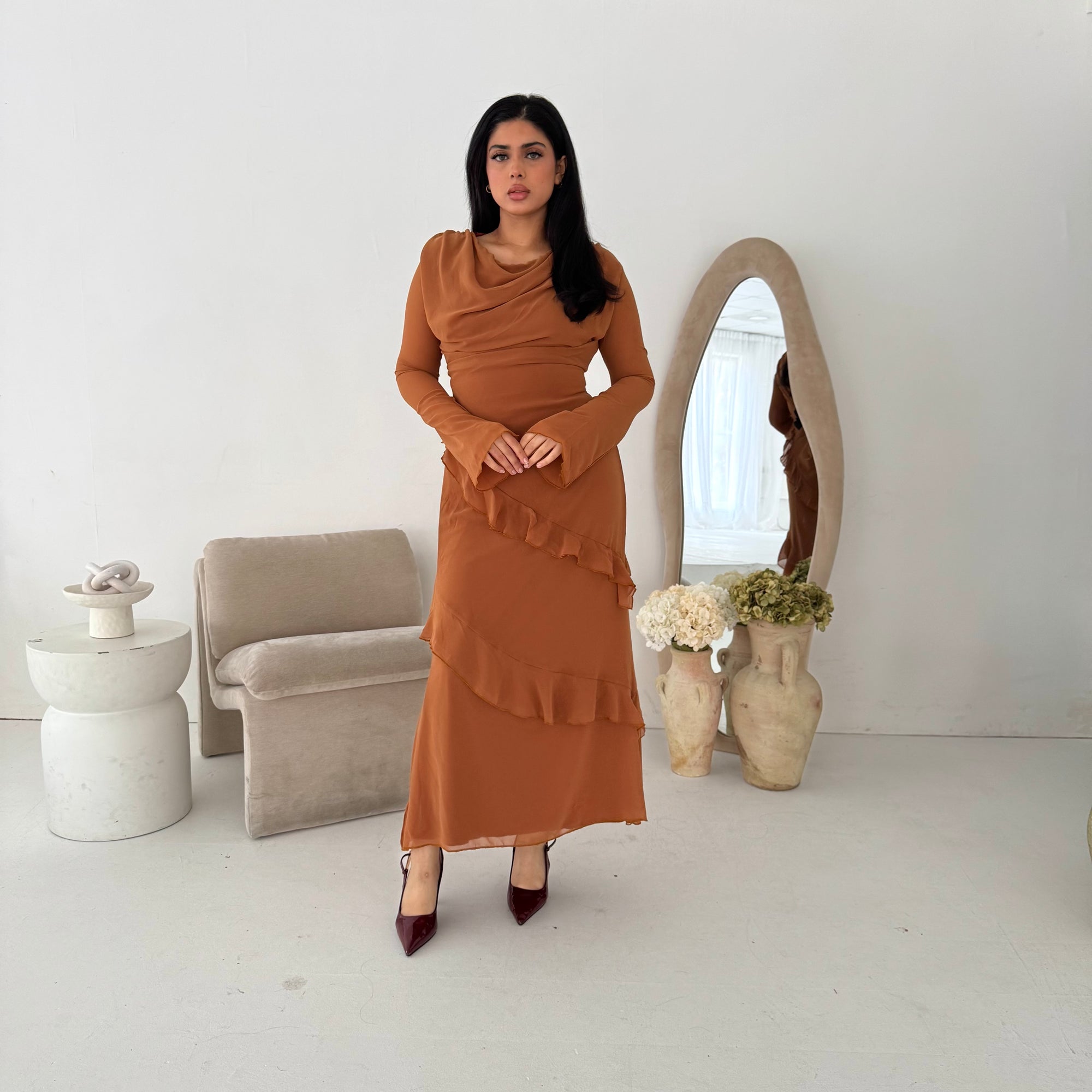 Eila Cinnamon Mesh Frill Detail Lined Dress