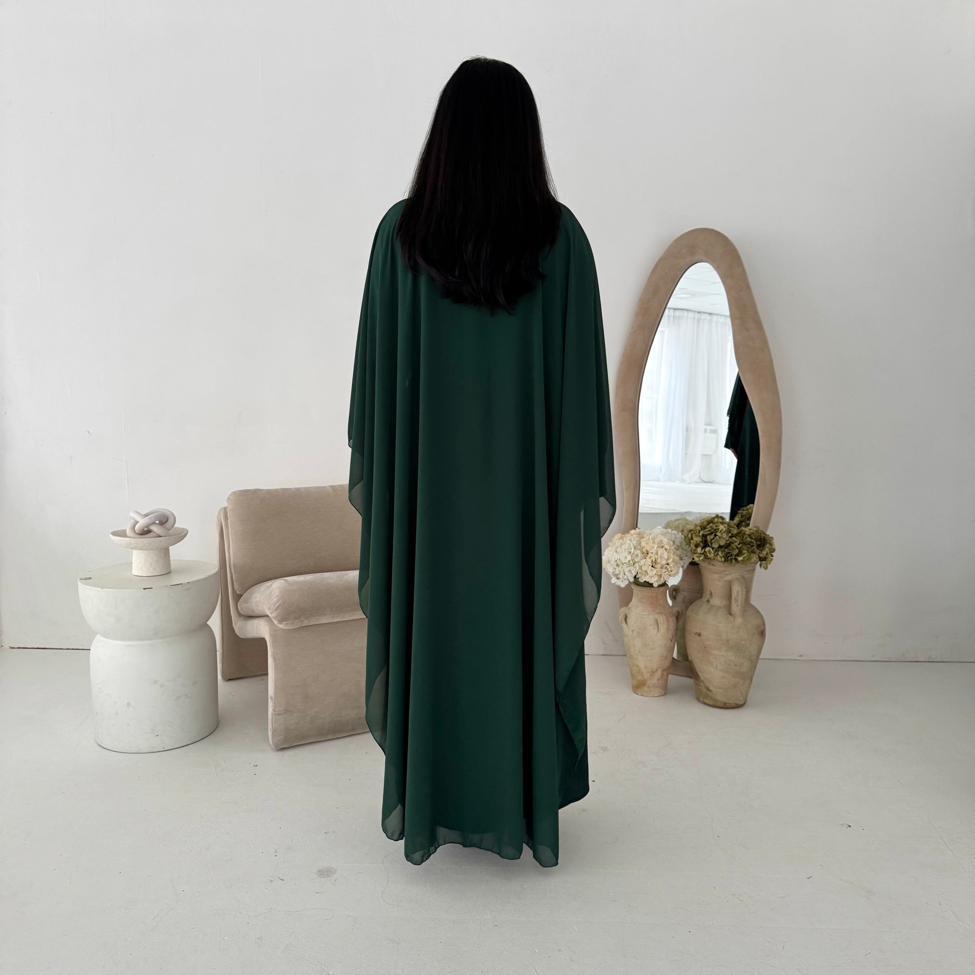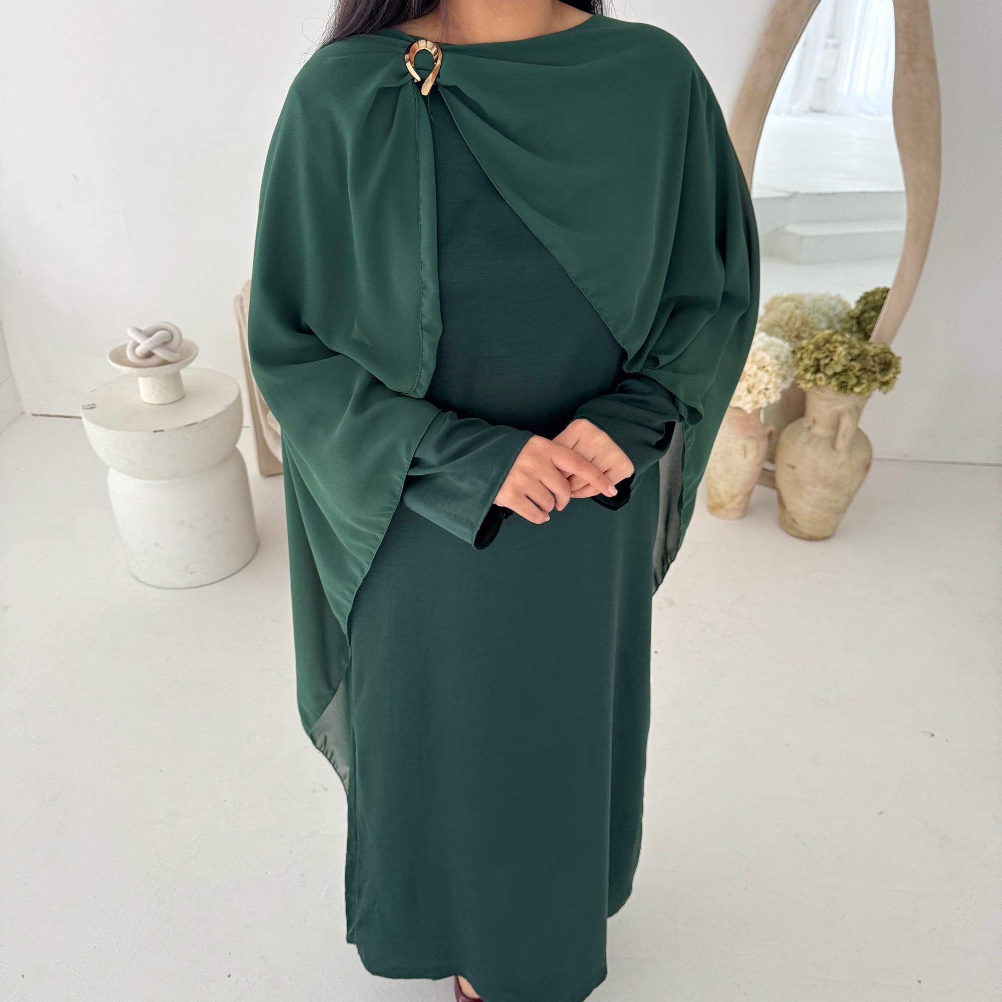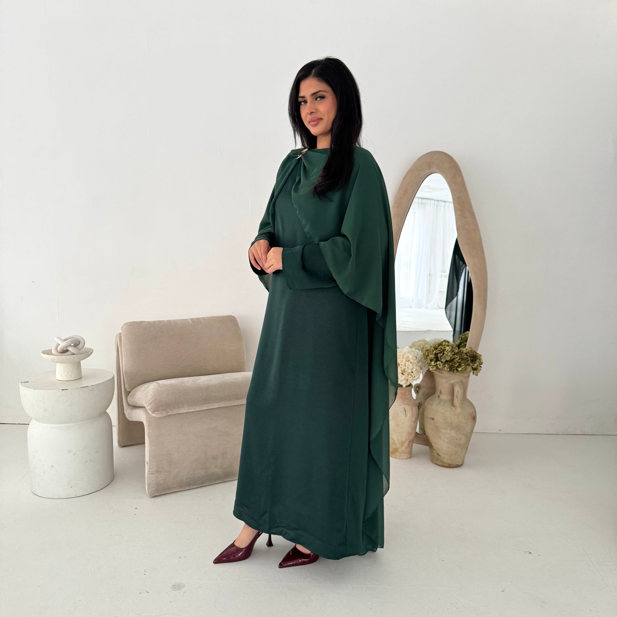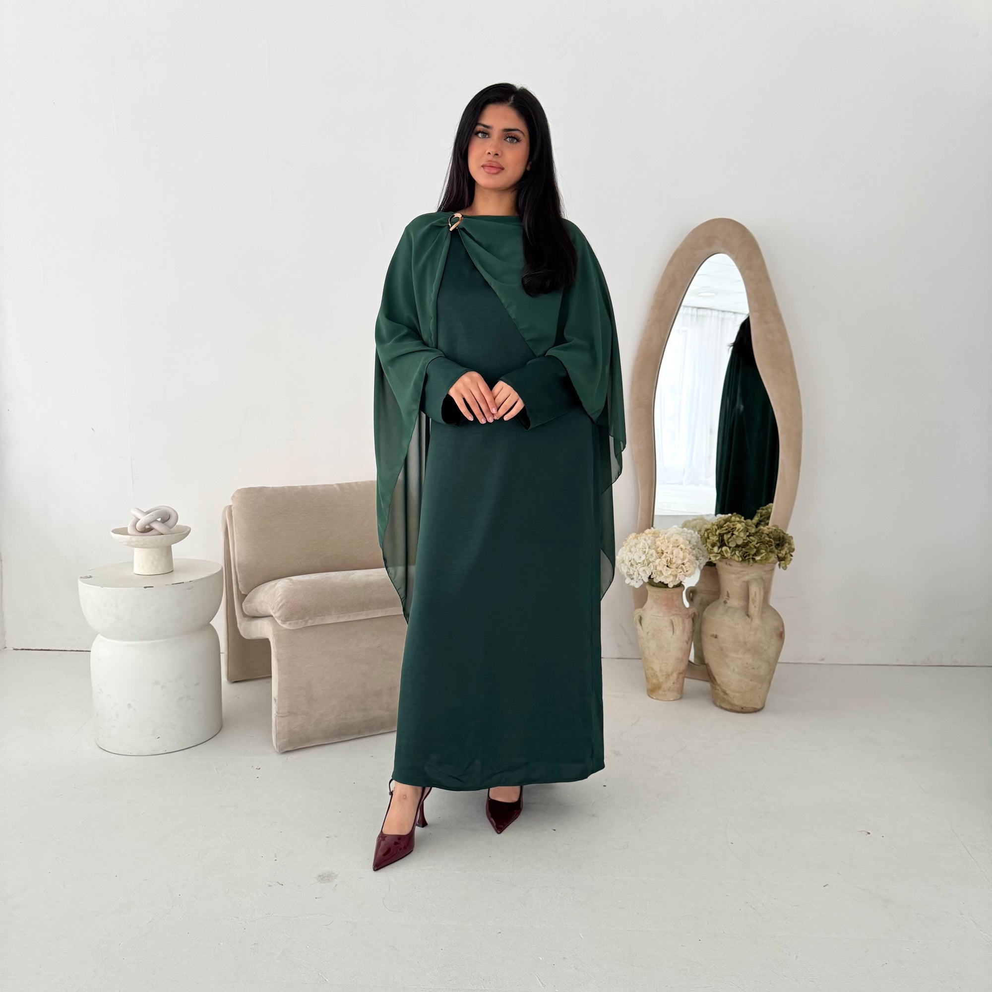 Roselle Emerald Green Gold Buckle Mesh Cape Dress