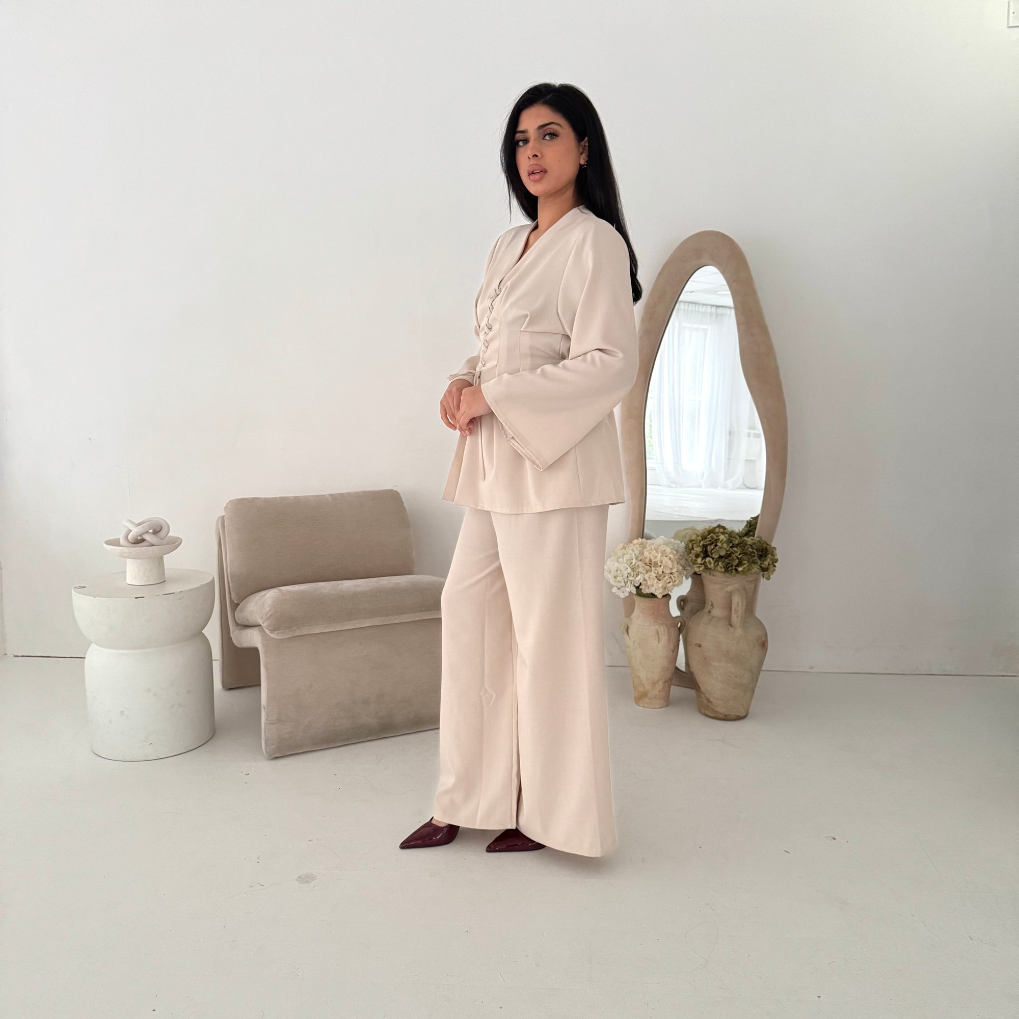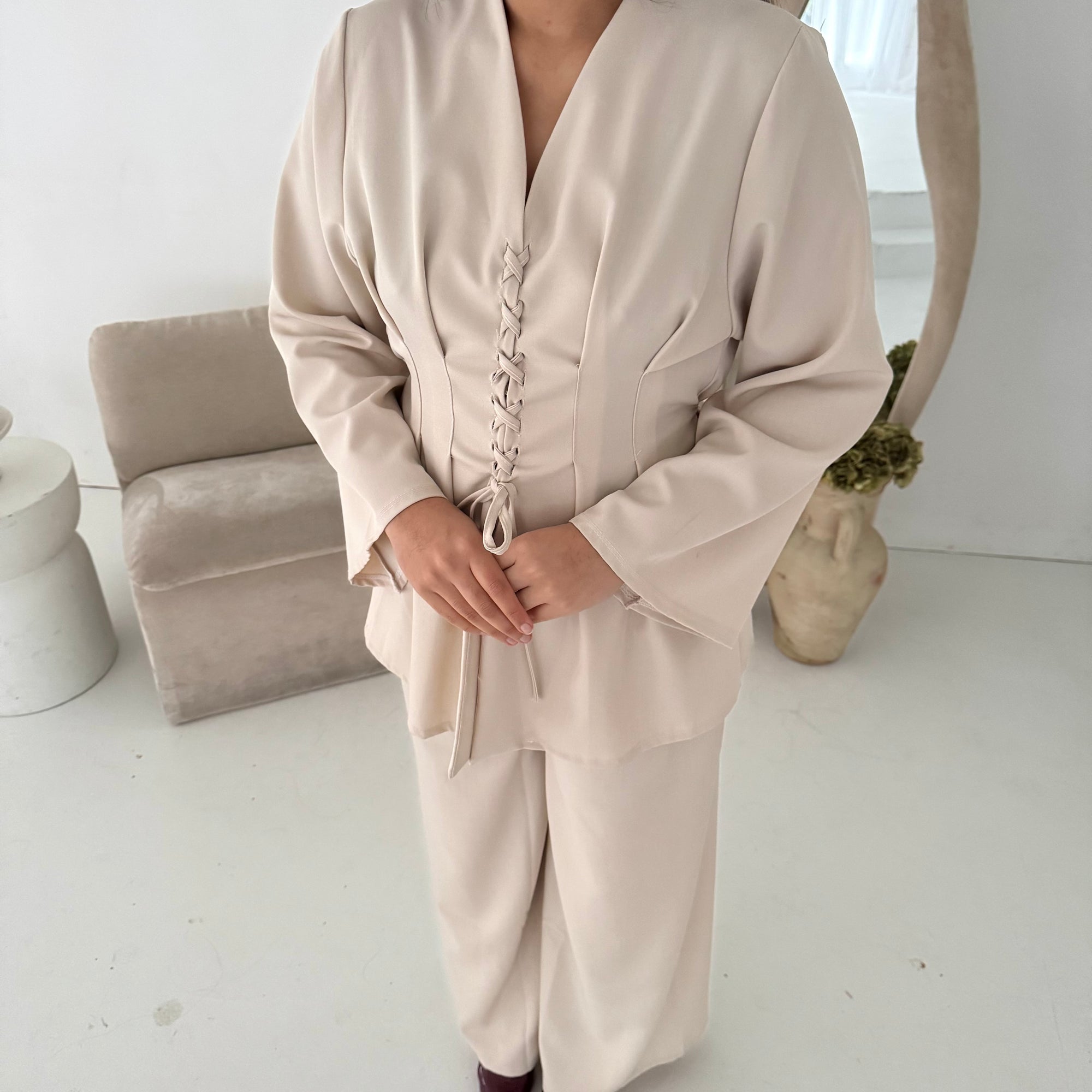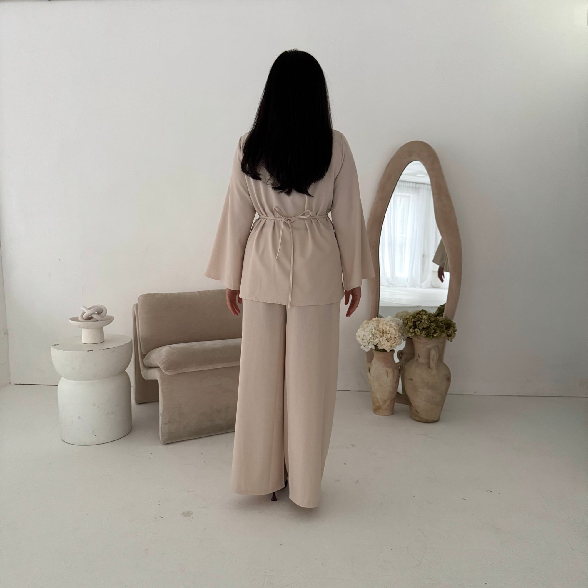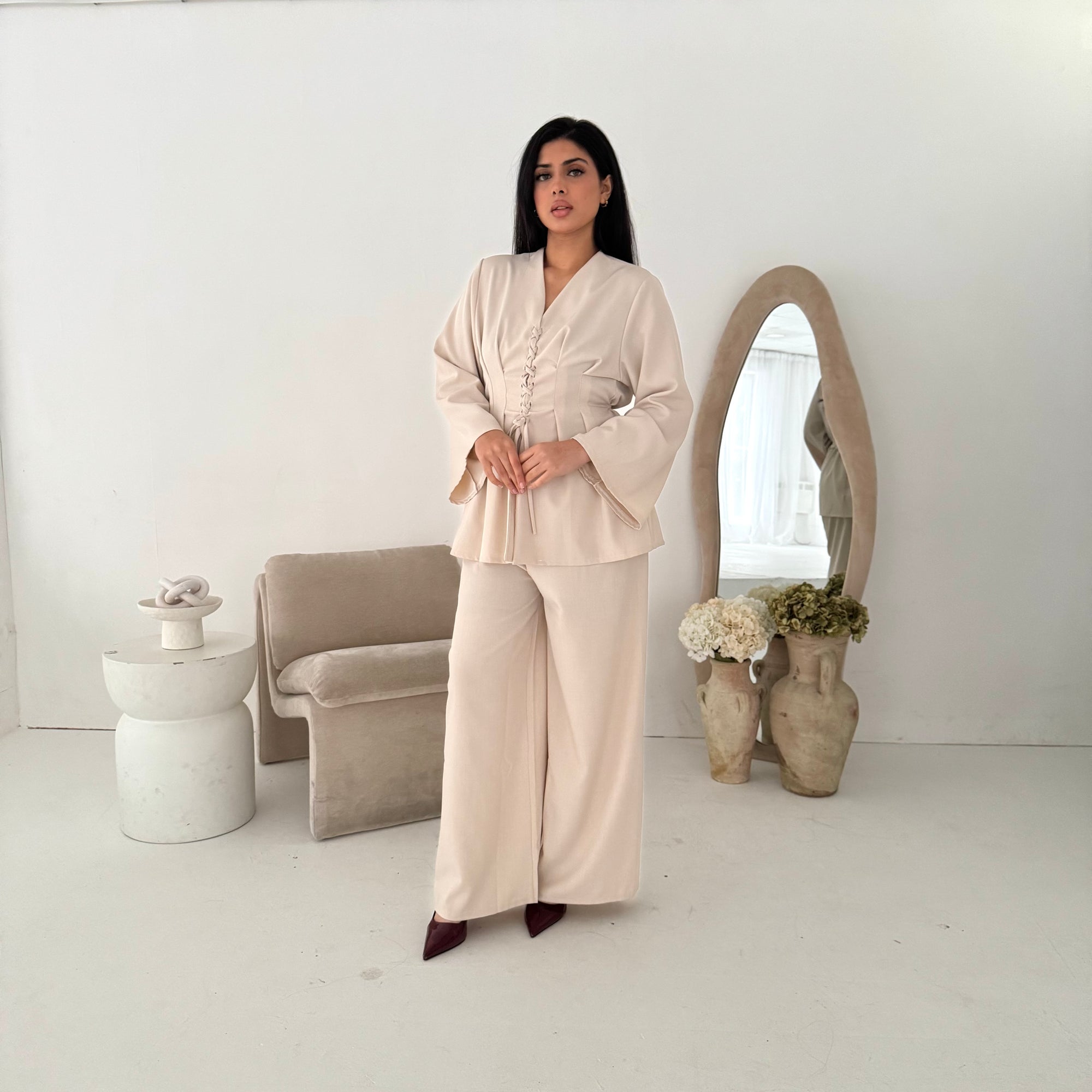 Anna Beige V Neck Pleated Front Tie Co Ord Set