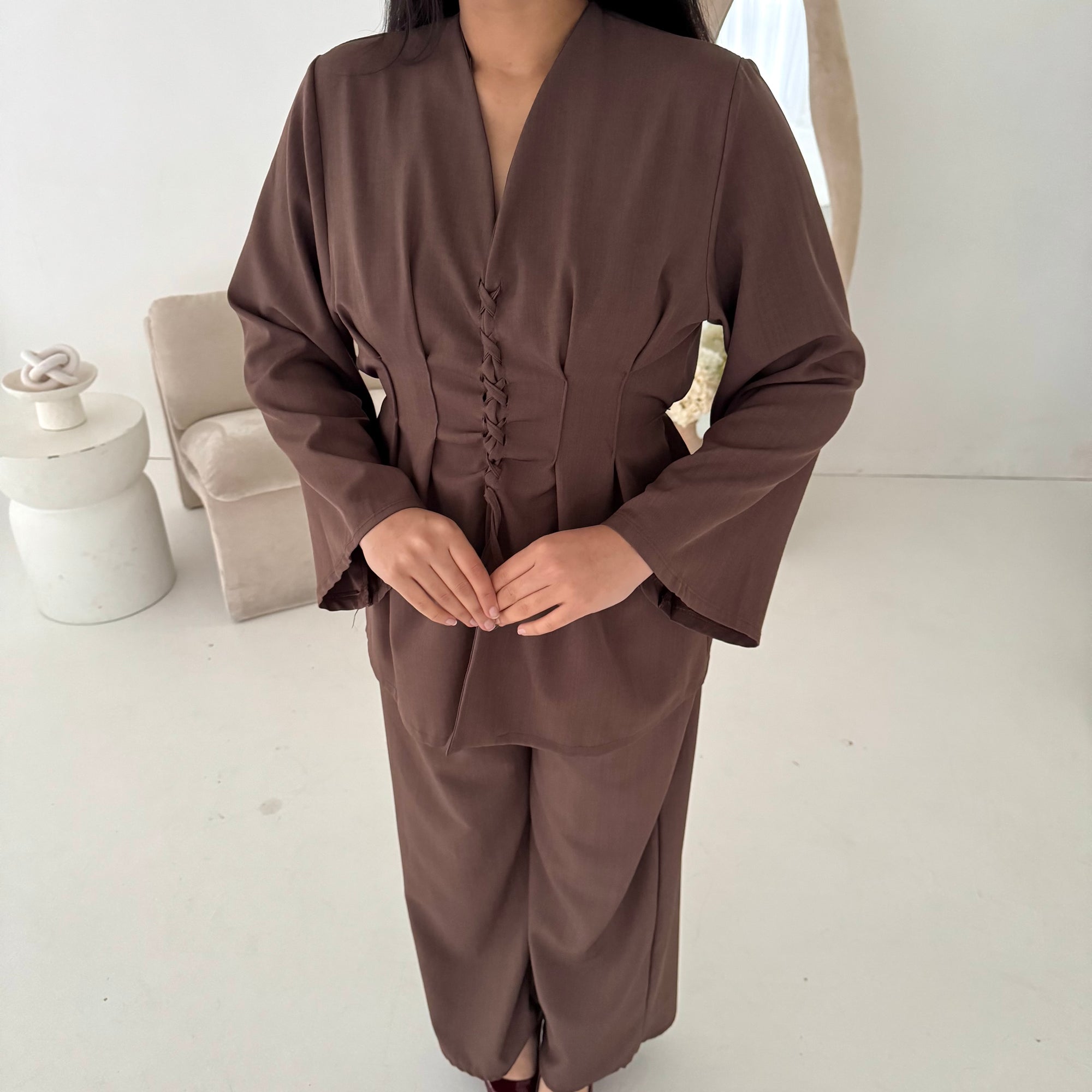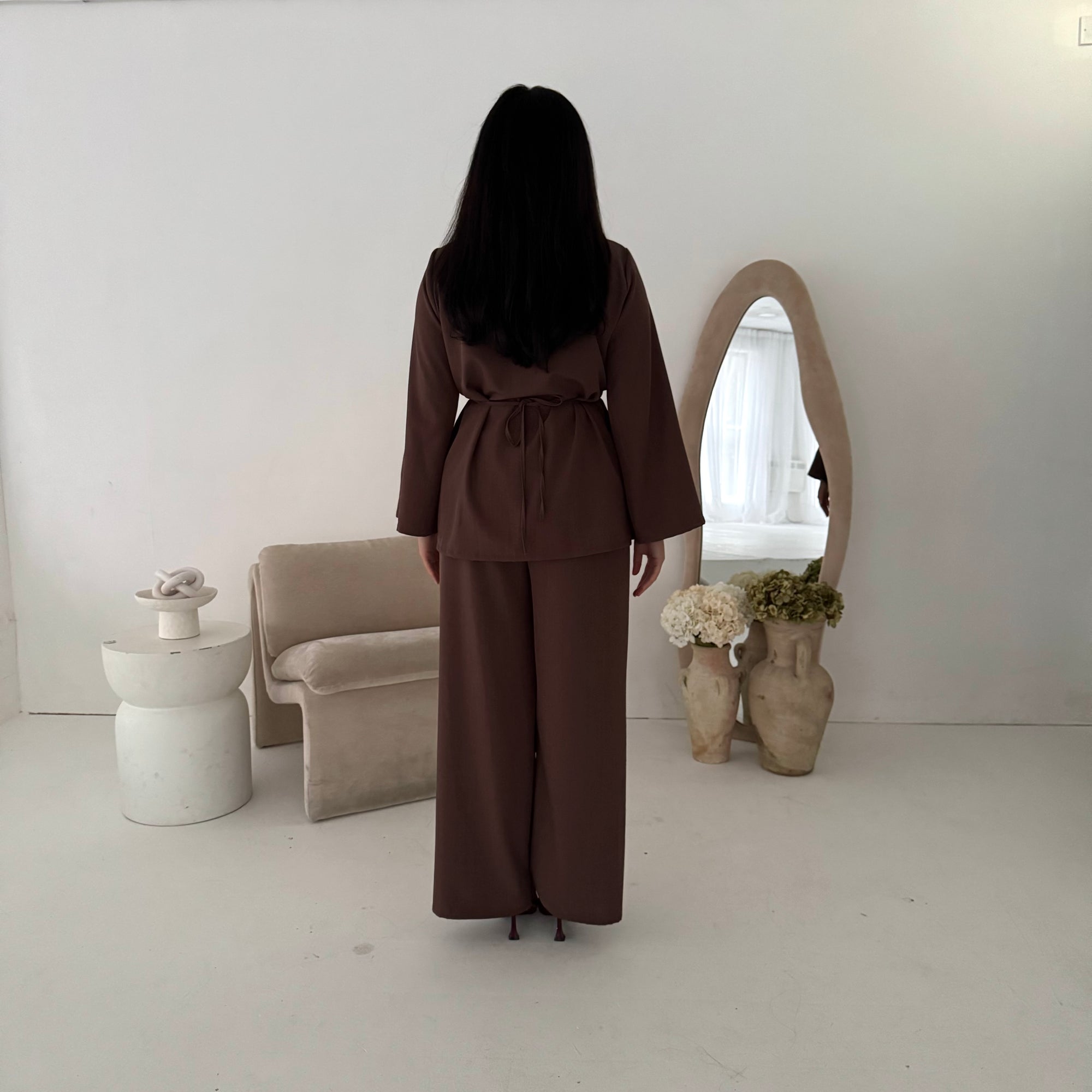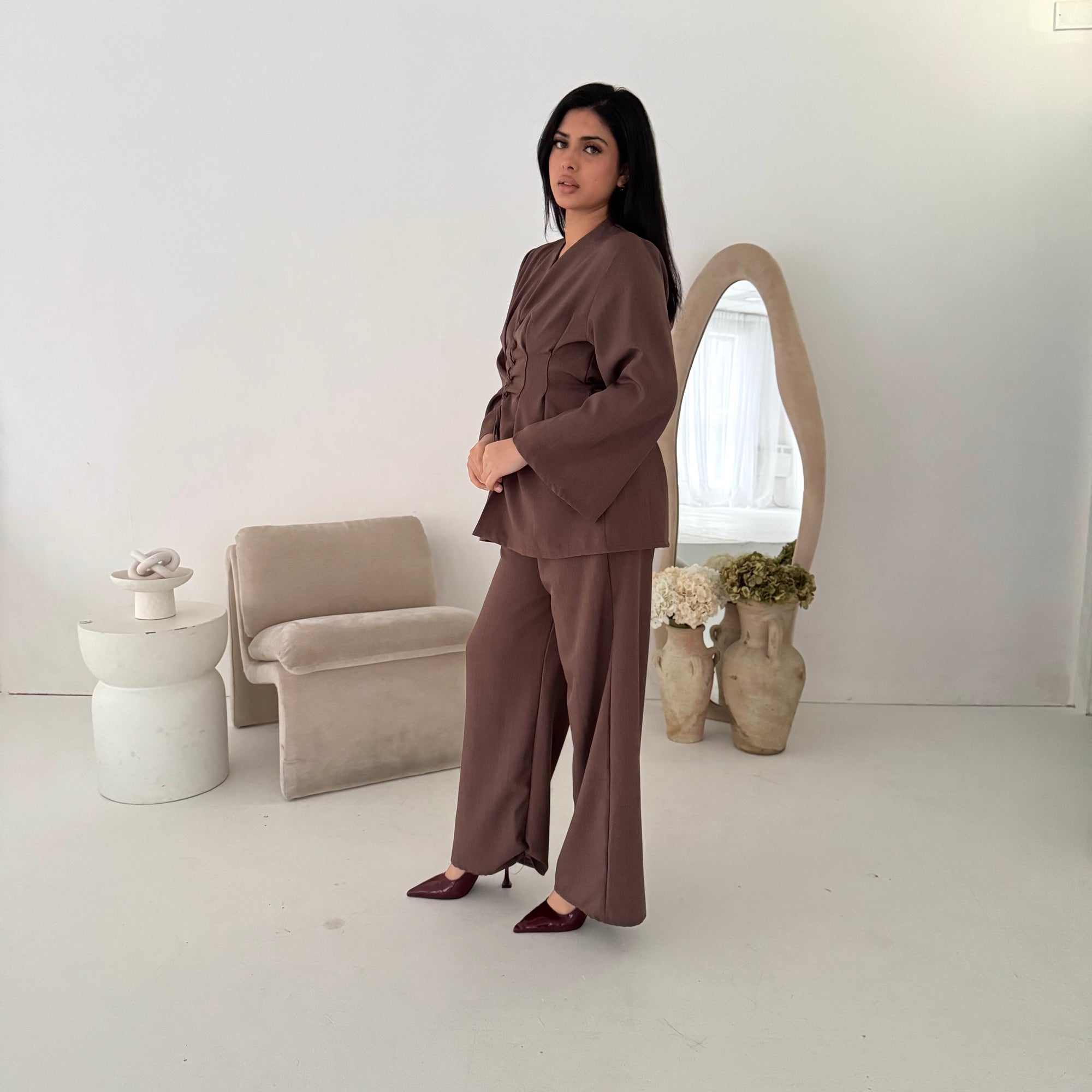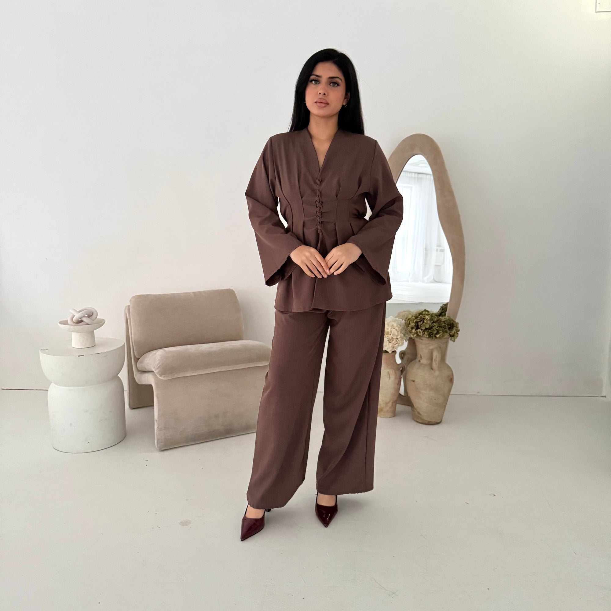 Anna Brown V Neck Pleated Front Tie Co Ord Set